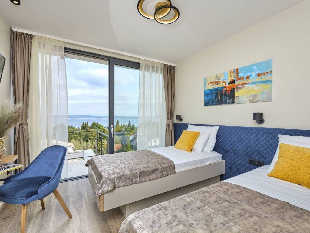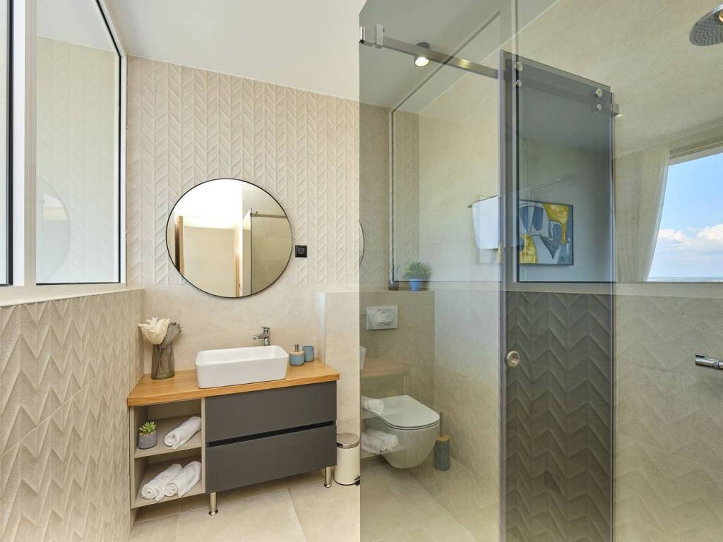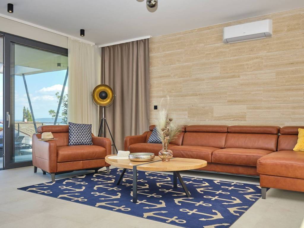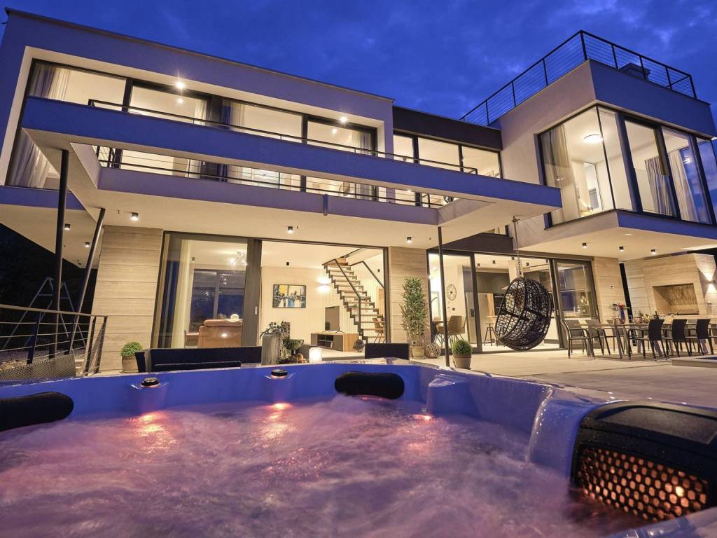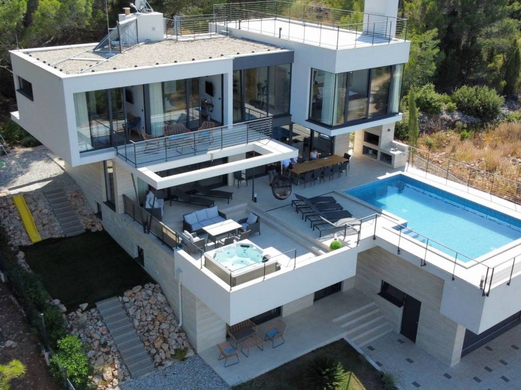 Eine prächtige moderne Villa in ruhiger Lage mit freiem Meerblick. Es wurde auf einem 773 m großen Grundstück erbaut und erstreckt sich über drei komfortable Etagen (Erdgeschoss, erster Stock und zweiter Stock).