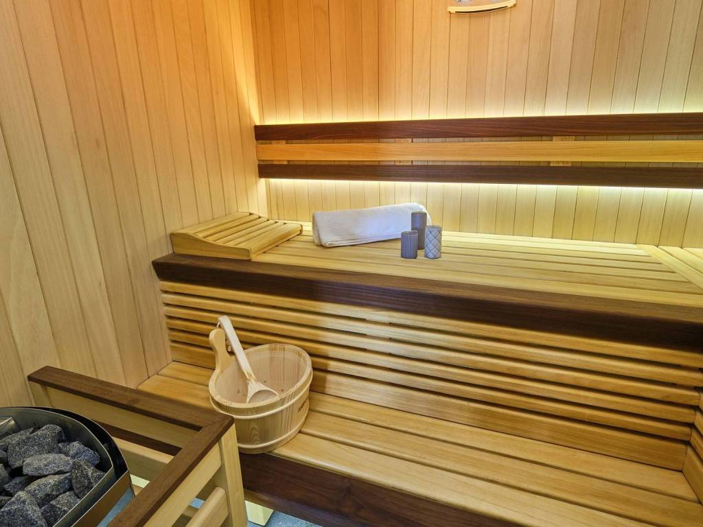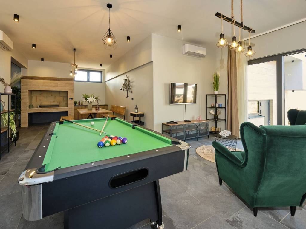 Im Erdgeschoss gibt es ein Zimmer mit eigenem Bad, eine Sauna mit zusätzlichem Bad, einen Fitnessraum, eine Taverne mit Grill und Billard, eine Waschküche und eine Garage.
