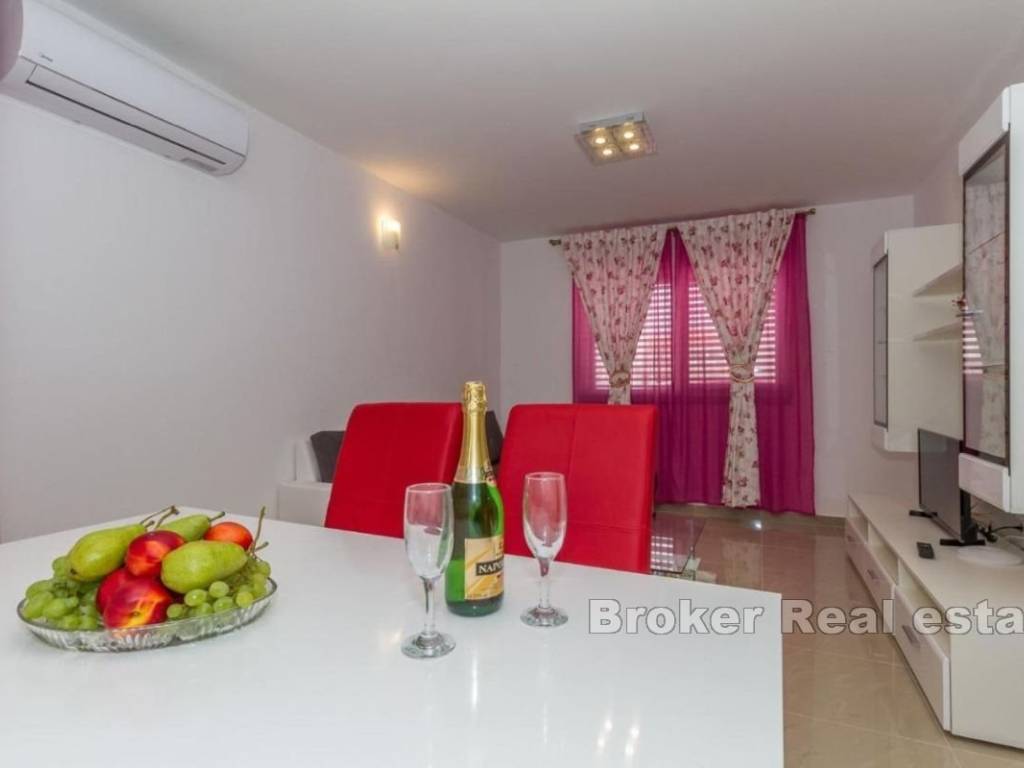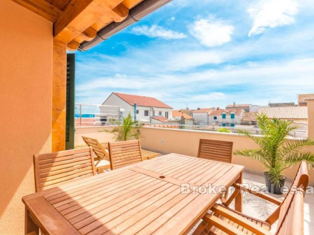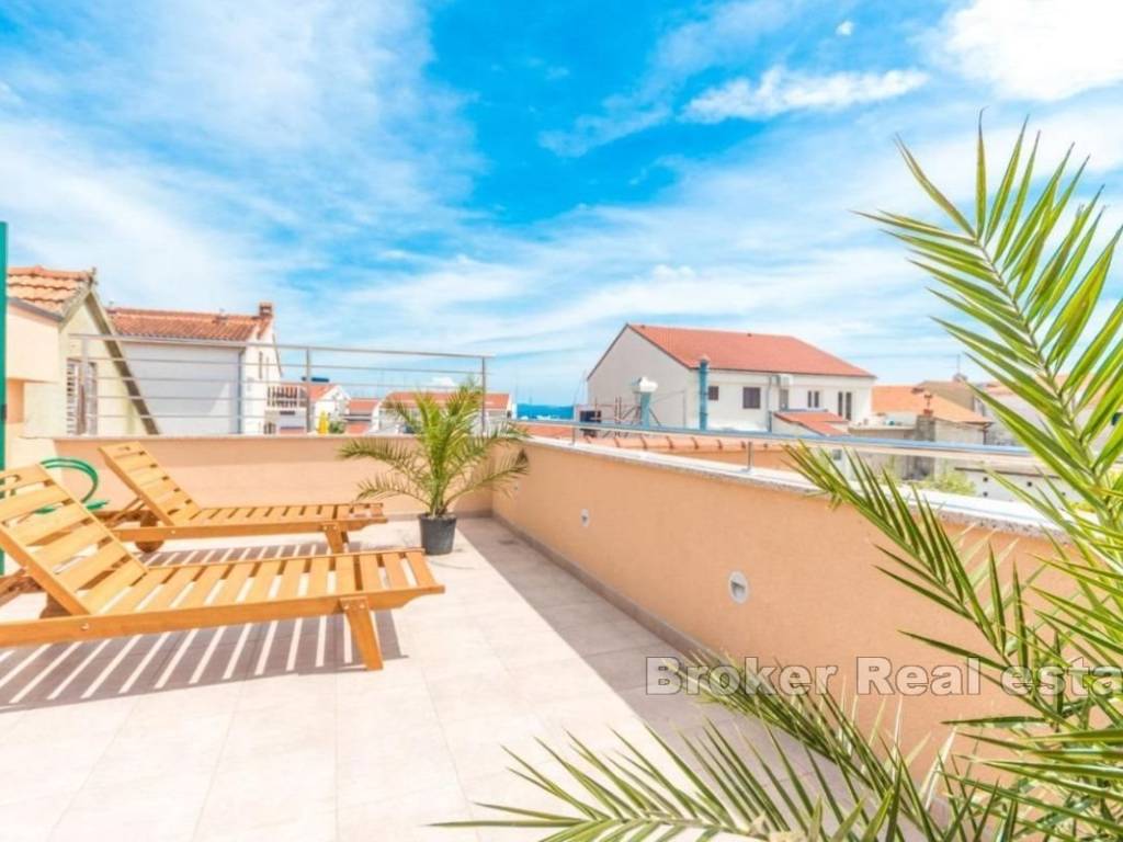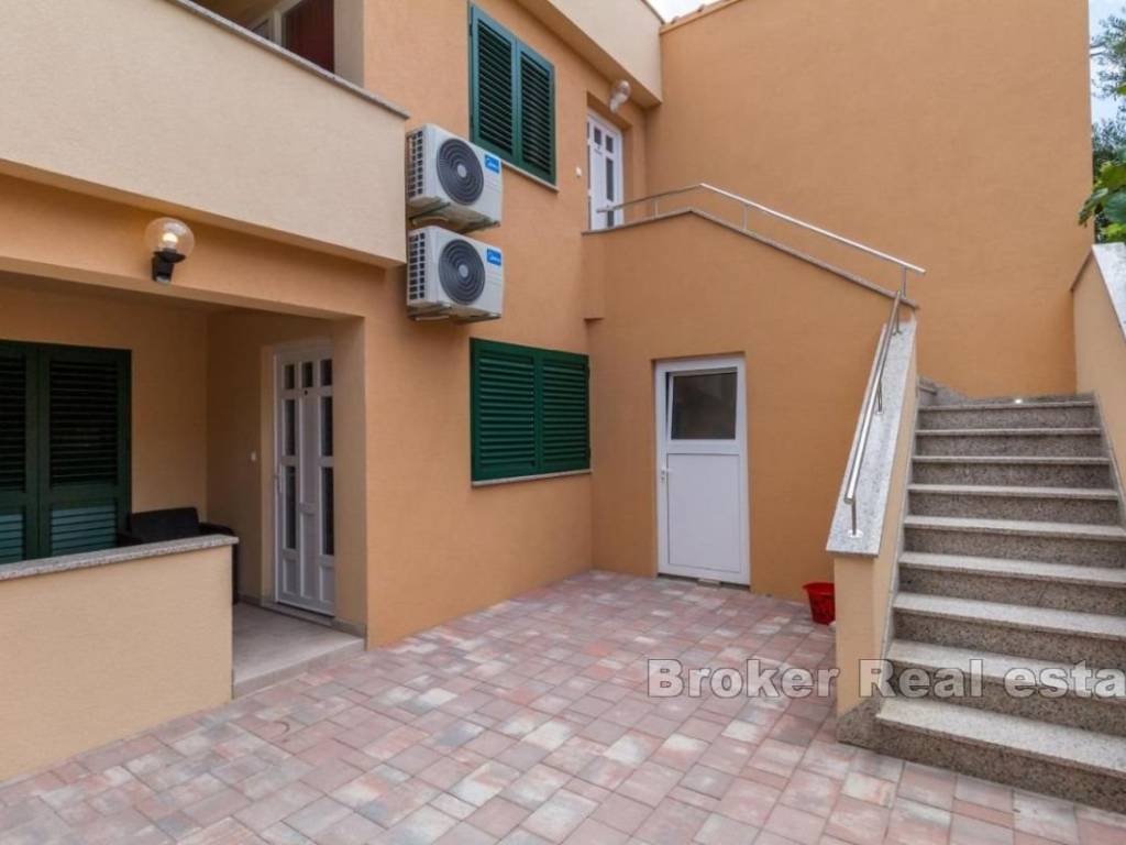 Zum Verkauf steht eine außergewöhnliche Immobilie im Zentrum der kleinen dalmatinischen Stadt Vodice. Das Haus wurde 2019 komplett adaptiert und renoviert. Alle Wohnungen sind komplett möbliert und im Tourismus geprüft. Es besteht aus 2 komfortablen Einzimmer-, 2 Zweizimmer- und Dreizimmerwohnungen im Obergeschoss des Hauses mit Zugang zu einer großen Terrasse mit Blick auf das Meer. Die Gesamtwohnfläche beträgt 330m2. Der Parkplatz befindet sich vor dem Eingang und bietet Platz für 4-5 Autos (eine Seltenheit für Immobilien im Zentrum). Aufteilung nach Etagen: Erdgeschoss: Wohnung mit 2 Schlafzimmern, Flur, Küche mit Wohnzimmer und Badezimmer