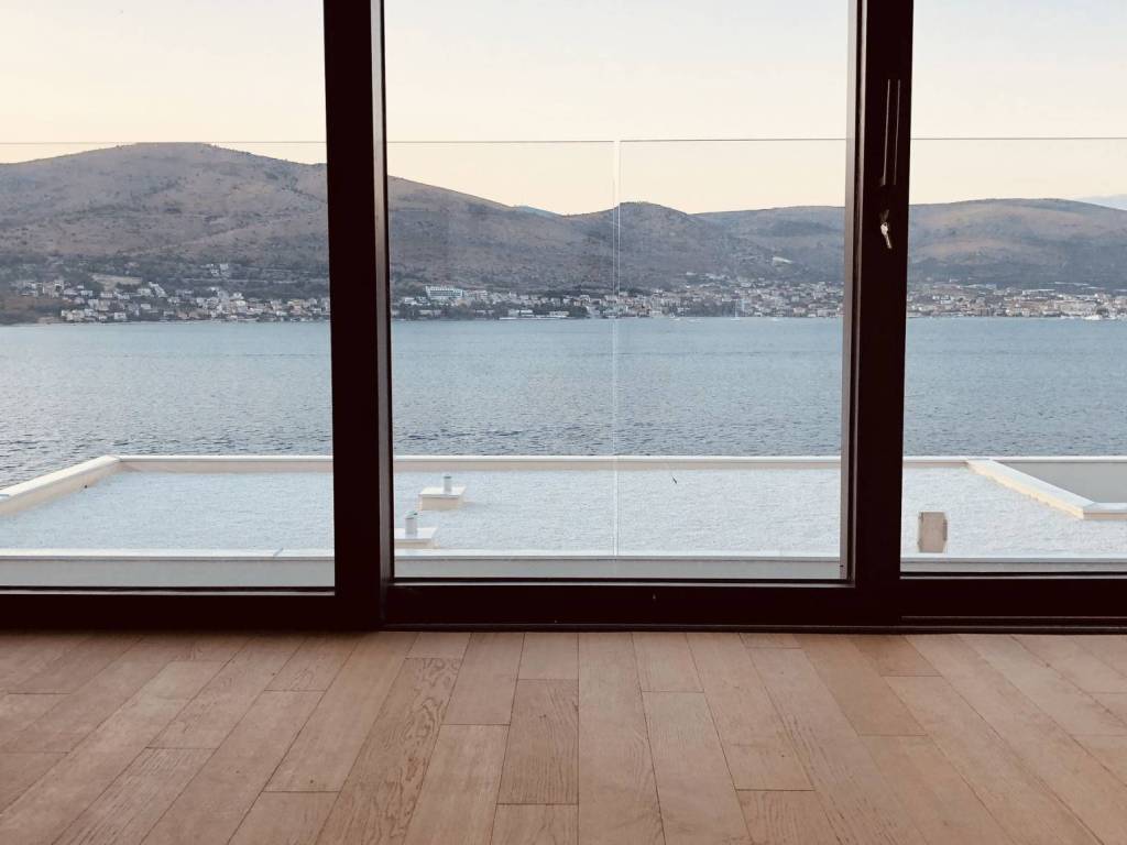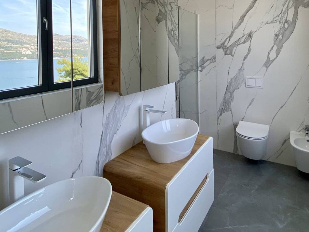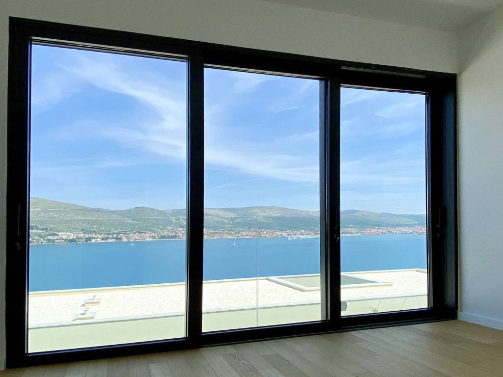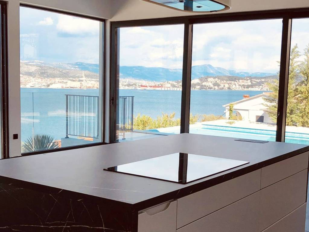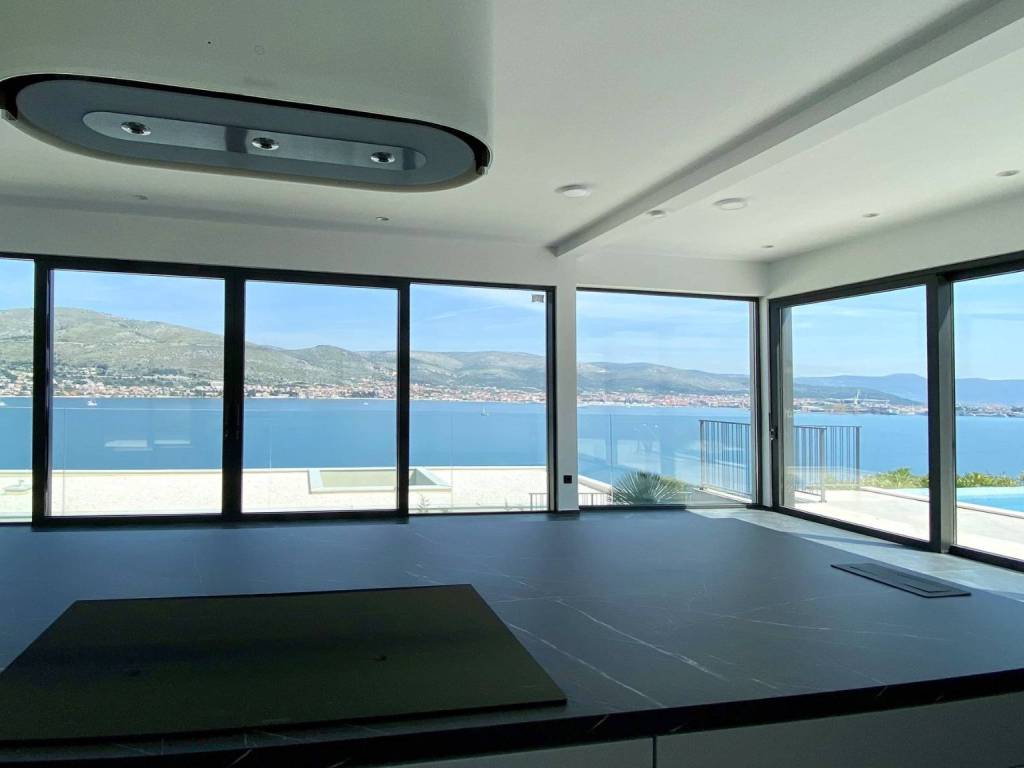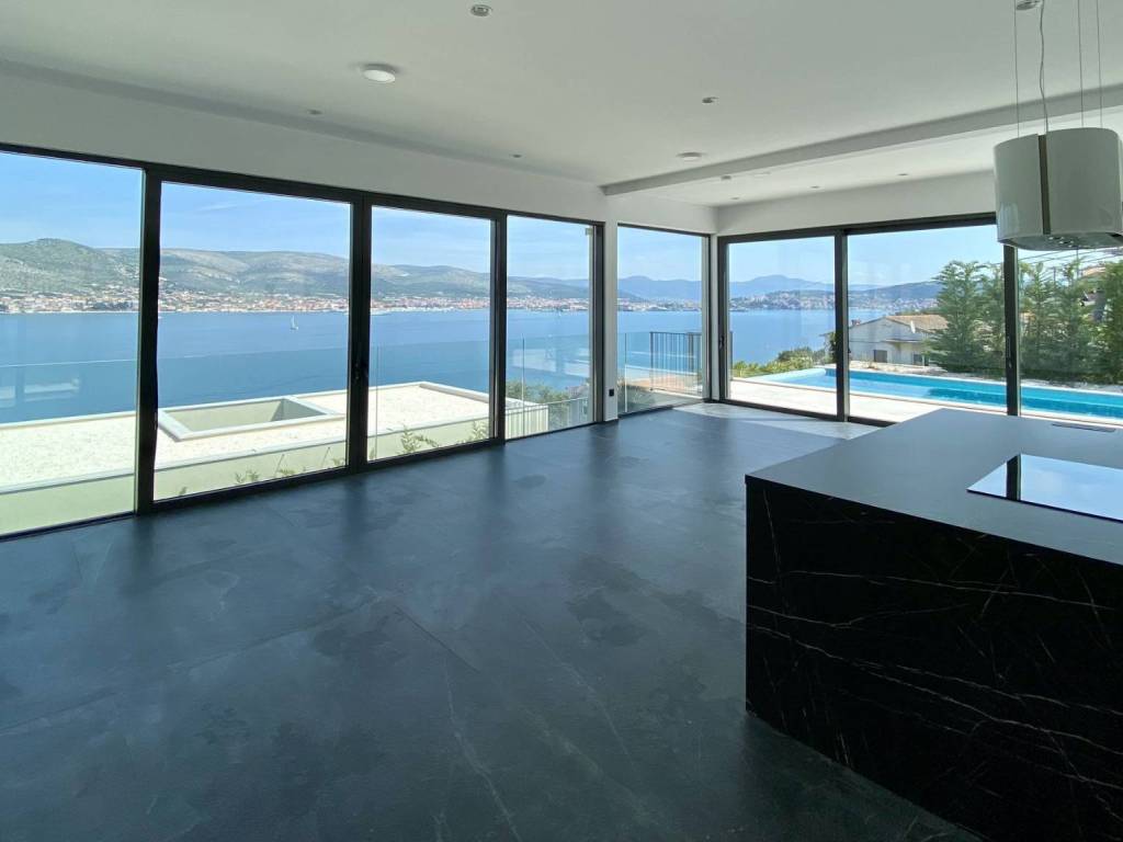 Zum Verkauf steht eine Villa mit Swimmingpool und offenem Meerblick. Es handelt sich um ein Anwesen auf der Insel Čiovo. Die Villa befindet sich auf einem Grundstück mit einer Gesamtgröße von 697 m2 und einer Wohnfläche von 315 m2. Im Erdgeschoss befinden sich drei Schlafzimmer, von denen jedes über ein eigenes Badezimmer verfügt. Jedes der Schlafzimmer hat direkten Zugang zur sonnigen Terrasse im Erdgeschoss. Im zweiten Stock, dem ersten Stock, gibt es ein weiteres Schlafzimmer und Badezimmer, ein Esszimmer und ein Wohnzimmer. Der Essbereich hat insgesamt 63 m2 und ist beidseitig verglast, mit offener Küche. Das Wohnzimmer hat direkten Zugang zu einer großzügigen Terrasse mit einem Essbereich im Freien und einem großen beheizten Swimmingpool. Beim Bau dieser Villa wurden die hochwertigsten Materialien verwendet. Ein durchdachtes Begrünungskonzept mit bezaubernder Beleuchtung rundet die moderne Architektur des Gebäudes ab. Die Villa wurde im Jahr 2021 gebaut. Sie ist nur 100 m vom Meer entfernt.