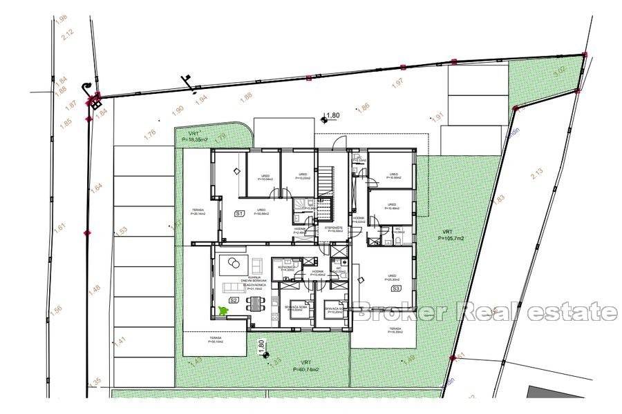 Die Wohnung besteht aus einem Eingang, Flur, Treppenhaus, Schlafzimmer 1, Schlafzimmer 2, Schlafzimmer 3 mit Bad, Bad, WC, Küche mit Esszimmer, Wohnzimmer, Terrasse von 31,98 m2 und Dachterrasse von 52,58 m2.
