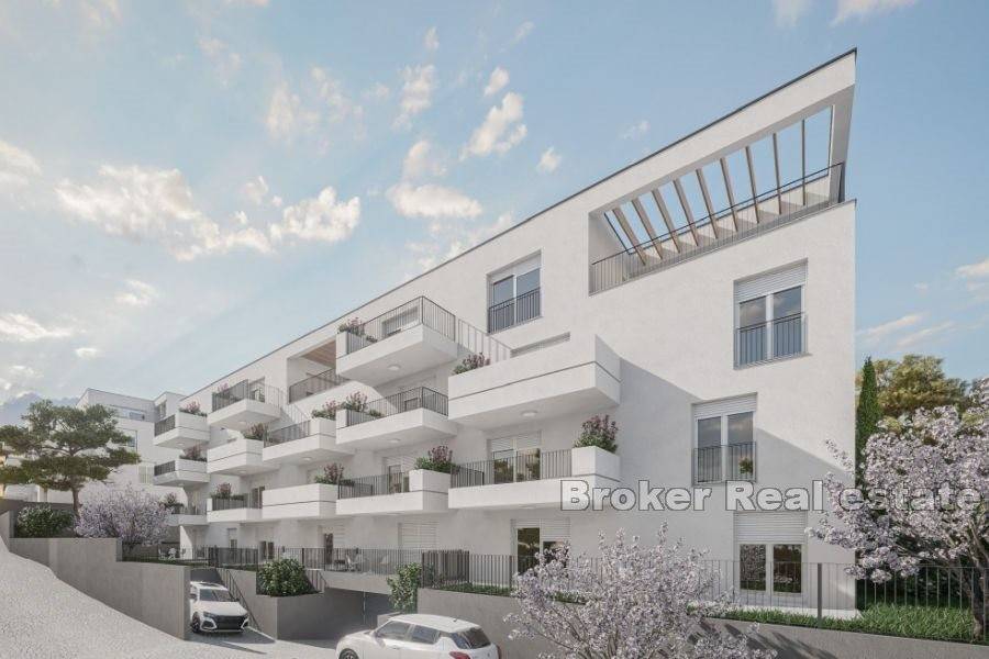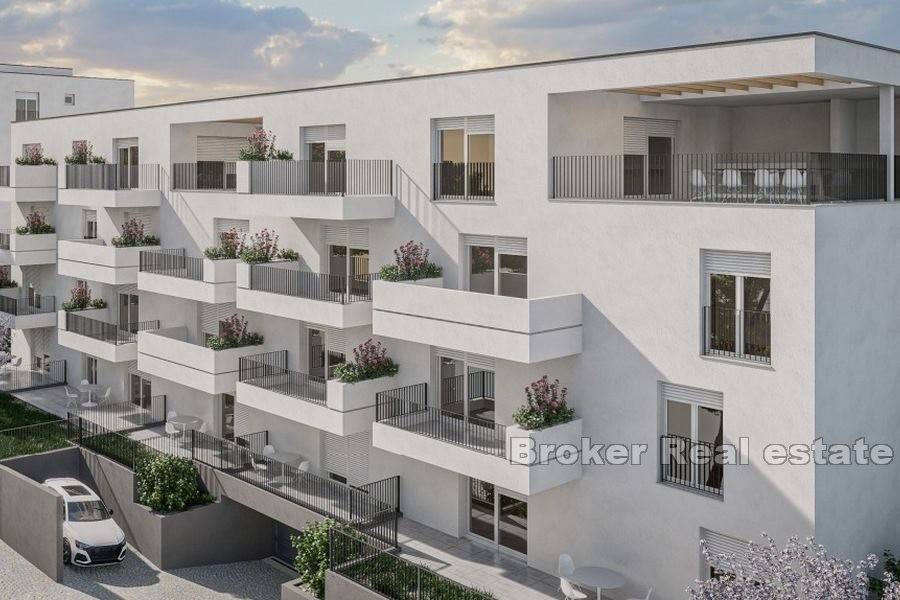 Das Gebäude wird insgesamt fünf Stockwerke haben. Im Untergeschoss entstehen Garagenstellplätze und Lagerräume. In den nächsten drei Etagen werden fünf Wohnungen untergebracht, während es im letzten Stockwerk nur noch zwei großzügige Wohnungen geben wird. Auf jeder Etage wird es identische Wohnungen geben und das Angebot umfasst Ein-Zimmer-Wohnungen mit einem Badezimmer und Zwei-Zimmer-Wohnungen mit zwei Badezimmern. Zusätzlich zum Innenraum verfügen die Wohnungen über einen Zugang zu einer überdachten oder nicht überdachten Terrasse oder einem Balkon. In der obersten Etage entstehen zwei Dreizimmerwohnungen mit drei Badezimmern und einer Toilette sowie ein komfortabler Wohnbereich und eine Terrasse oder ein Balkon. Jede Wohnung wird über eine Waschküche und einen Abstellraum verfügen und der Wohnbereich wird nach Süden mit Blick auf das Meer ausgerichtet sein.