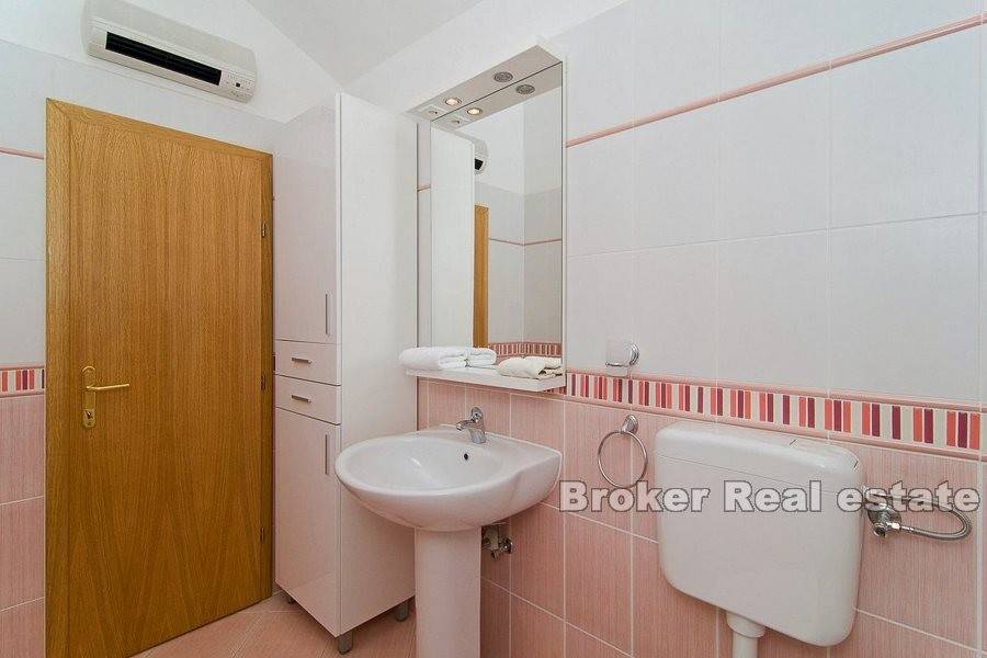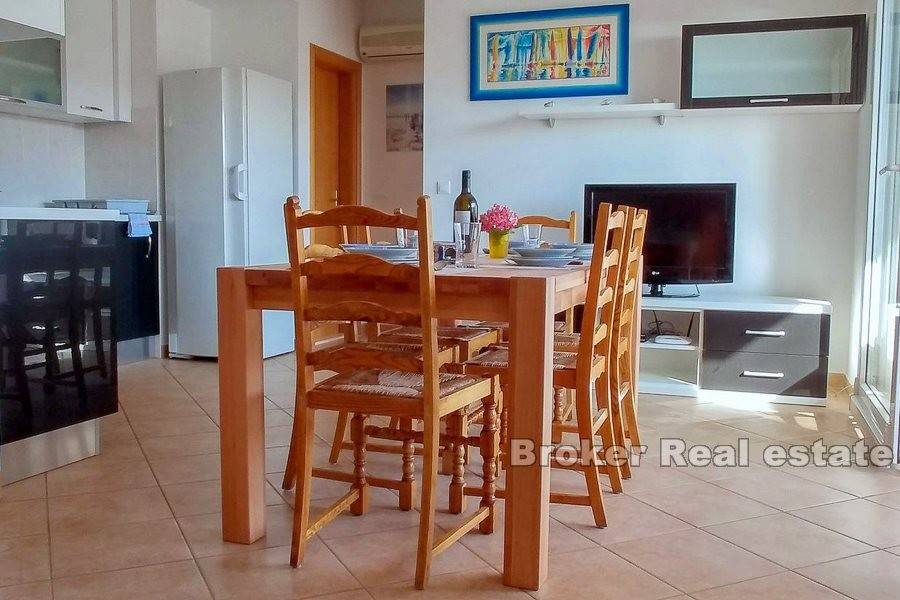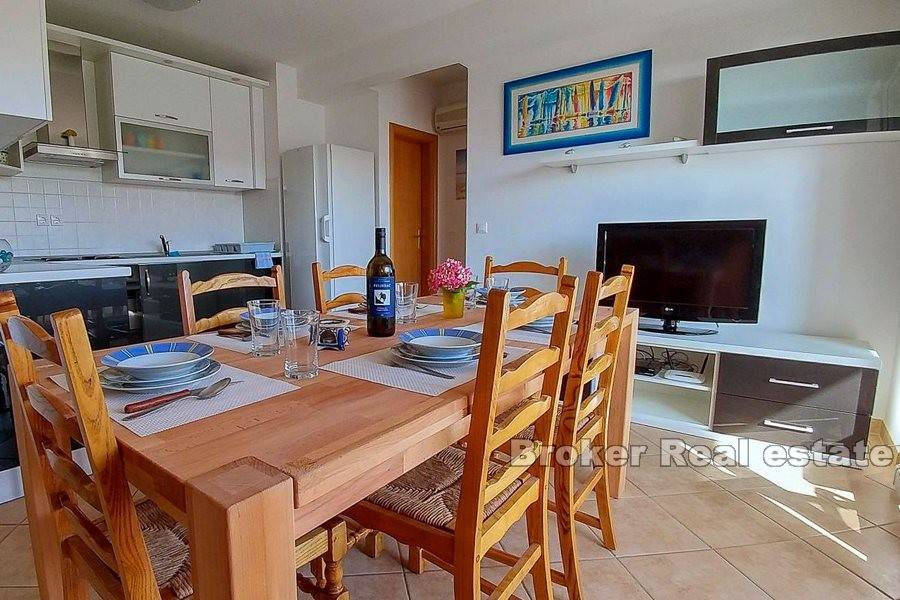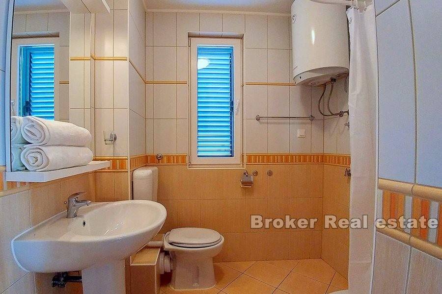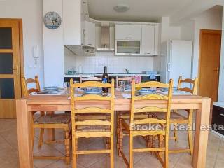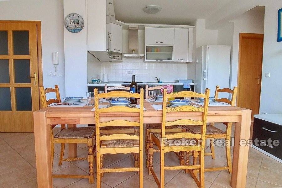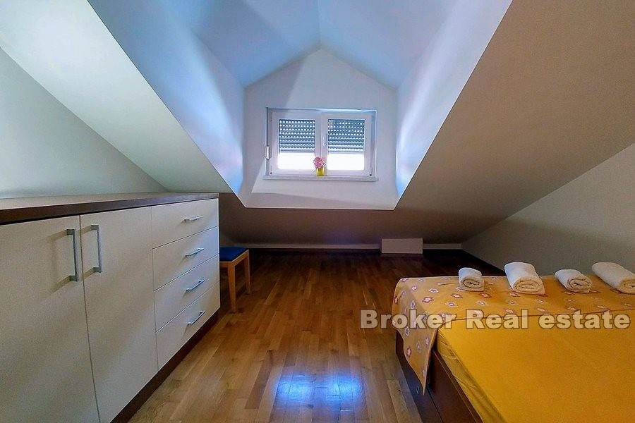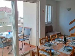 Zum Verkauf steht eine möblierte Wohnung auf zwei Etagen, in der Stadt Makarska. Die Wohnung befindet sich im zweiten und dritten Stock einer Stadtvilla mit insgesamt acht Wohnungen, mit eigenem Außenstellplatz und einem Stellplatz in der Garage. Die Wohnung verfügt über drei Schlafzimmer, einen separaten Eingang, Balkone und Badezimmer auf beiden Etagen und ein offenes Wohnzimmer mit Küche und Essbereich. Die Entfernung zum Meer beträgt ca. 630 m mit dem Auto oder zu Fuß. Der halbe Weg zum Strand führt durch einen Kiefernwald. Unterhalb der Autobahn verläuft ein Fußgängerweg.