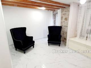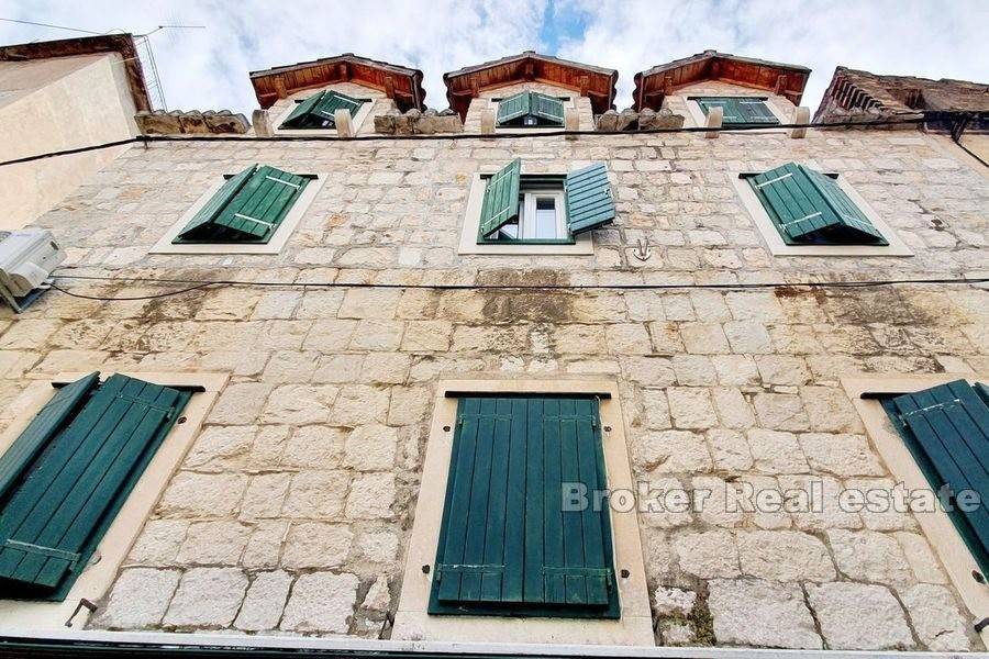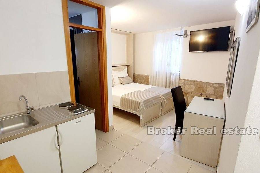 das Meer und der Diokletianpalast. Das Haus besteht aus fünf Wohneinheiten auf drei Etagen. Im ersten Stock gibt es eine Rezeption und zwei Schlafzimmer mit Badezimmern. Im zweiten Stock befinden sich zwei Schlafzimmer mit Badezimmern. In der obersten Etage, die über eine Außentreppe erreichbar ist, befinden sich zwei Studio-Apartments mit einer gemeinsamen Terrasse. Alle Einheiten sind komfortabel und luftig. Klimatisiert und voll ausgestattet.