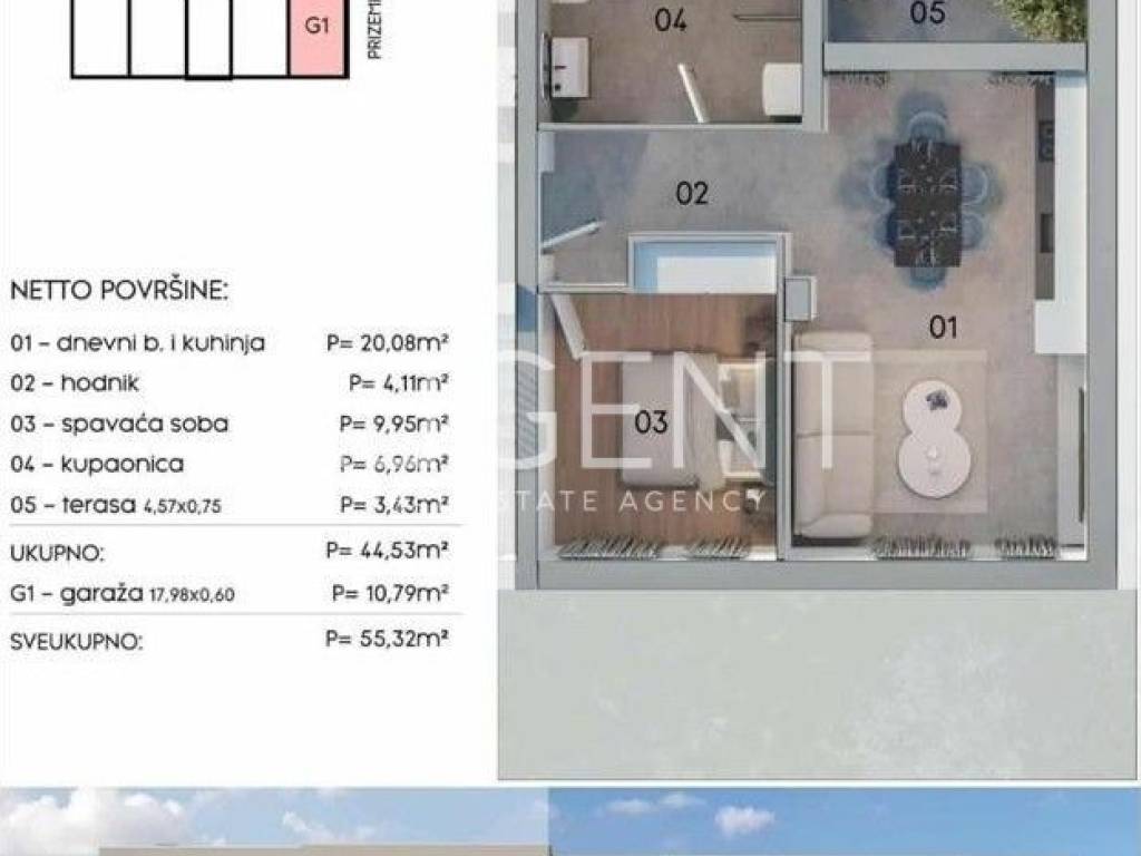 Wir präsentieren Ihnen eine moderne Vierzimmerwohnung in einem Neubau mit insgesamt acht Wohnungen in einem ruhigen und begehrten Teil von Pula. Die funktionale Aufteilung macht sie ideal für das Familienleben oder eine hochwertige Investition. Die Wohnung hat eine Nettofläche von 44,53 m² und besteht aus einem geräumigen Wohnbereich mit Küche und Essbereich, einem Flur, zwei Schlafzimmern, einem Badezimmer und einer Terrasse, die einen angenehmen Außenbereich zum Entspannen bietet. Zur Wohnung gehört auch eine private Garage, die sicheres Parken und zusätzlichen Stauraum bietet. Sie ist mit Fußbodenheizung, Klimaanlage und PVC-Fenstern ausgestattet. Die Lage bietet eine ruhige Umgebung in der Nähe aller wichtigen Einrichtungen, was ein praktisches und angenehmes tägliches Leben ermöglicht. Die Zahlung ist in Bauphasen mit flexiblen Bedingungen möglich. Für weitere Informationen oder zur Vereinbarung einer Besichtigung kontaktieren Sie uns bitte.