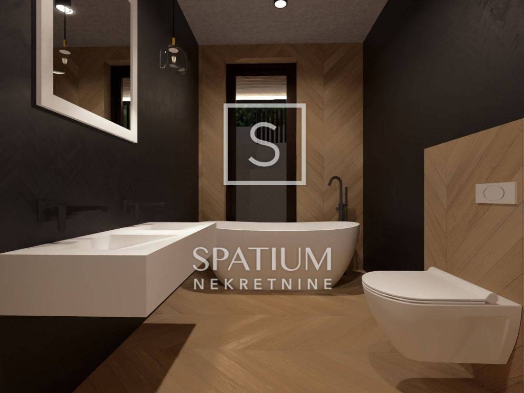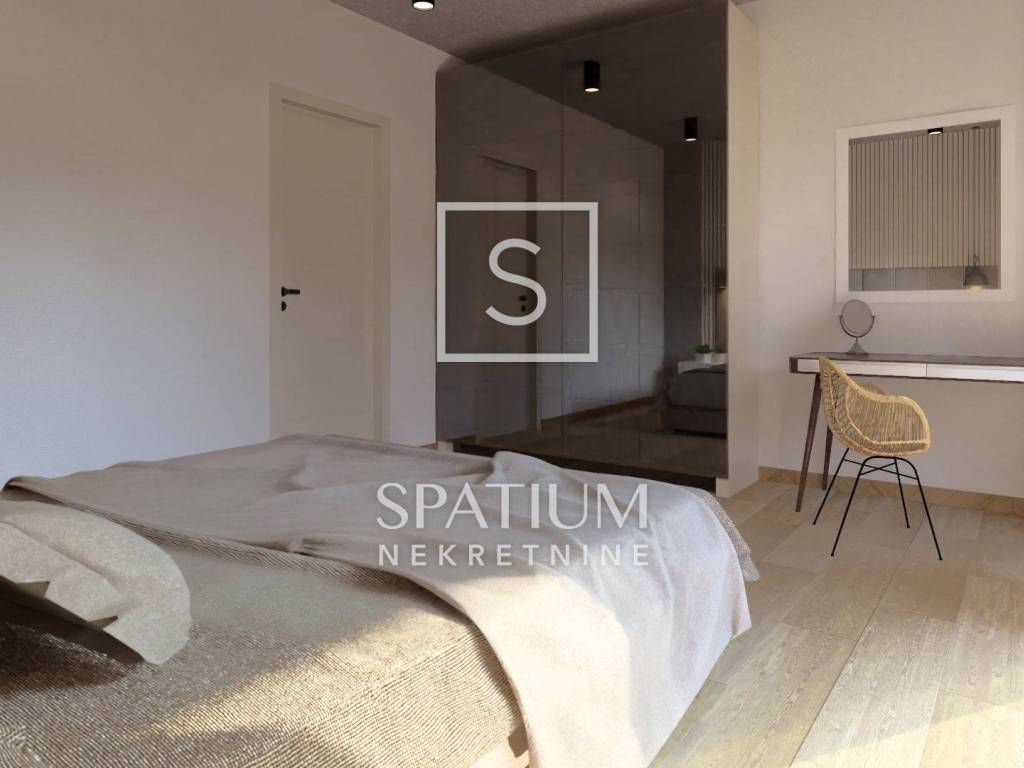 In IČIĆI bieten wir Ihnen eine Zweizimmerwohnung im zweiten Stock eines Neubaus mit Gemeinschaftspool an. Beim Betreten der Wohnung empfängt Sie der helle, luftige Wohnbereich mit seinen großen Glasfronten. Auf der einen Seite befinden sich ein Einbauschrank, ein Badezimmer und ein Technikraum. Gegenüber liegen zwei geräumige Schlafzimmer, die durch ein zweites Badezimmer getrennt sind. Die Schlafzimmer haben eine Fläche von 15 Quadratmetern und bieten so hohen Wohnkomfort. Sie bieten Ausblick und direkten Zugang zum Balkon.