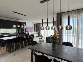 Eine Innentreppe führt in die obere Etage, wo sich zwei weitere Schlafzimmer mit eigenen Bädern und Balkonen sowie ein praktischer Abstellraum befinden. Die gesamte Möblierung der Villa ist hochwertig und designorientiert. Das Objekt wurde nach den besten ökologischen Standards gebaut, was durch das A++ Energiezertifikat bestätigt wird.