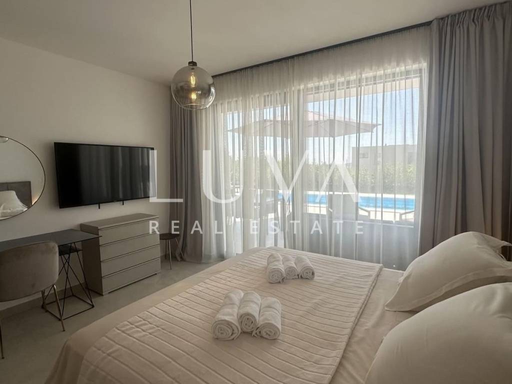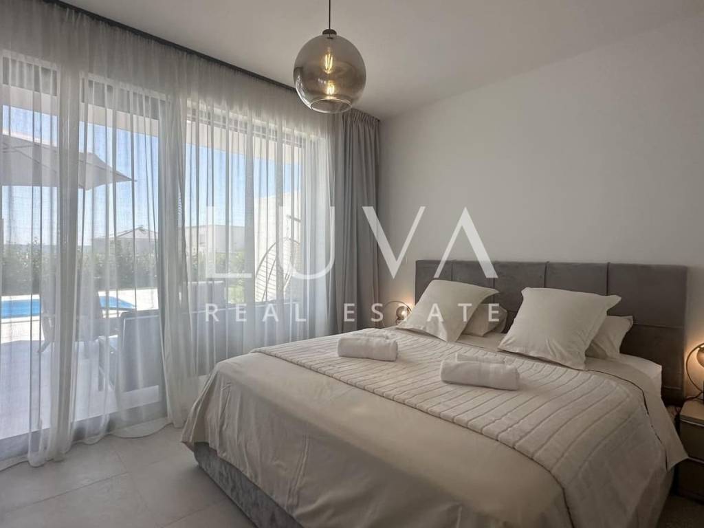 Diese luxuriöse Villa erstreckt sich über zwei Etagen, mit einem sorgfältig gestalteten Innenraum für maximalen Komfort. Das Erdgeschoss umfasst einen Eingangsbereich, ein Gäste-WC und einen Waschraum sowie ein Schlafzimmer mit eigenem Bad. Der offene Wohnbereich, Essbereich und die Küche sind mit der geräumigen Terrasse verbunden, auf der sich ein Pool, eine Sonnenterrasse und ein angelegter Garten befinden.