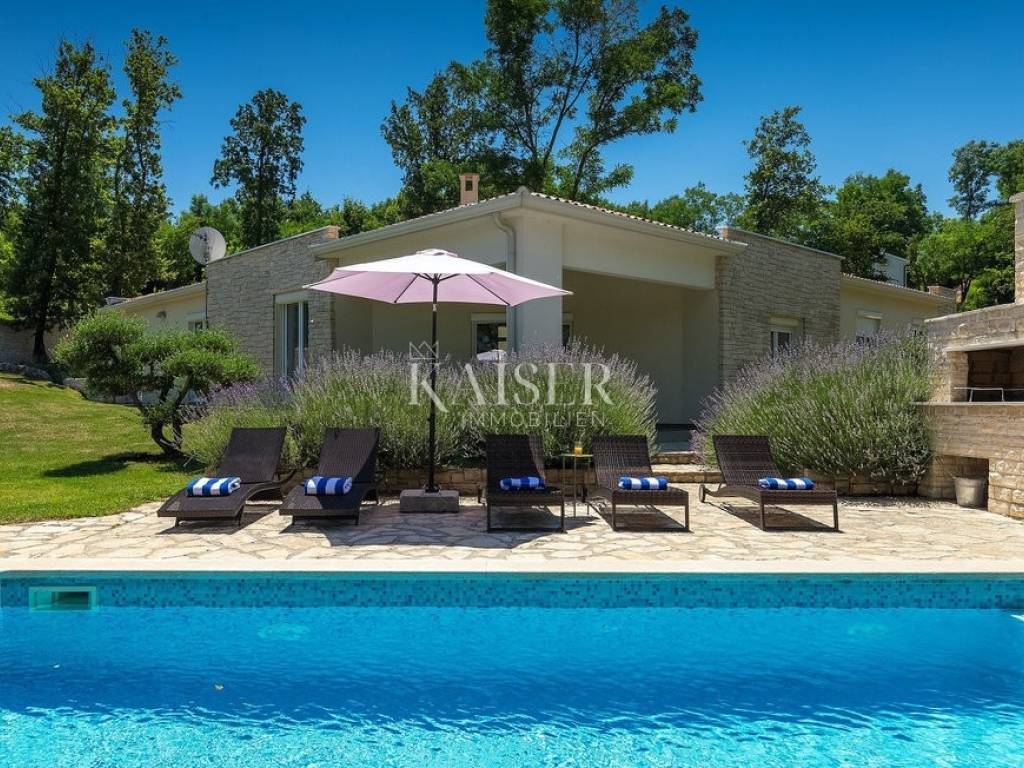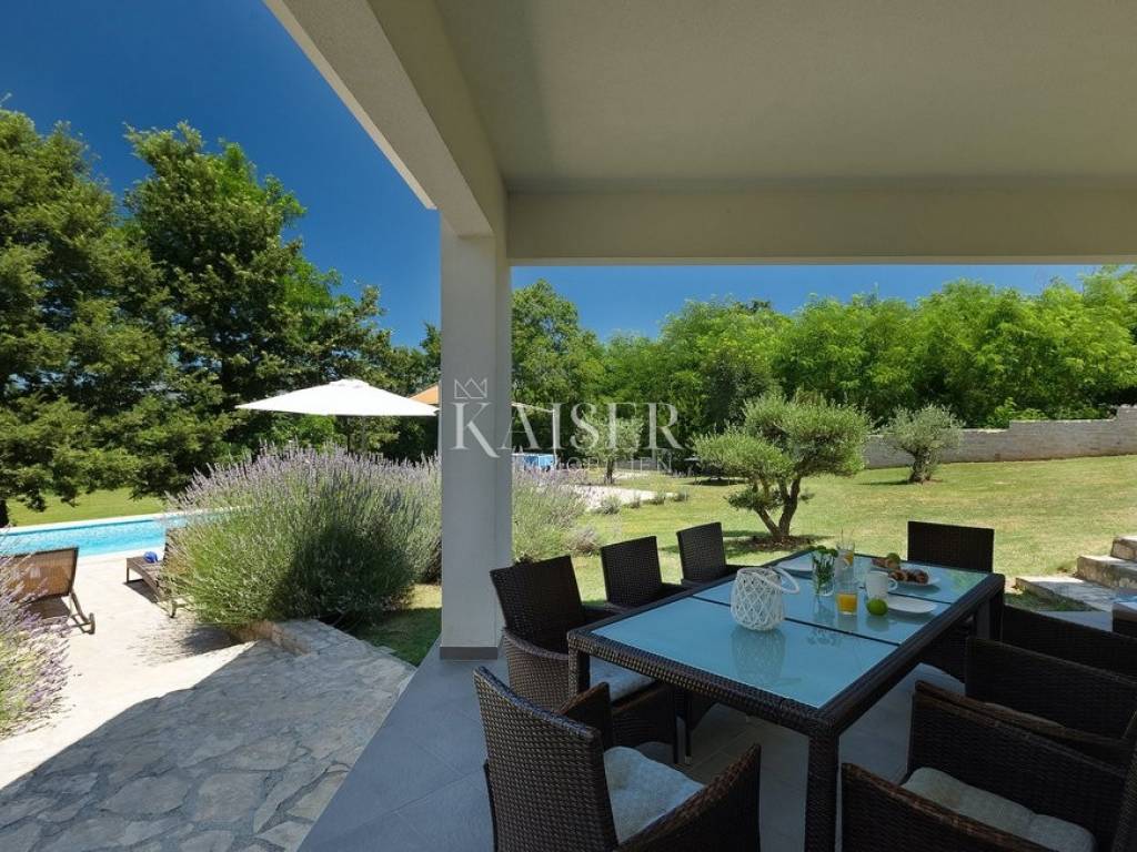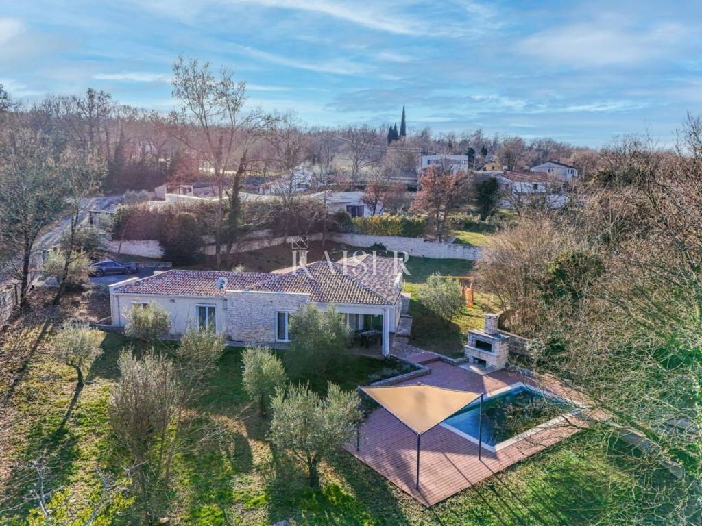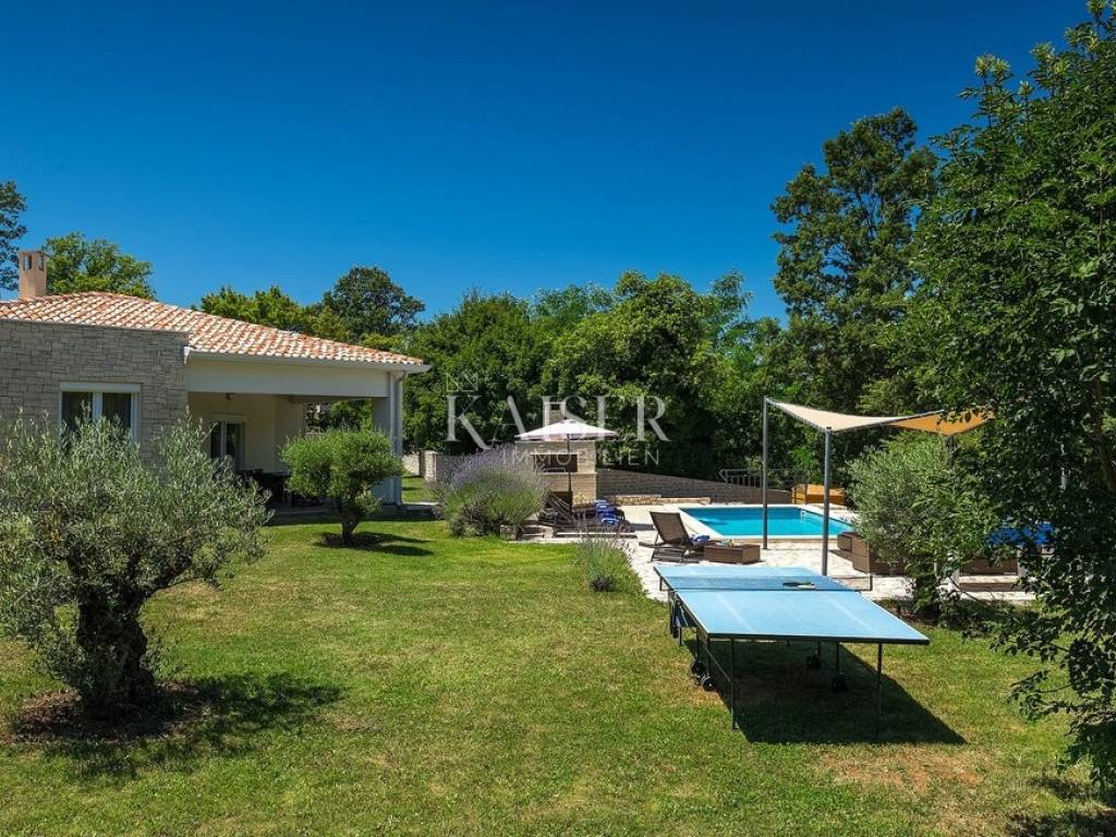 Das Haus verfügt über vier klimatisierte Schlafzimmer, jeweils mit eigenem Bad, die maximalen Komfort und Privatsphäre gewährleisten, sowie ein zusätzliches Gäste-WC. Der Außenbereich ergänzt das Ambiente im Inneren perfekt. Ein privater Pool mit Liegewiese bietet absolute Privatsphäre und Entspannung an warmen Tagen, während ein angelegter Garten mit Olivenbäumen und mediterranen Pflanzen die authentische istrische Atmosphäre unterstreicht. Das großzügige Grundstück bietet die Möglichkeit zur individuellen Gestaltung, beispielsweise durch den Bau einer Sommerküche, zusätzlicher Einrichtungen oder gärtnerischer Elemente. Parkplätze für mehrere Fahrzeuge sind ebenfalls vorhanden.
