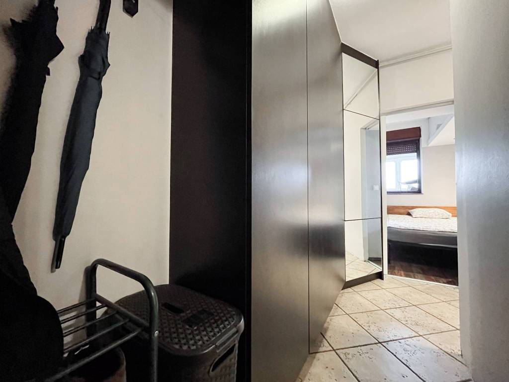 Potpuno je namješten i opremljen. Sadrži Samsung klima uređaj, perilicu rublja, hladnjak sa zamrzivačem, štednjak, kauč na razvlačenje, bračni krevet, kućanske aparate, posuđe, protuprovalna vrata, ugradbene urmare, mnogo spremišnog prostora itd.
