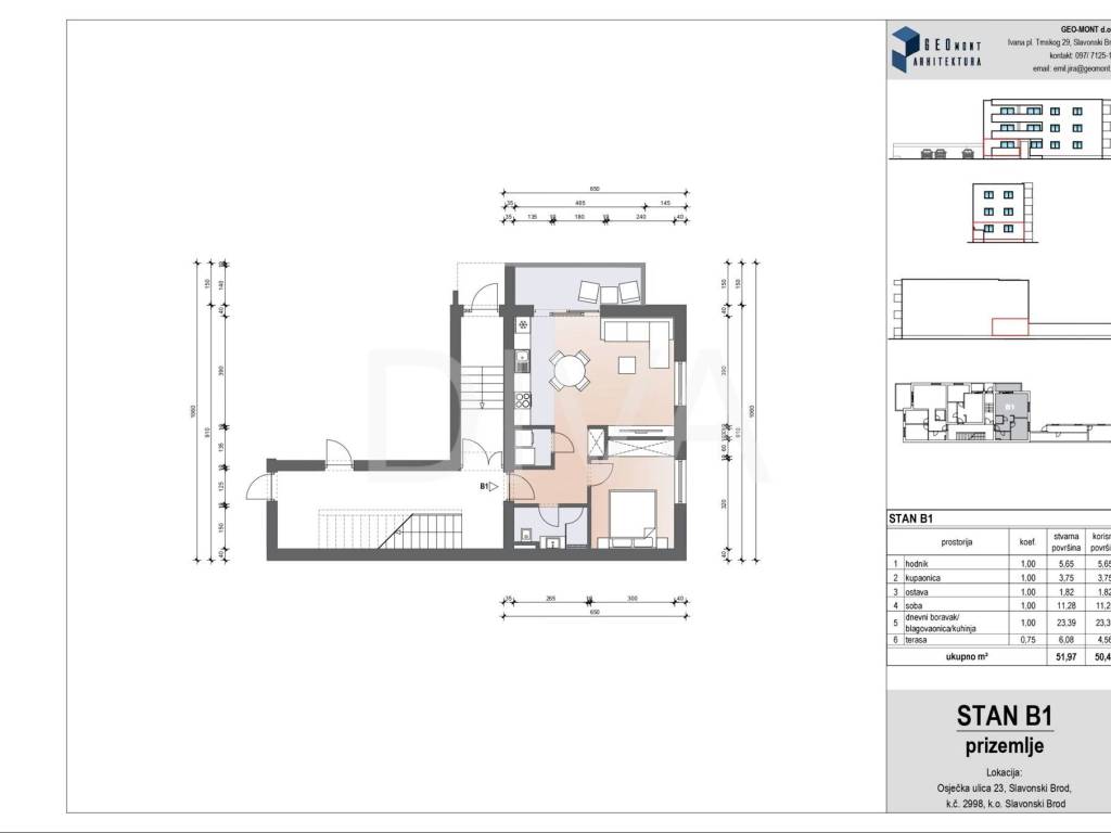 STAN B1 NOVOGRADNJA, OSJEČKA 23, SLAVONSKI BROD Predstavljamo stan B1 u prizemlju novog stambenog projekta u Osječkoj ulici 23 moderna zgrada u izgradnji, smještena u mirnoj i uvučenoj ulici prije pruge, u neposrednoj blizini škole i vrtića u naselju Andrije Hebrang. Zgrada je katnosti prizemlje + 2 kata, s ukupno 9 stambenih jedinica i pripadajućim parkirnim mjestima, projektirana prema suvremenim standardima gradnje s naglaskom na funkcionalnost i kvalitetu života.