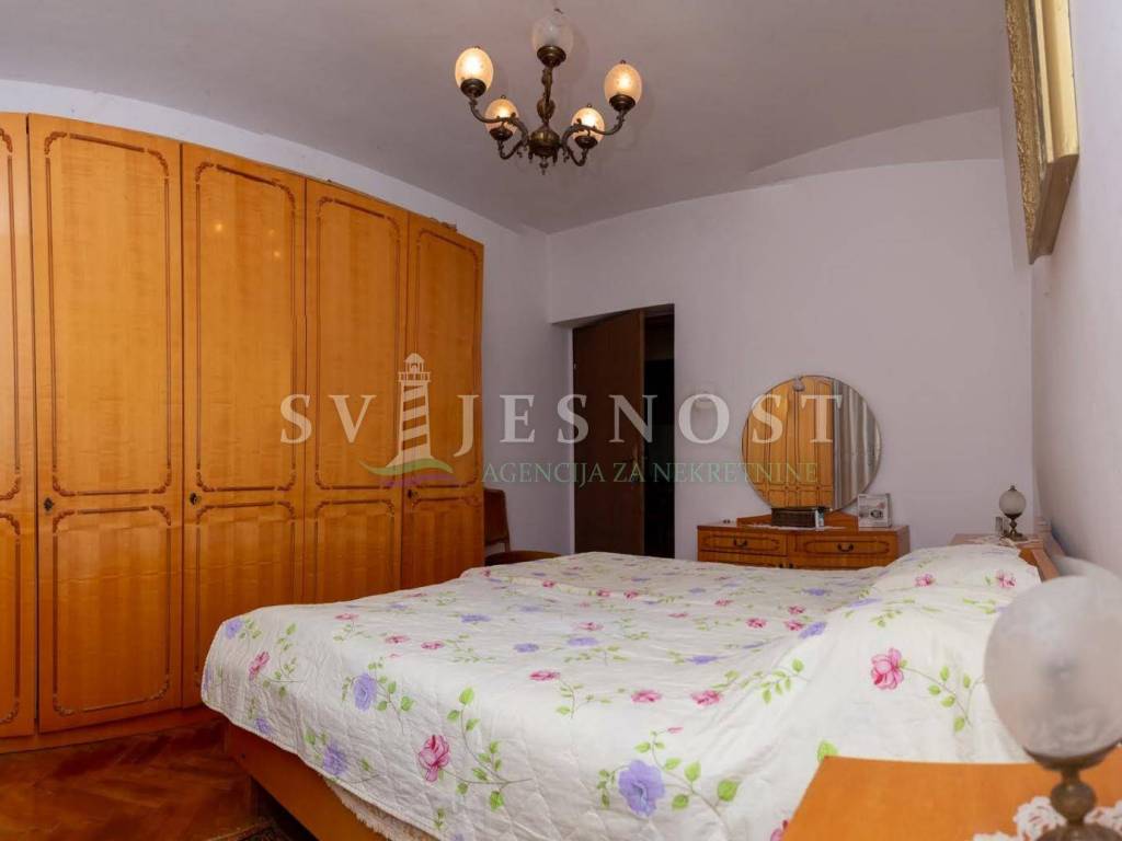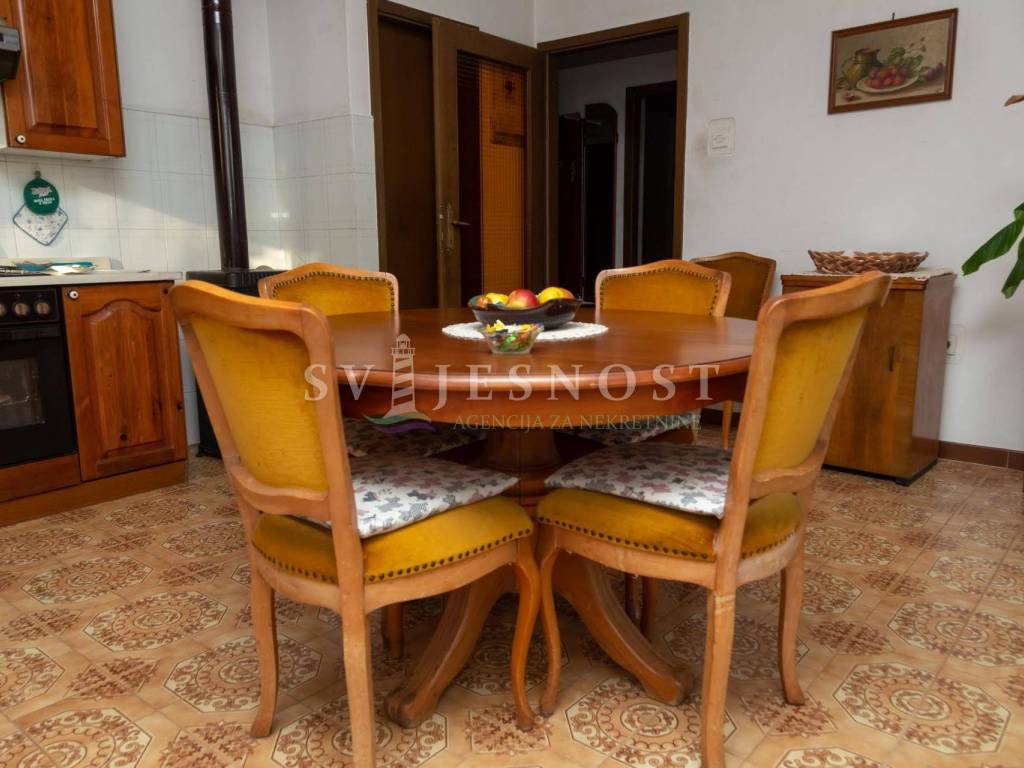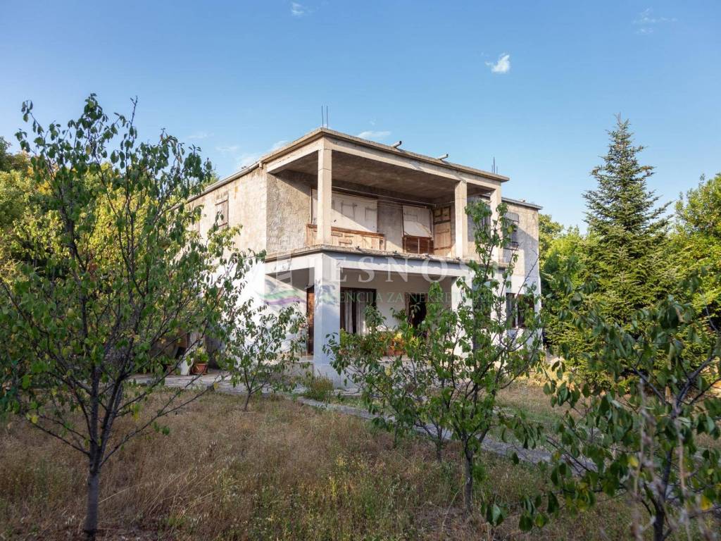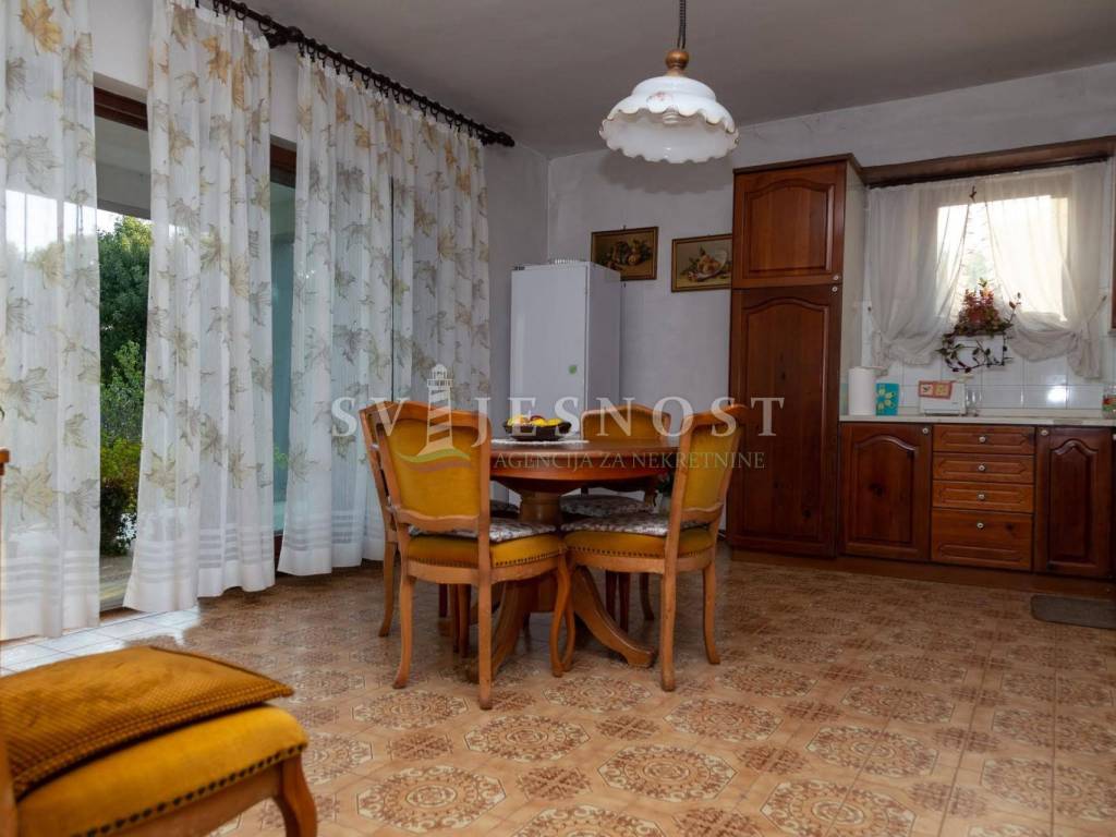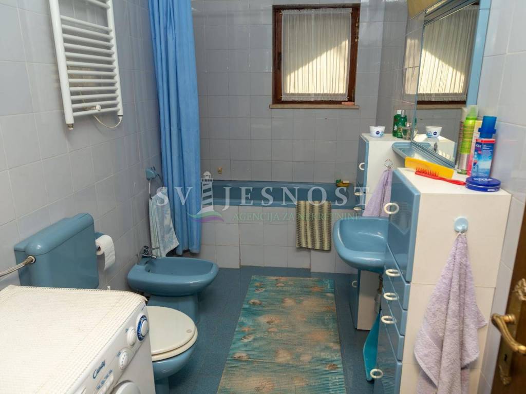 Das Erdgeschoss wird von den großen überdachten Terrassen betreten, in den Flur und eine private Küche mit einem geräumigen Esszimmer, Wohnzimmer, zwei Schlafzimmern und einem kleinen praktischen kleinen Raum. Das Obergeschoss ist über eine Außentreppe zu erreichen, und die Wohnung vel. 130m2 hat Trennwände und muss komplett renoviert werden. Vom Balkon vel. cca 18m2 bietet einen freien Blick auf den Kvarner Die Entfernung vom Meer und den Stränden beträgt nur 600m zu Fuß.
