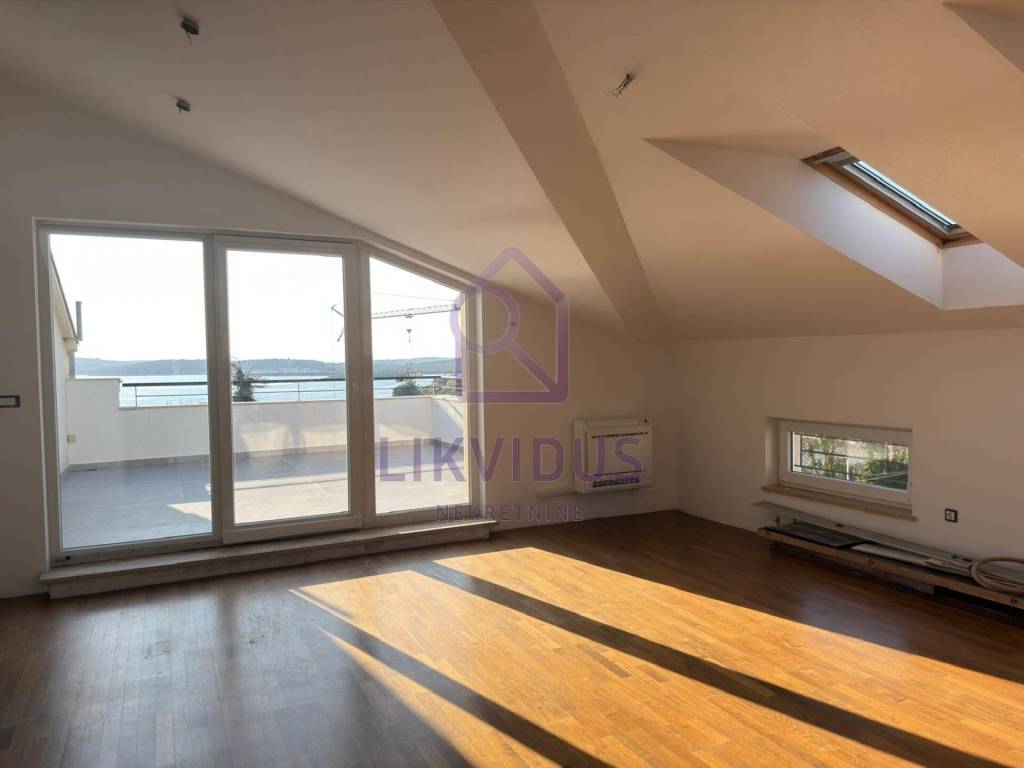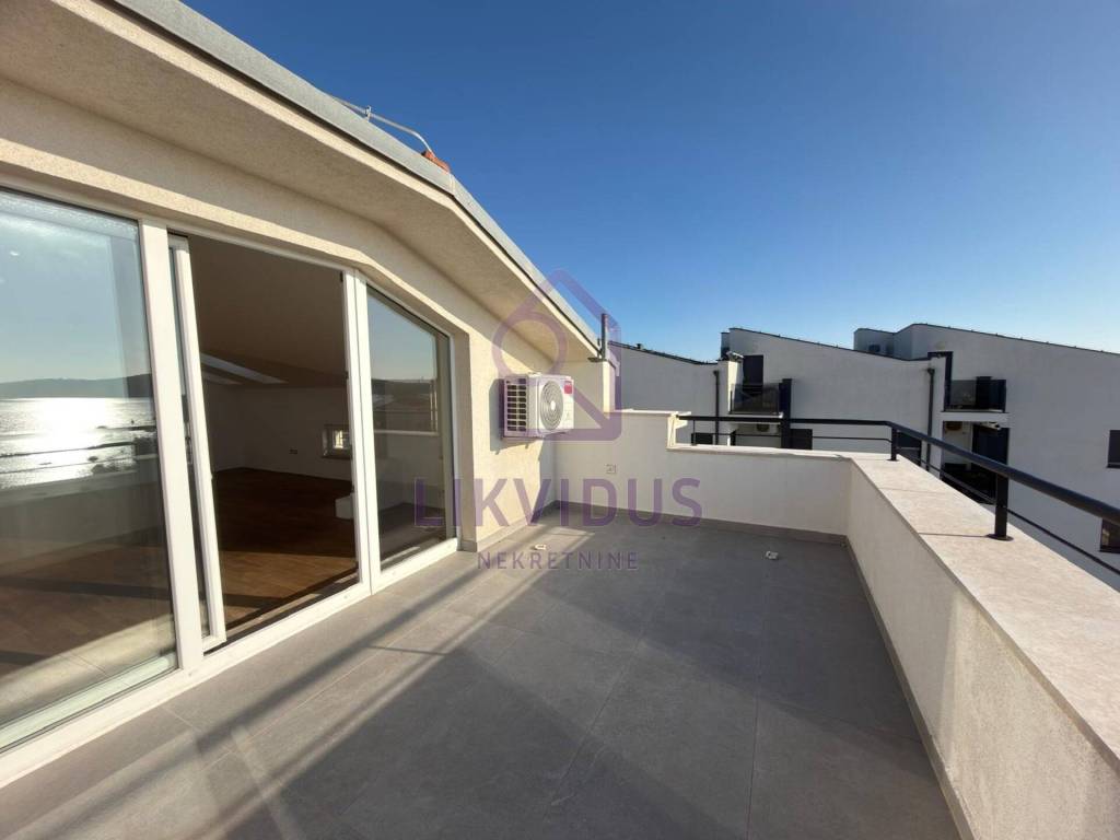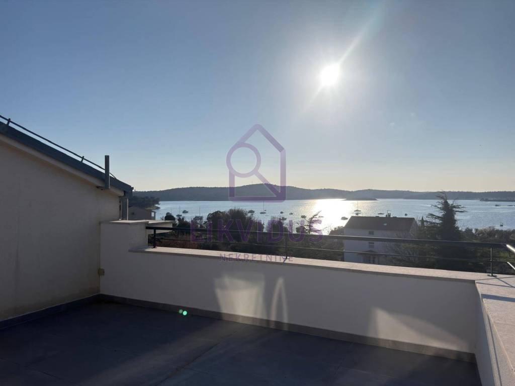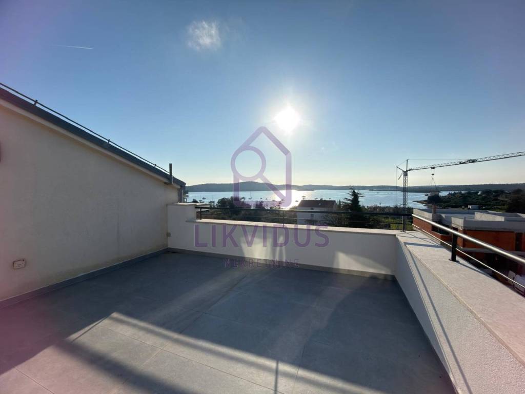 For sale: A stunning luxury penthouse in Medulin, located just 150 meters from the sea, offering a permanent and unobstructed panoramic view. Due to the buildings position and zoning laws, the view from both terraces can never be blocked by future construction.