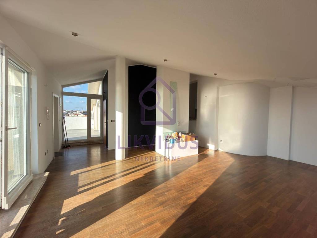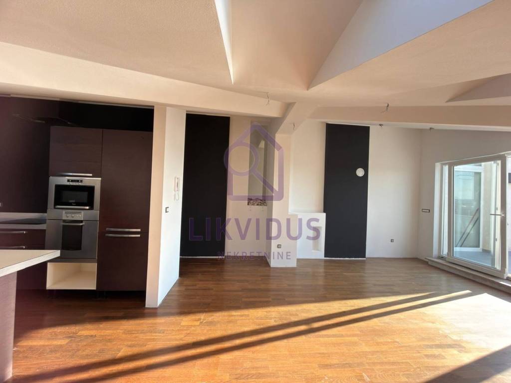 The apartment features high-end African Walnut parquet flooring, providing warmth and exclusivity. The layout is functional, airy, and filled with natural light.
