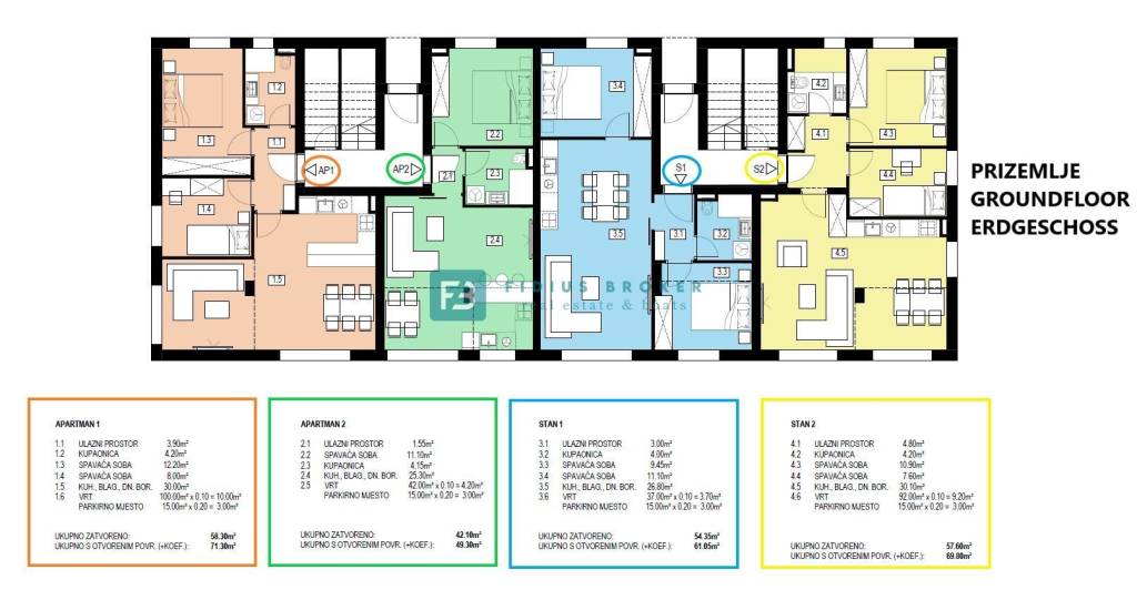 Die Wohnung S2 mit einer Gesamtnutzfläche von 69,80 m² (Wohnfläche 57,60 m² + Garten 92 m² + Parkplatz 15 m²) befindet sich ebenfalls im Erdgeschoss. Die funktional gestaltete Wohnung besteht aus einem Eingangsbereich, einem Badezimmer, zwei Schlafzimmern, einer Wohnküche, einem Wohnzimmer mit Zugang zu einer Terrasse und einem 92 m² großen Garten. Zur Wohnung gehört ein Stellplatz. Der Preis beträgt 200.000 € (der Käufer ist von der 3%igen Grundsteuer befreit).