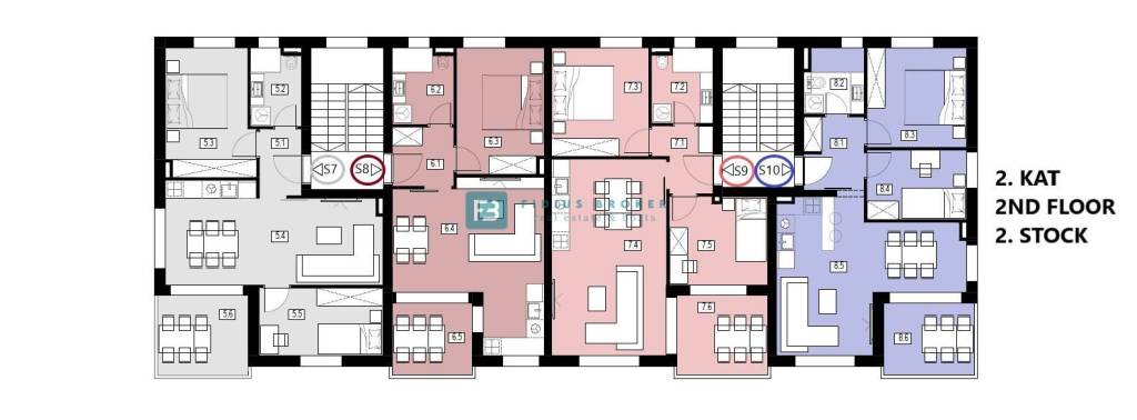 Die Wohnung S8 mit einer Gesamtnutzfläche von 51,70 m² (Wohnfläche 43,90 m² + Loggia 6,40 m² + Parkplatz 15 m²) befindet sich im 2. Obergeschoss. Die funktional aufgeteilte Wohnung besteht aus Eingangsbereich, Badezimmer, Schlafzimmer, Wohnküche und Wohnzimmer mit Zugang zu einer 6,40 m² großen Terrasse mit Meerblick. Zur Wohnung gehört ein Parkplatz.