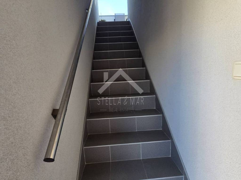Eine Außentreppe führt in das Obergeschoss, wo sich eine 46,64 m große Wohnung mit gleichem Grundriss befindet. Die Terrasse bietet Meerblick.