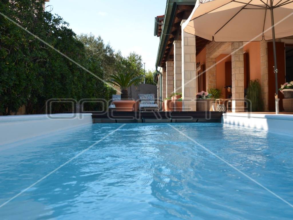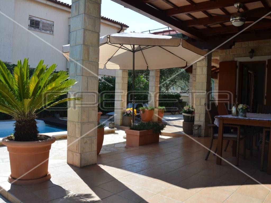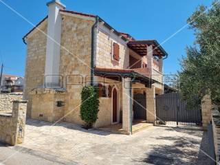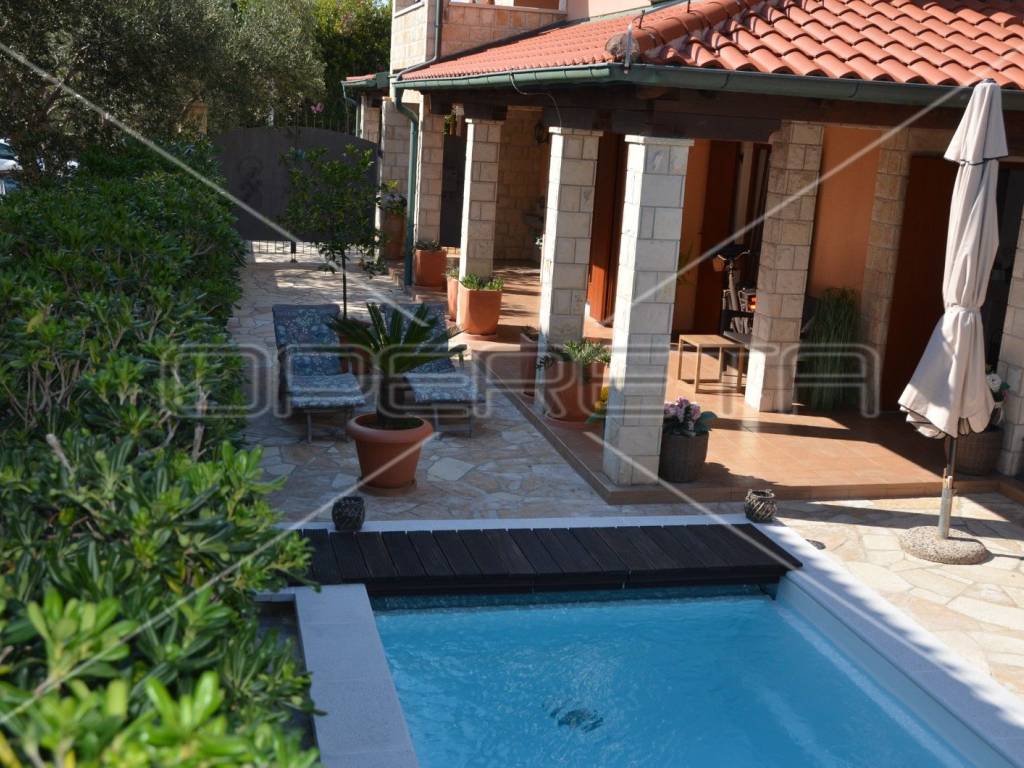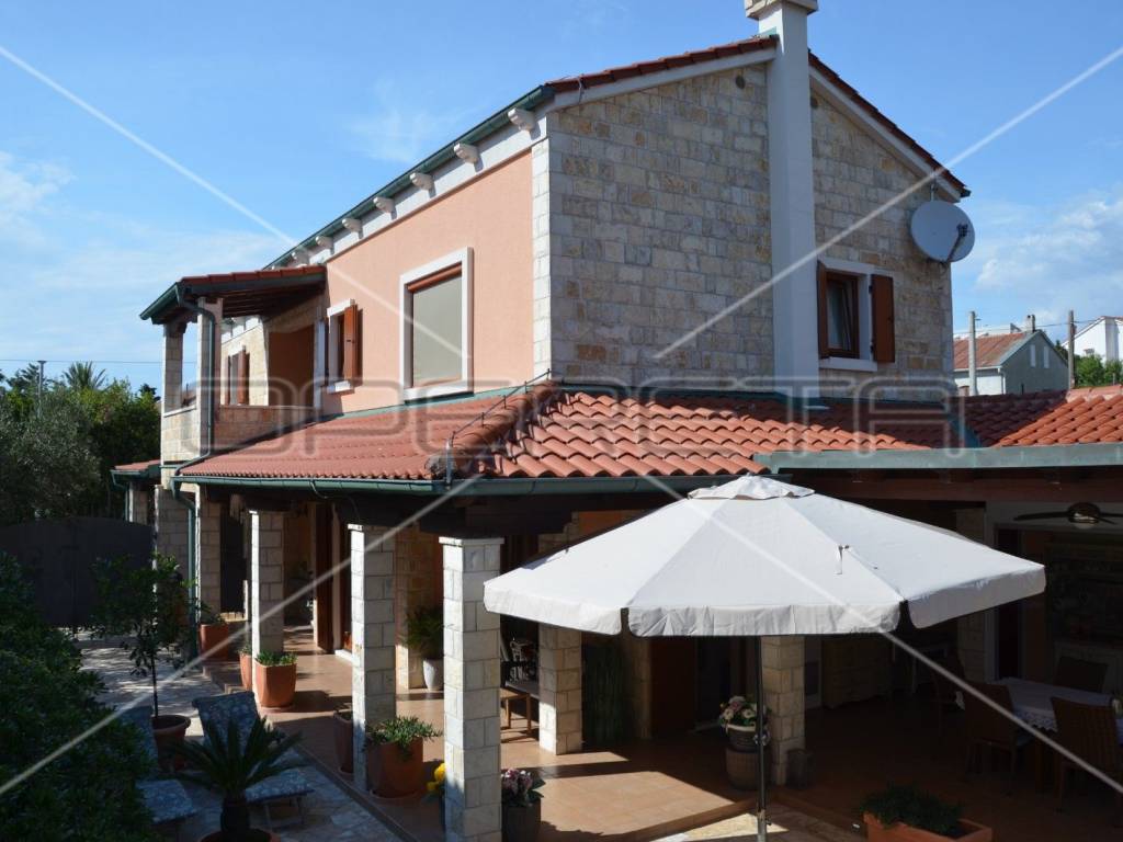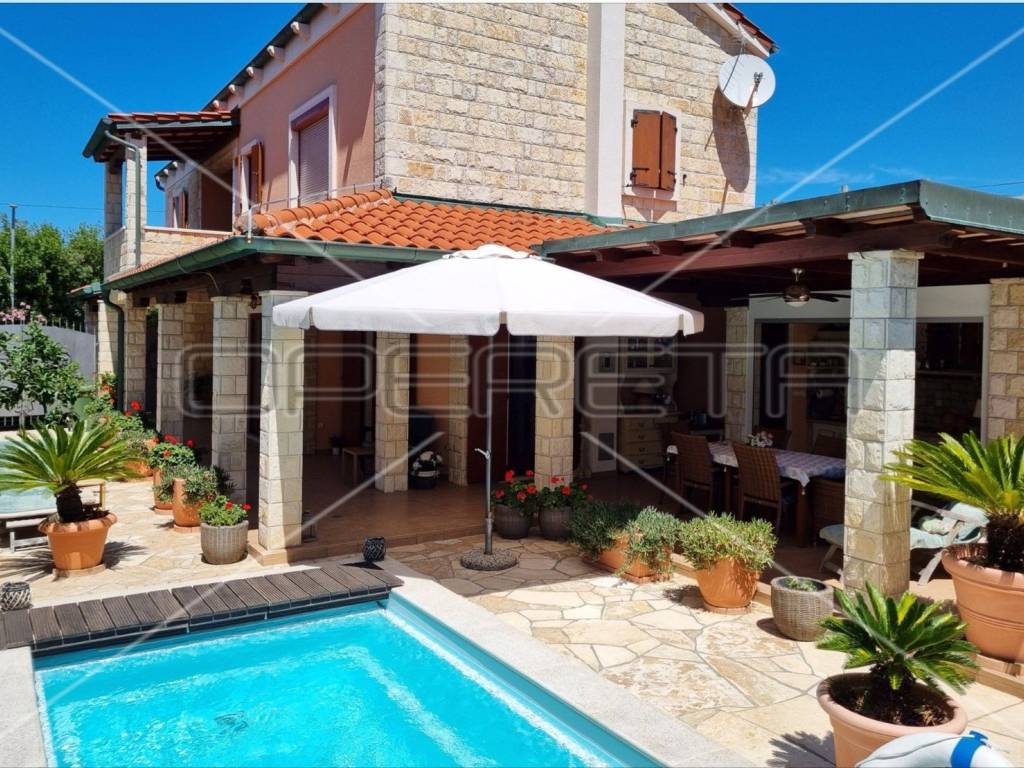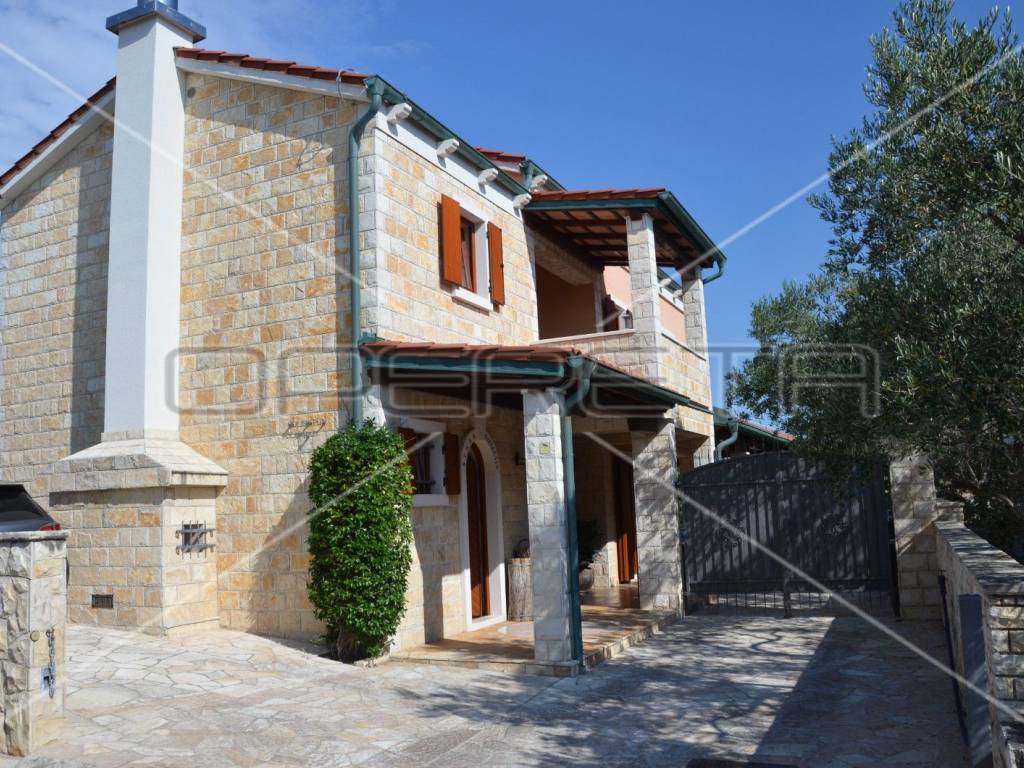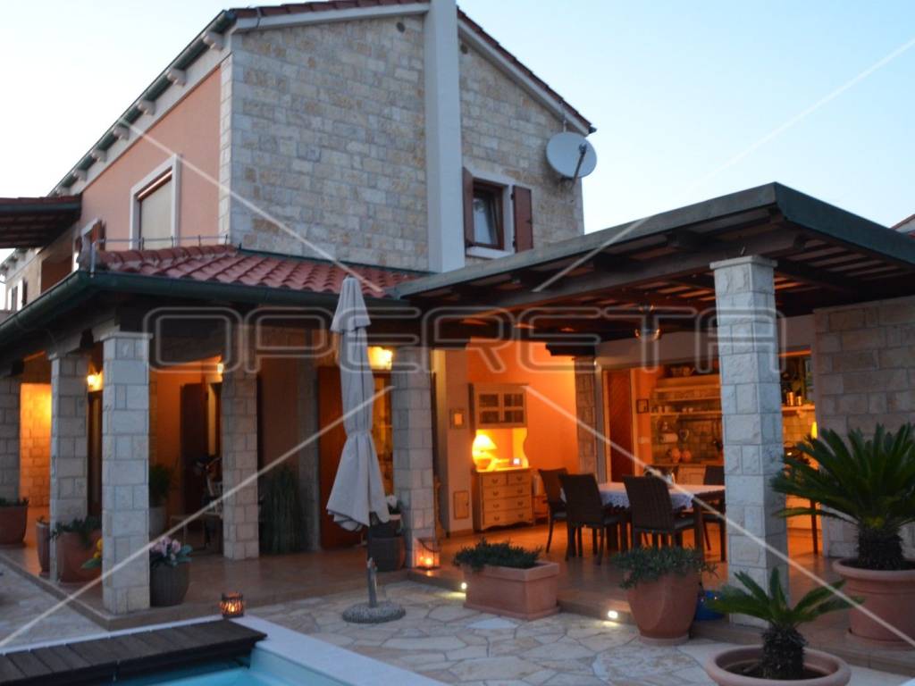 Diese einzigartige, luxuriöse und rustikale Villa im traditionellen Stil wurde 2010 erbaut und bietet auf einer Gesamtfläche von 197 m Ruhe und Privatsphäre dank eines gepflegten und umzäunten Gartens in unmittelbarer Nähe zum Zentrum von Novalja. Nur 250 m vom Hauptplatz und 350 m vom Meer und Strand entfernt. Die Villa erstreckt sich über zwei Etagen: Im Erdgeschoss befinden sich ein Wohnzimmer mit Kamin und Zugang zur Terrasse, ein Esszimmer mit Küche, ein großer Aufenthaltsraum, ein Badezimmer und ein separates WC. Eine elegante Treppe führt in das Obergeschoss mit drei Schlafzimmern, eines davon mit Zugang zu einem Whirlpool für drei Personen, einer Loggia, einem Badezimmer mit WC und einem Flur. Die hochwertige Bauweise besticht durch sorgfältig ausgewählte Details und die Ausstattung mit erstklassigen Materialien, Geräten und italienischen Möbeln. Vom Wohnzimmer im Erdgeschoss gelangt man auf eine überdachte Terrasse mit angrenzender Sommerküche und einem Duschraum. Der großzügige Garten mit 3 x 5 m großem Swimmingpool lädt zum Verweilen und Genießen ein. Privater Luxus im Herzen von Novalja, unweit des Meeres! Sehr empfehlenswert!