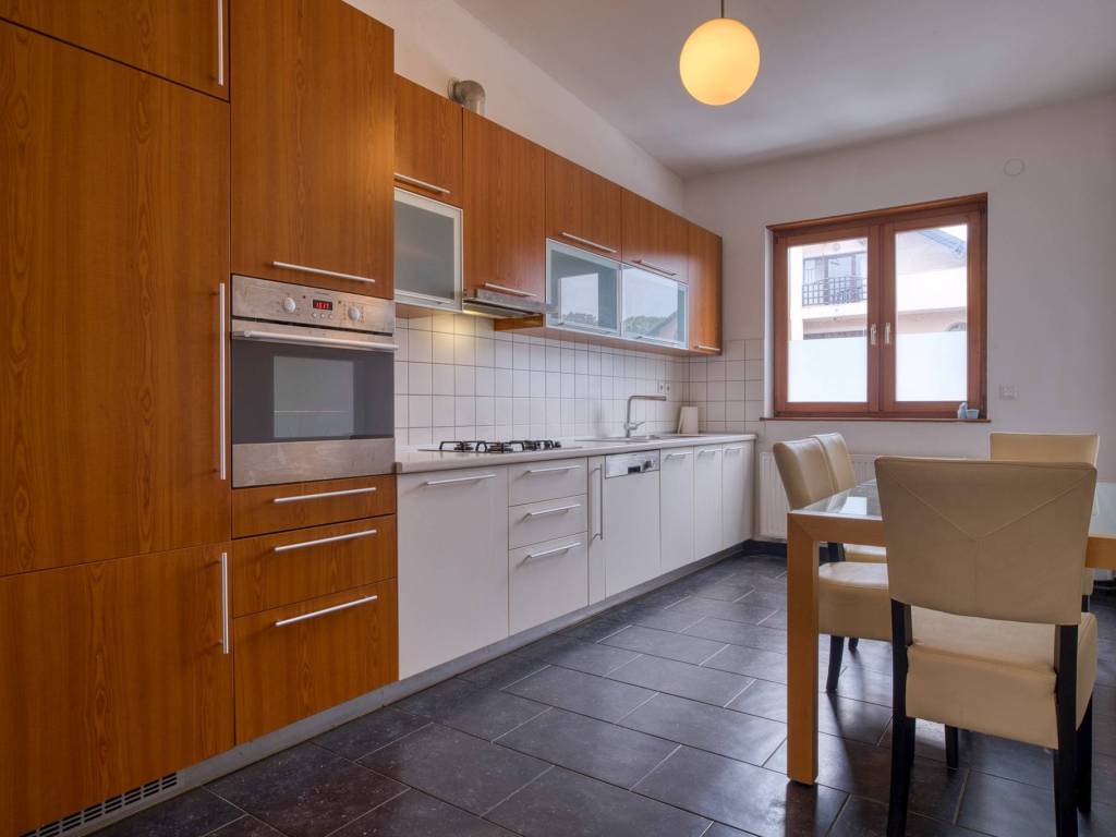 Stan je jednoetažni, ima zatvorenu povrđšinu od 110 m, a sastoji se od ulaznog hodnika s ugradbenim ormarom, prostranog dnevnog boravka s izlazom na ogromnu terasu, tri spavaće sobe i dvije moderno uređene kupaonice. Jedna kupaonica nudi poseban luksuz s ugrađenom parnom kupelji. Kuhinja s blagovaonicom je odvojena, funkcionalna i moderna s ormarićima u boji drveta i donjim elementima u bijelom sjaju. Opremljena je svim potrebnim ugradbenim uređajima uklj. i perilicu suđa. Ogromna natkrivena terasa od 70 m s mini bazenom i biljarskim stolom je savršena za opuštanje, zabavu i uživanje s pogledom na zelenilo.