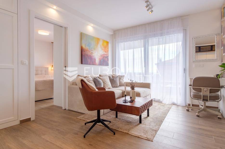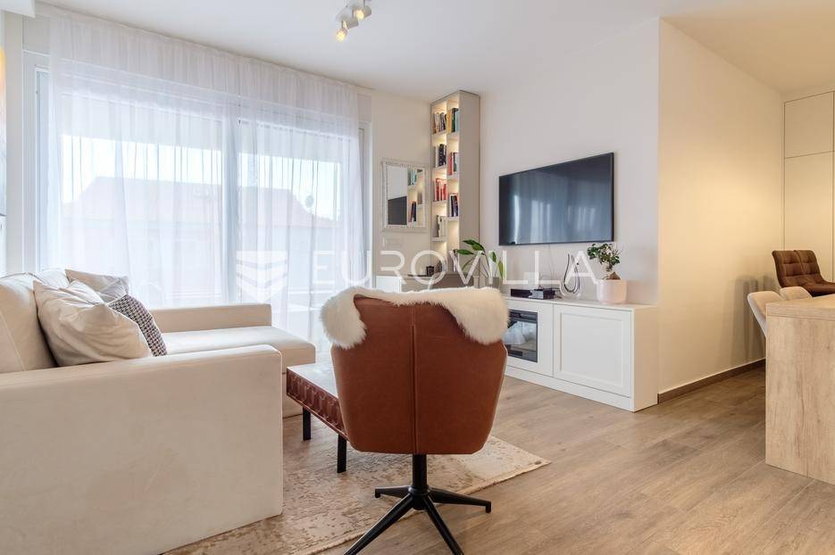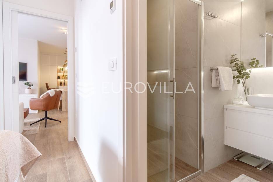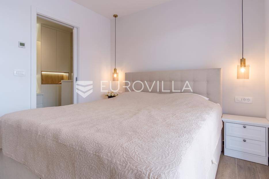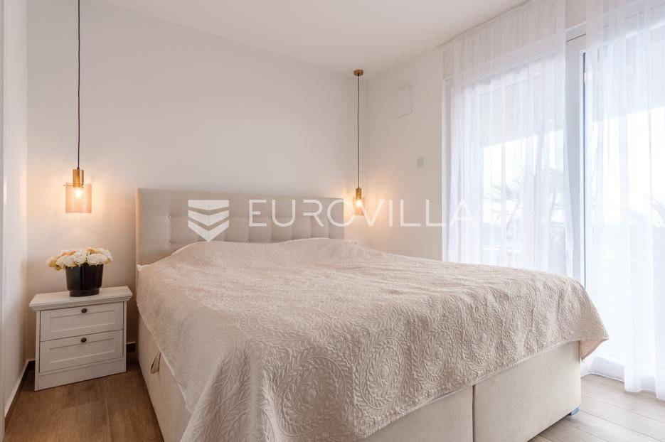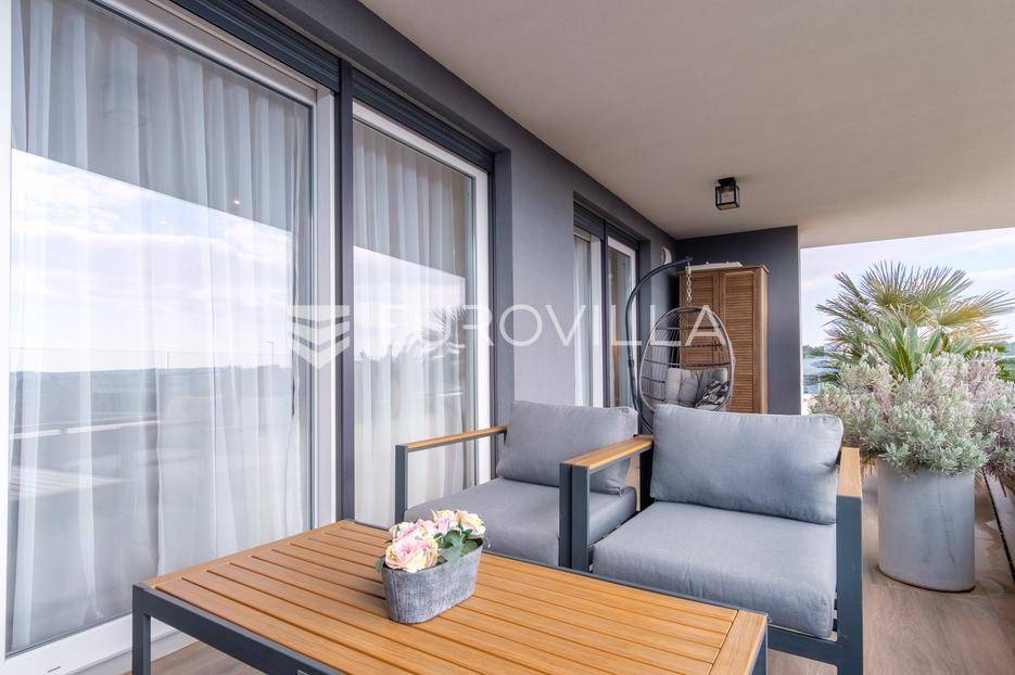 Prodaje se luksuzan stan na prvom katu stambene zgrade ukupne neto površine 65,67 m2, s pripadajuća dva parkirna mjesta, svaki površine 12,5 m2. Savršen spoj udobnosti i modernog dizajna čini ovaj stan izvrsnim izborom za sve koji traže kvalitativan životni prostor.Ulaskom u stan dolazite u hodnik koji vas vodi do jedne spavaće sobe s vlastitom kupaonicom, koja je trenutno preuređena u ured, no njena oprema omogućava jednostavnu prilagodbu za funkcionalnu spavaću sobu. Dnevni boravak s kuhinjom i blagovaonicom predstavlja otvoreni prostor za ugodan boravak i druženja, a iz njega se izlazi na prostranu natkrivenu osunčanu terasu koja nudi pogled na more – idealno za uživanje u jutarnjoj kavi ili opuštanje na svježem zraku.U nastavku se nalazi još jedna spavaća soba s vlastitom kupaonicom, iz koje također izlazite na natkrivenu terasu kroz veliku staklenu stijenu, stvarajući osjećaj otvorenosti i svjetlosti u cijelom stanu.Stan se prodaje potpuno opremljen i namješten, s pažljivo odabranim modernim namještajem rađenim po mjeri, koji se savršeno uklapa u prostor i pruža funkcionalnost i estetsku vrijednost. Namještaj je izrađen s ciljem optimalnog iskorištavanja prostora i omogućava vrhunski ugođaj.Za maksimalnu udobnost i energetske uštede, stan je opremljen podnim grijanjem koje se proteže kroz cijeli prostor, a svaka prostorija ima vlastiti termostat za precizno podešavanje temperature. Dodatno, u dnevnom boravku smješten je električni kamin s funkcijom grijanja, koji doprinosi atmosferi i udobnosti stana. Hlađenje je osigurano putem tri klima uređaja koji omogućavaju ugodan boravak u svim godišnjim dobima. Ugrađeni rekuperator zraka poboljšava kvalitetu života, omogućujući prirodnu cirkulaciju zraka i učinkovit prijenos topline ili hladnoće između unutarnjeg i vanjskog prostora, uz minimalnu potrošnju energije.Stan se nalazi na odličnoj lokaciji, svega 900 metara od mora, a svi potrebni sadržaji za svakodnevni život dostupni su na samo nekoliko minuta pješice ili autom.Ovaj stan posjeduje uporabnu dozvolu i spreman je za useljenje te predstavlja izuzetnu priliku za one koji žele uživati u modernom, luksuznom životu u blizini mora.Za dodatne informacije, odgovore na pitanja ili organizaciju razgledavanja, slobodno nas kontaktirajte.... Više na eurovilla.hr, ID: 125898