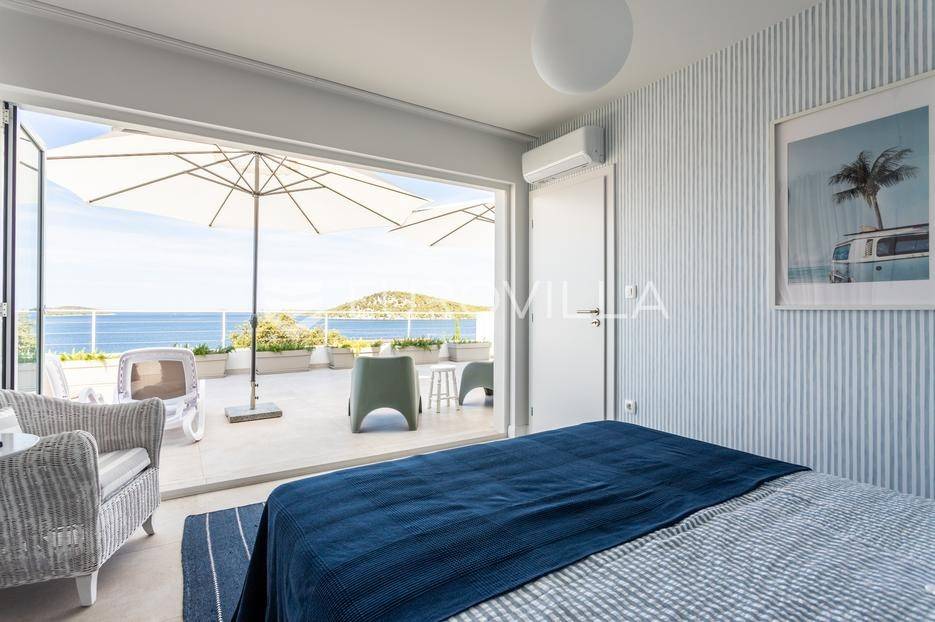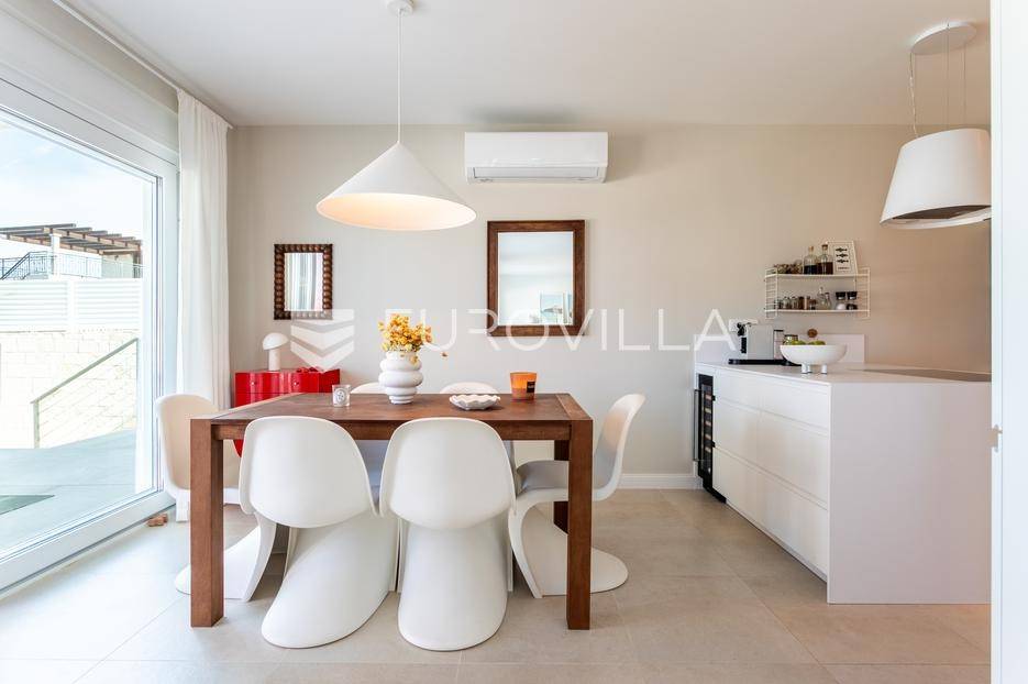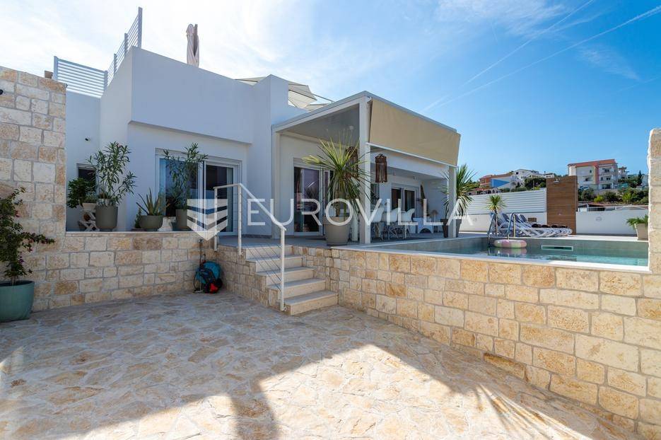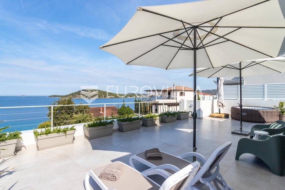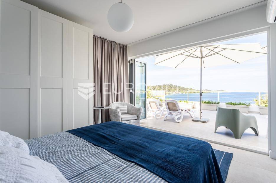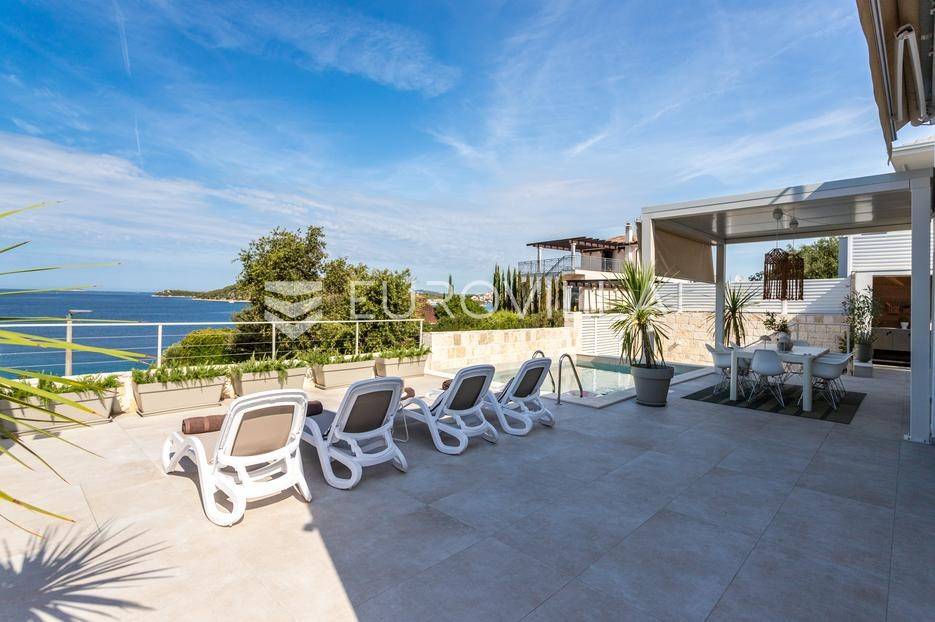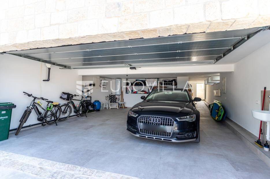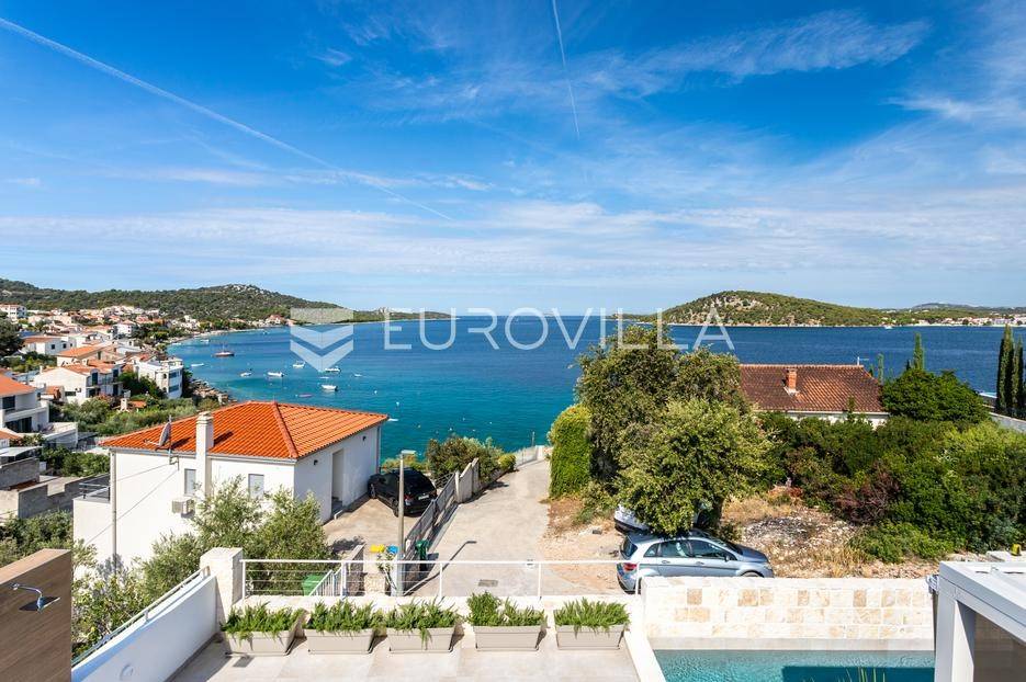 Rogoznica, Ražanj, prekrasna kuća s bazenom i pogledom na more, ukupne površine 390,51 m² te neto korisne površine 246,67 m² u potpunosti renovirana 2024. godine. Prodaje se potpuno namještena i opremljena, te idealna za odmor ili turistički najam.Izgrađena na 2 etaže na parceli od 398 m². Sastoji se od prizemlja u kojem se nalazi prostrani dnevni boravak, kuhinja i blagovaonica, 3 spavaće sobe, dvije kupaonice te vešeraj i walk in ormar. Iz boravka i blagovaonice izlazi se na prostranu terasu s bazenom, sunčalištem, prostorom za roštiljanje i pogledom na more. Vanjskim stepenicama dolazi se na kat gdje se nalazi zaseban apartman koji se sastoji od dnevnog boravka s kuhinjom i blagovaonicom, jedne spavaće sobe i kupaonice. Velike staklene površine apartmana se u potpunosti otvaraju te apartman postaje jedno s terasom na kojoj je jacuzzi, sunčalište i vanjski tuš. Stepenicama iz prizemlja se spušta u garažu za dva automobila.Kuća je građena po vrhunskim standardima, te je uređena dizajnerskim namještajem. Svaka prostorija ima klima uređaj, te je ugrađeno podno grijanje. Od opreme kuća ima solarne panele snage 6Kw, video nadzor, pripremu za punionicu za el. aute, garažna vrata na daljinsko upravljanje te vrhunske kuhinjske aparate. Kuća je na odličnoj lokaciji, manje od 50 metara od mora. U moru ispred kuće vlasnik ima i corpo morto, tako da kupac može imati i brod odmah ispred kuće.Sve ostale informacije na upit.... Više na eurovilla.hr, ID: 145955