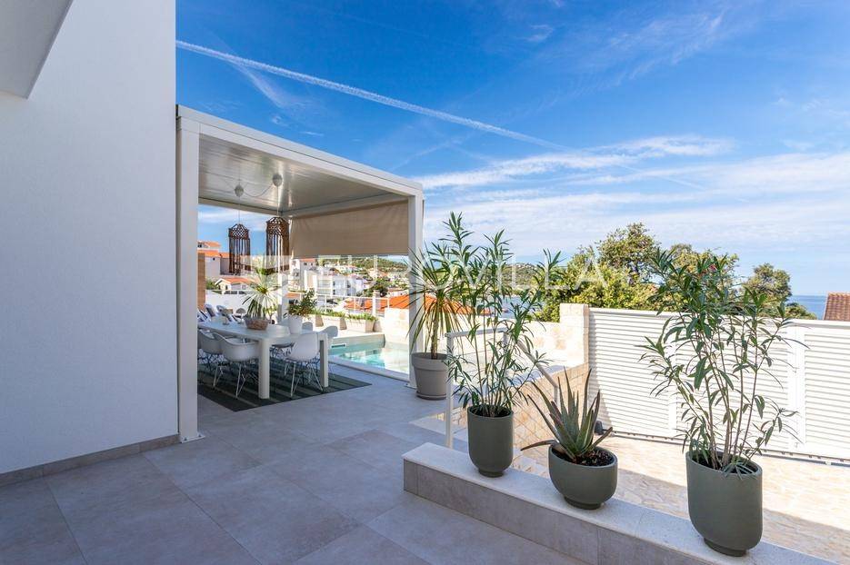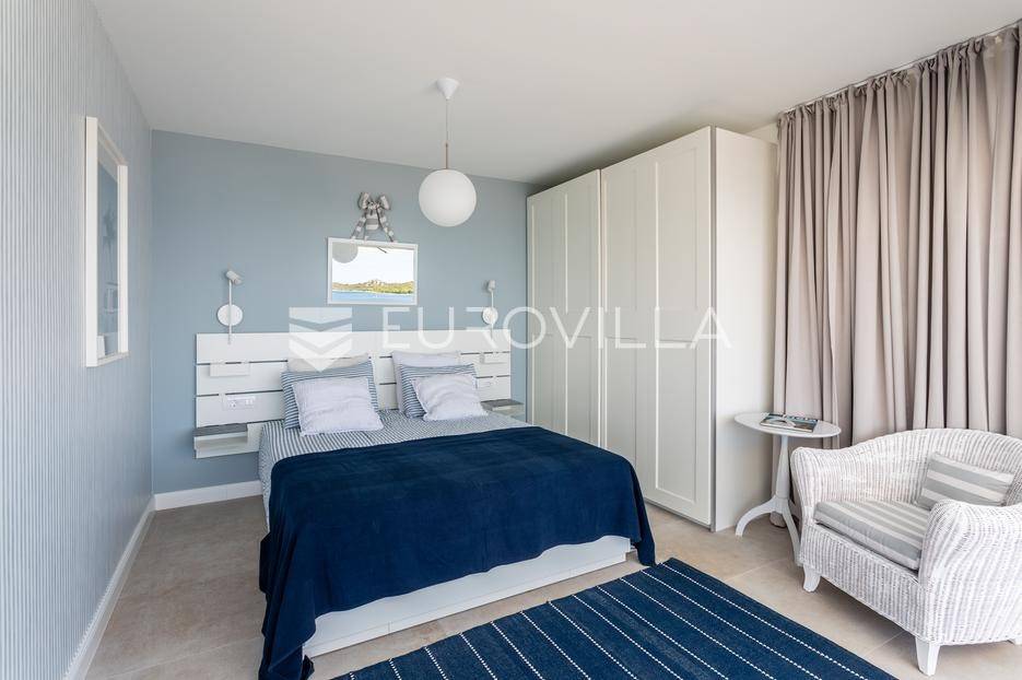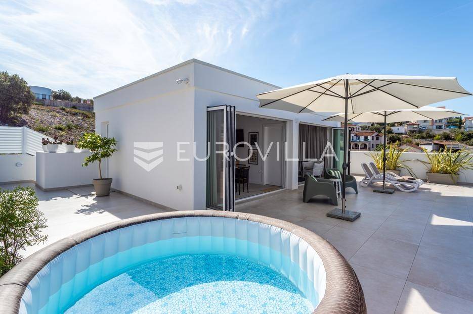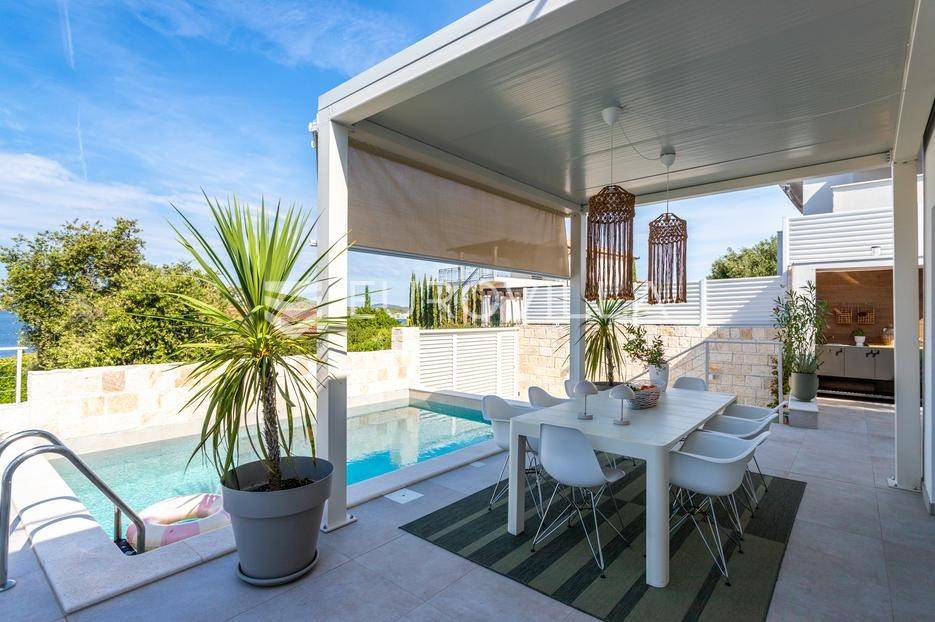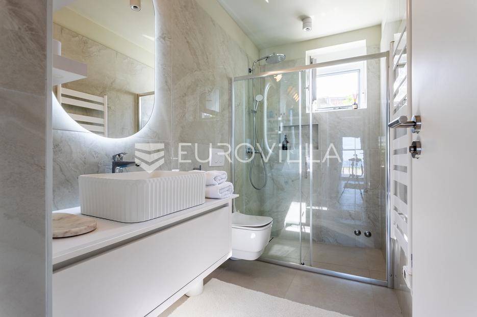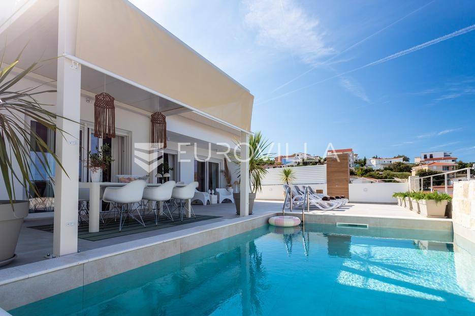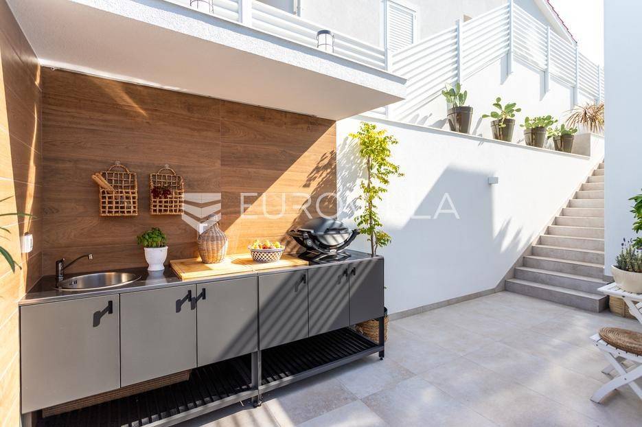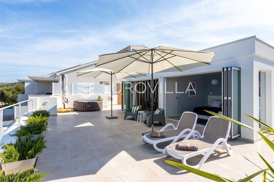 Rogoznica, Ražanj, prekrasna kuća s bazenom i pogledom na more, ukupne površine 390,51 m² te neto korisne površine 246,67 m² u potpunosti renovirana 2024. godine. Prodaje se potpuno namještena i opremljena, te idealna za odmor ili turistički najam.Izgrađena na 2 etaže na parceli od 398 m². Sastoji se od prizemlja u kojem se nalazi prostrani dnevni boravak, kuhinja i blagovaonica, 3 spavaće sobe, dvije kupaonice te vešeraj i walk in ormar. Iz boravka i blagovaonice izlazi se na prostranu terasu s bazenom, sunčalištem, prostorom za roštiljanje i pogledom na more. Vanjskim stepenicama dolazi se na kat gdje se nalazi zaseban apartman koji se sastoji od dnevnog boravka s kuhinjom i blagovaonicom, jedne spavaće sobe i kupaonice. Velike staklene površine apartmana se u potpunosti otvaraju te apartman postaje jedno s terasom na kojoj je jacuzzi, sunčalište i vanjski tuš. Stepenicama iz prizemlja se spušta u garažu za dva automobila.Kuća je građena po vrhunskim standardima, te je uređena dizajnerskim namještajem. Svaka prostorija ima klima uređaj, te je ugrađeno podno grijanje. Od opreme kuća ima solarne panele snage 6Kw, video nadzor, pripremu za punionicu za el. aute, garažna vrata na daljinsko upravljanje te vrhunske kuhinjske aparate. Kuća je na odličnoj lokaciji, manje od 50 metara od mora. U moru ispred kuće vlasnik ima i corpo morto, tako da kupac može imati i brod odmah ispred kuće.Sve ostale informacije na upit.... Više na eurovilla.hr, ID: 145955
