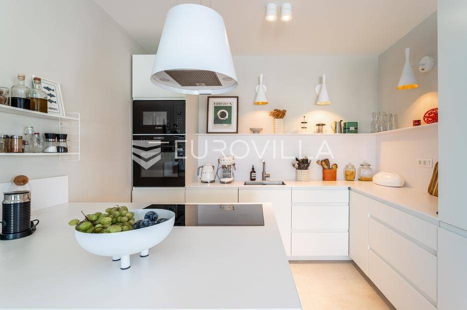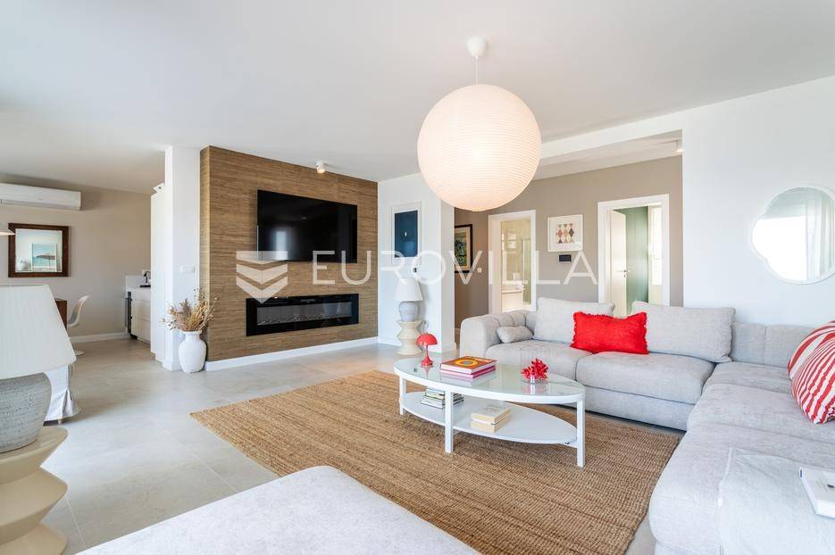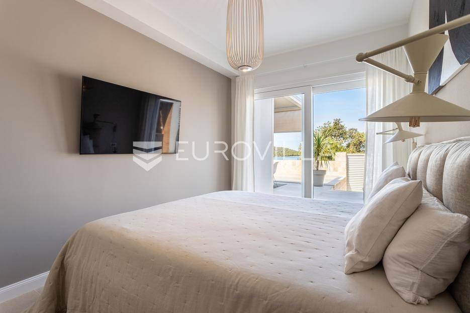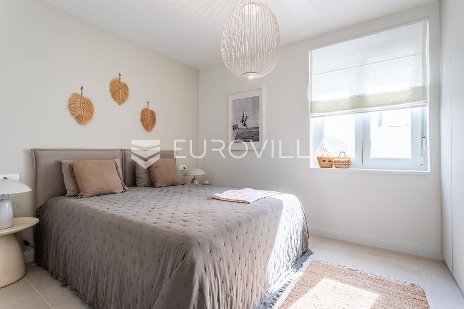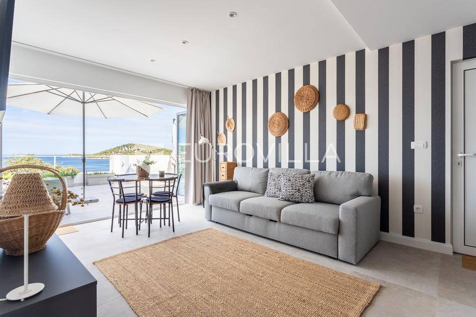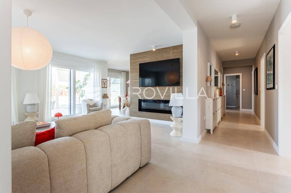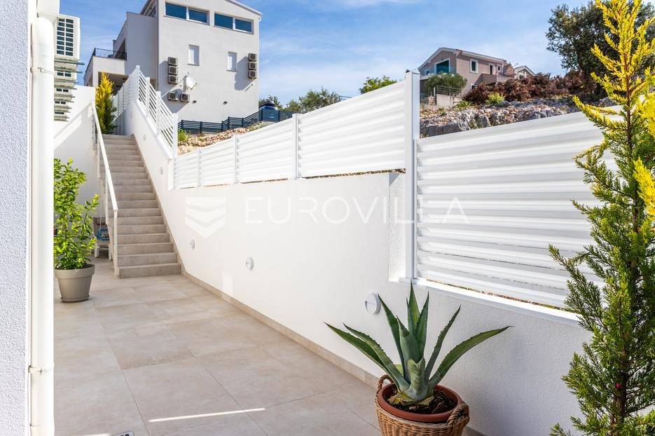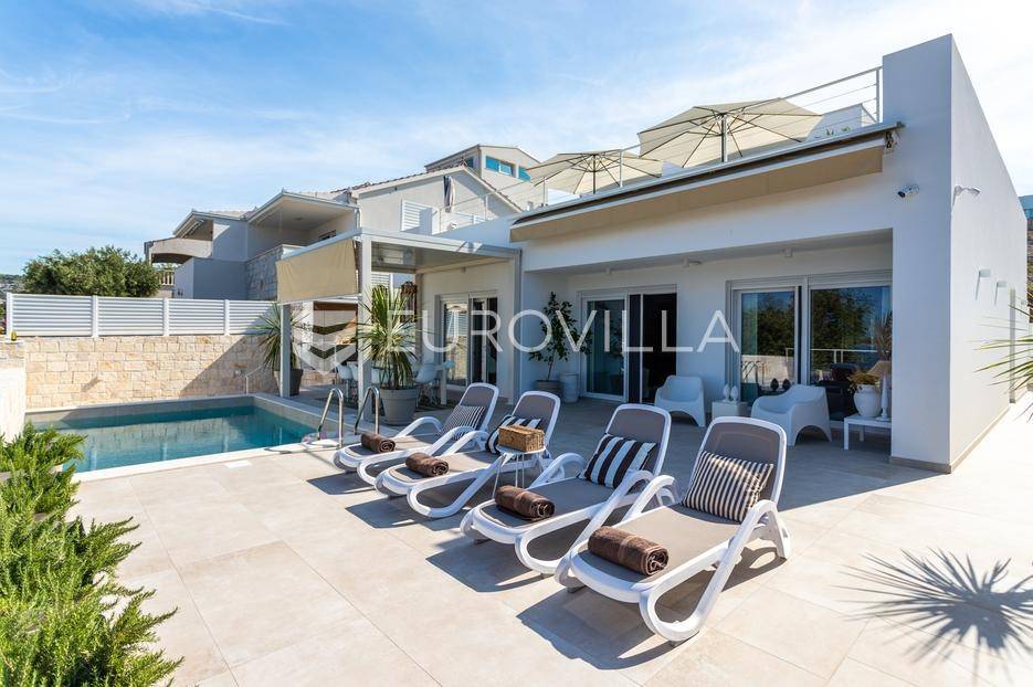 Rogoznica, Ražanj, prekrasna kuća s bazenom i pogledom na more, ukupne površine 390,51 m² te neto korisne površine 246,67 m² u potpunosti renovirana 2024. godine. Prodaje se potpuno namještena i opremljena, te idealna za odmor ili turistički najam.Izgrađena na 2 etaže na parceli od 398 m². Sastoji se od prizemlja u kojem se nalazi prostrani dnevni boravak, kuhinja i blagovaonica, 3 spavaće sobe, dvije kupaonice te vešeraj i walk in ormar. Iz boravka i blagovaonice izlazi se na prostranu terasu s bazenom, sunčalištem, prostorom za roštiljanje i pogledom na more. Vanjskim stepenicama dolazi se na kat gdje se nalazi zaseban apartman koji se sastoji od dnevnog boravka s kuhinjom i blagovaonicom, jedne spavaće sobe i kupaonice. Velike staklene površine apartmana se u potpunosti otvaraju te apartman postaje jedno s terasom na kojoj je jacuzzi, sunčalište i vanjski tuš. Stepenicama iz prizemlja se spušta u garažu za dva automobila.Kuća je građena po vrhunskim standardima, te je uređena dizajnerskim namještajem. Svaka prostorija ima klima uređaj, te je ugrađeno podno grijanje. Od opreme kuća ima solarne panele snage 6Kw, video nadzor, pripremu za punionicu za el. aute, garažna vrata na daljinsko upravljanje te vrhunske kuhinjske aparate. Kuća je na odličnoj lokaciji, manje od 50 metara od mora. U moru ispred kuće vlasnik ima i corpo morto, tako da kupac može imati i brod odmah ispred kuće.Sve ostale informacije na upit.... Više na eurovilla.hr, ID: 145955