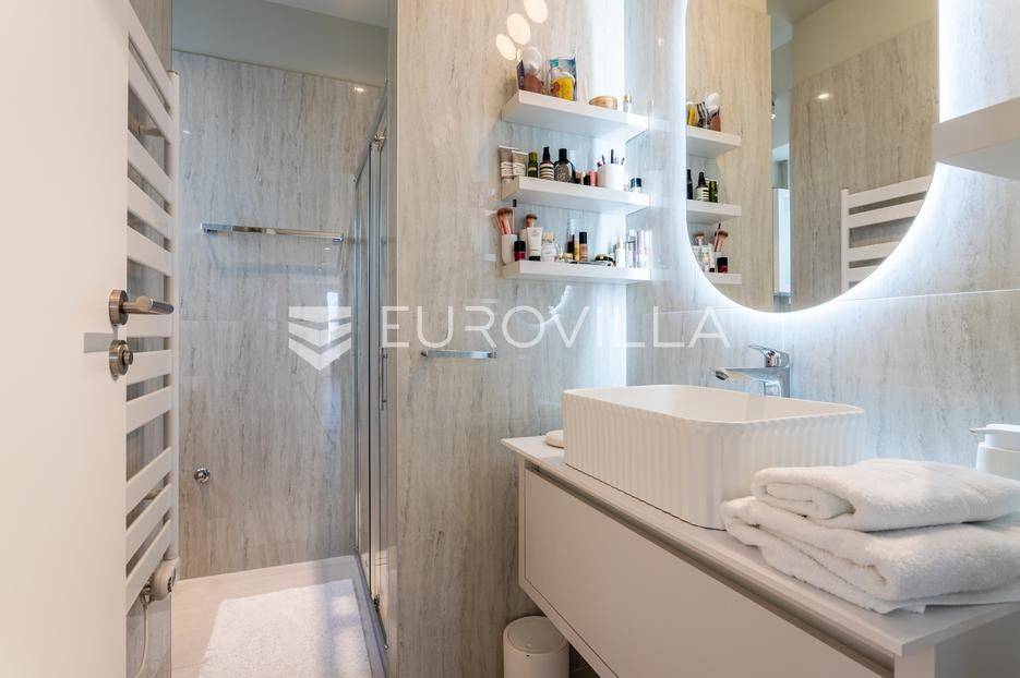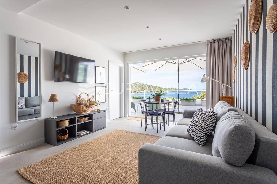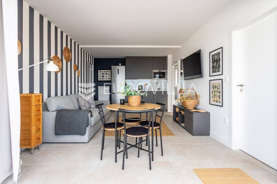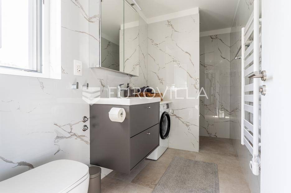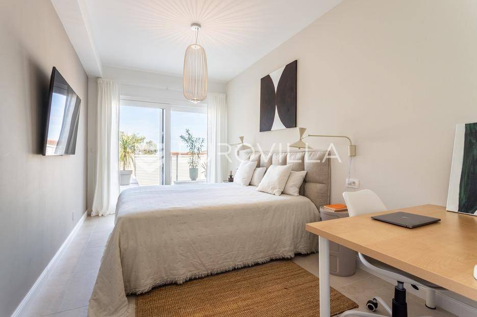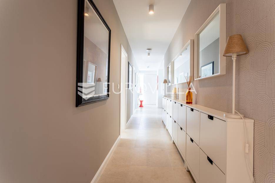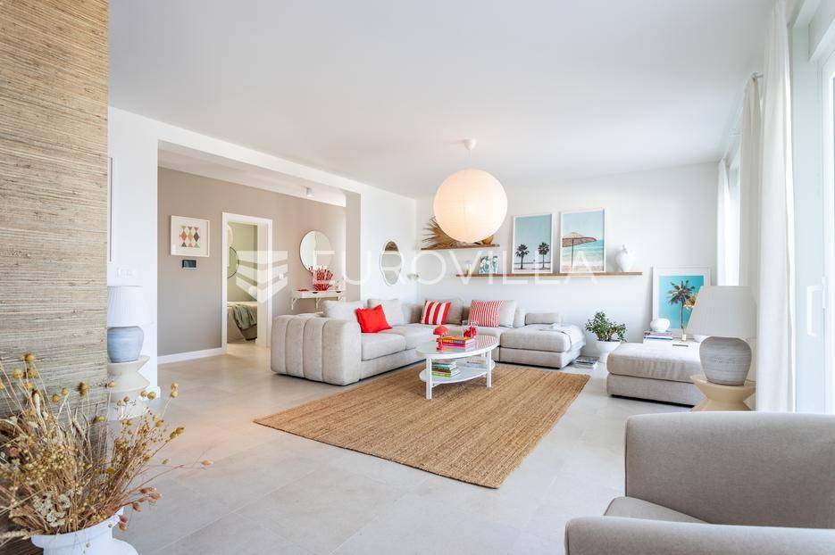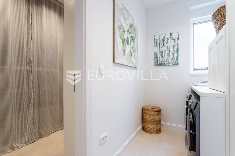 Rogoznica, Ražanj, prekrasna kuća s bazenom i pogledom na more, ukupne površine 390,51 m² te neto korisne površine 246,67 m² u potpunosti renovirana 2024. godine. Prodaje se potpuno namještena i opremljena, te idealna za odmor ili turistički najam.Izgrađena na 2 etaže na parceli od 398 m². Sastoji se od prizemlja u kojem se nalazi prostrani dnevni boravak, kuhinja i blagovaonica, 3 spavaće sobe, dvije kupaonice te vešeraj i walk in ormar. Iz boravka i blagovaonice izlazi se na prostranu terasu s bazenom, sunčalištem, prostorom za roštiljanje i pogledom na more. Vanjskim stepenicama dolazi se na kat gdje se nalazi zaseban apartman koji se sastoji od dnevnog boravka s kuhinjom i blagovaonicom, jedne spavaće sobe i kupaonice. Velike staklene površine apartmana se u potpunosti otvaraju te apartman postaje jedno s terasom na kojoj je jacuzzi, sunčalište i vanjski tuš. Stepenicama iz prizemlja se spušta u garažu za dva automobila.Kuća je građena po vrhunskim standardima, te je uređena dizajnerskim namještajem. Svaka prostorija ima klima uređaj, te je ugrađeno podno grijanje. Od opreme kuća ima solarne panele snage 6Kw, video nadzor, pripremu za punionicu za el. aute, garažna vrata na daljinsko upravljanje te vrhunske kuhinjske aparate. Kuća je na odličnoj lokaciji, manje od 50 metara od mora. U moru ispred kuće vlasnik ima i corpo morto, tako da kupac može imati i brod odmah ispred kuće.Sve ostale informacije na upit.... Više na eurovilla.hr, ID: 145955