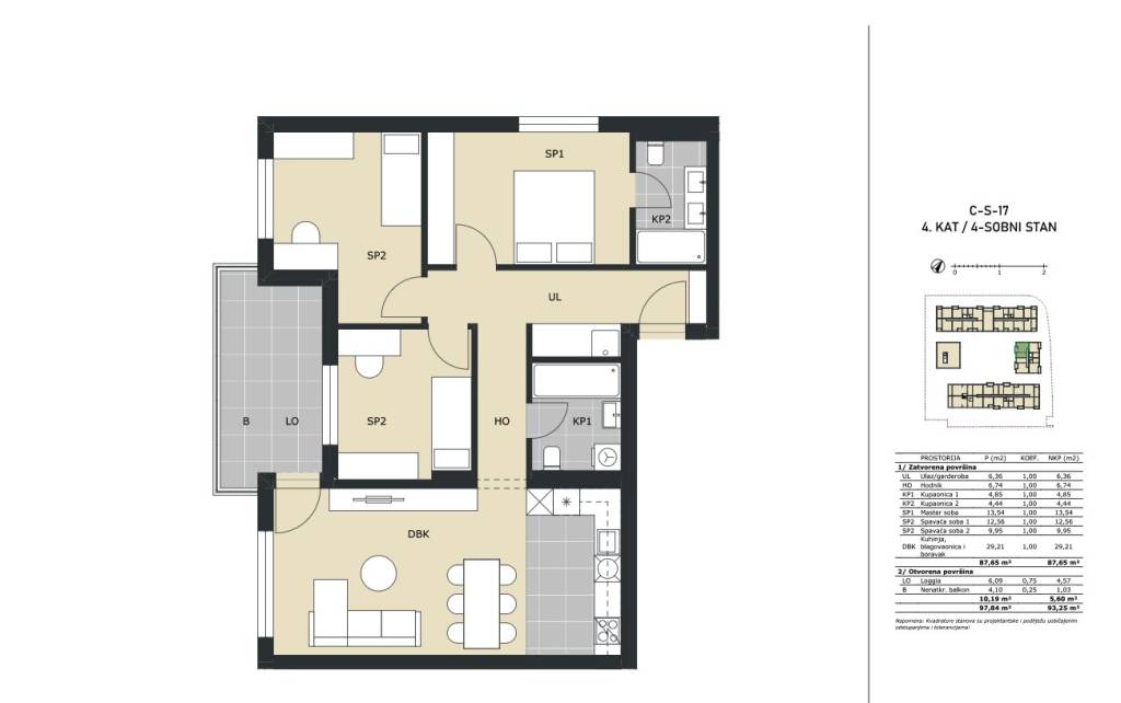 Četverosoban stan na 4. katu stambene zgrade zatvorene površine 87,65 m2 s natkrivenim balkonom 4,10 m2 (1,03 m2) te loggijom 6,09 m2 (4,57 m2), ukupne neto površine 93,25 m2.Stan C-17 sastoji se od ulaznog hodnika, 2 kupaonice, 3 spavaće sobe, garderobe, kuhinje s blagovaonicom te dnevnog boravka.Obvezna kupnja spremišta, vanjskog ili garažnog parkirnog mjesta.Stan se nalazi u višestambenoj zgradi unutar kompleksa koji će se sastojati od 165 stambenih jedinica.Green Side Residence nalazi se u Velikoj Gorici, samo 10 kilometara od Zagreba i tek 3 kilometra od Međunarodne zračne luke Zagreb, lokacija nudi izvrsnu prometnu povezanost s glavnim gradom i cijelom Hrvatskom, zahvaljujući neposrednom pristupu dvjema autocestama.Okružen zelenilom, a opet u blizini svih gradskih sadržaja, ovaj projekt predstavlja idealan izbor za miran, ali povezan život.Useljenje 11/2027. godine.Za sve ostale informacije stojimo na raspolaganju.... Više na eurovilla.hr, ID: 157368