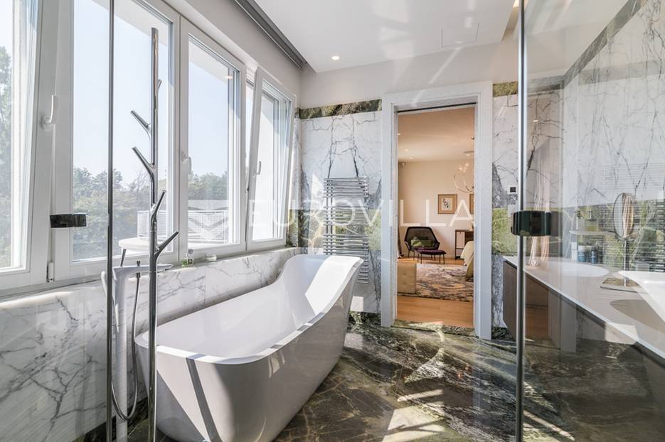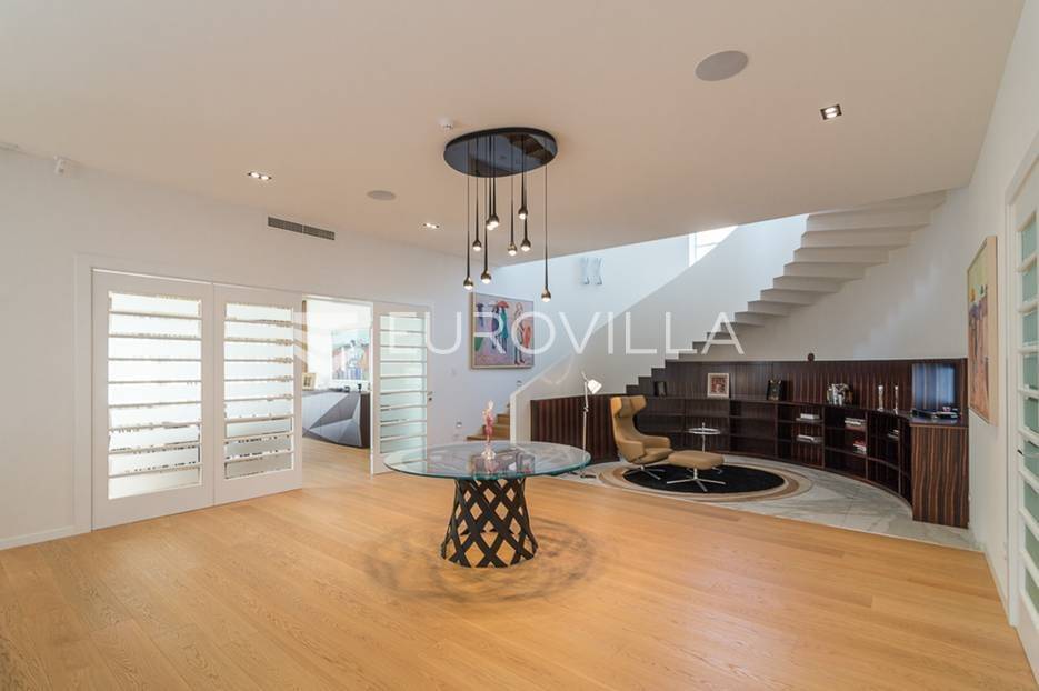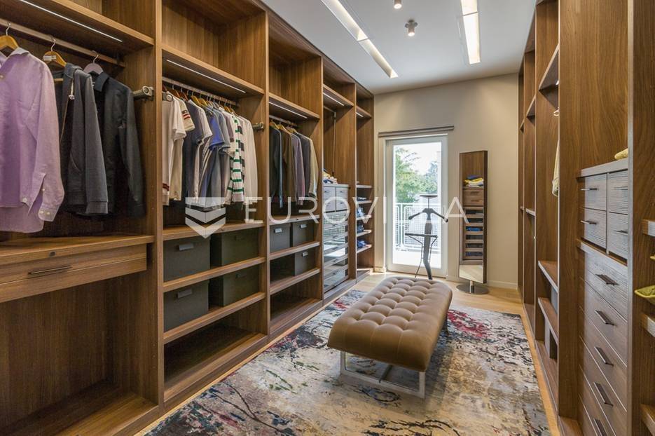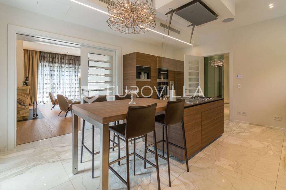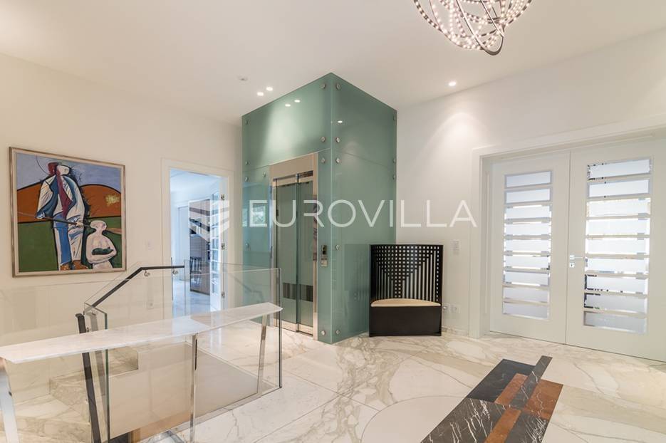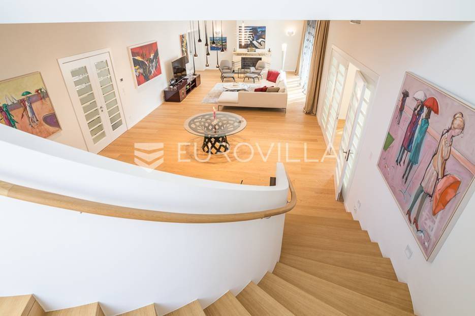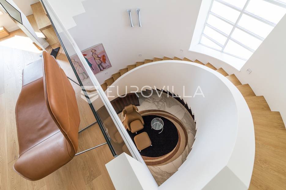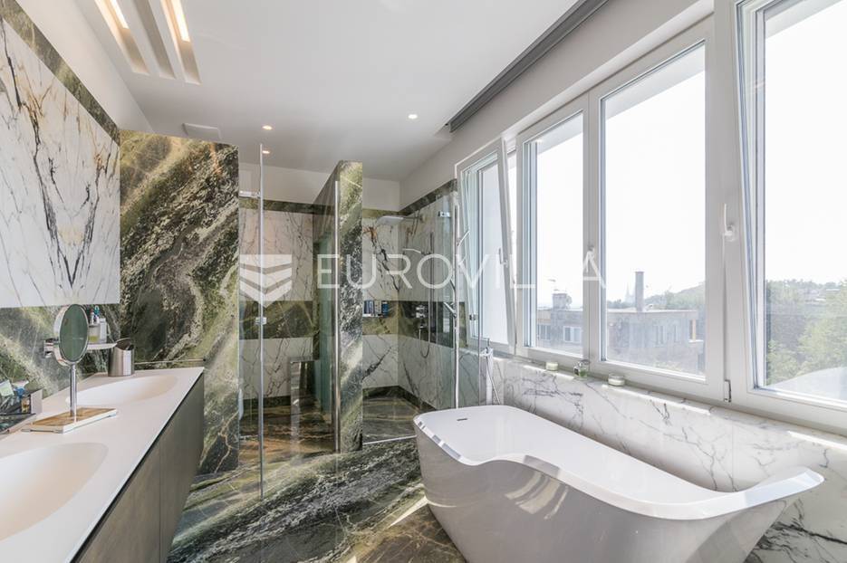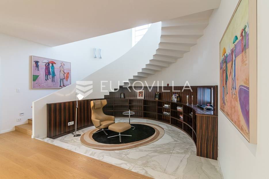 Tuškanac, luksuzna obiteljska vila na najljepšoj i najskupljoj lokaciji u Zagrebu.Razvedena u četiri etaže, smještena uz sjeverni rub parcele kako bi se prostorije za dnevni boravak što više orjentirale prema jugu i prema vrtu.Podrum: strojarnica, toalet, vešeraj, ulaz za poslugu, kotlovnica, jacuzzi, finska i turska sauna, teretana, ljetna kuhinja, vinski podrum i mali boravak sa izlazom na vrt, bazen i ljetnu kuhinju...Prizemlje: ulazni hodnik, ogroman dnevni boravak s čitaonicom, blagovaonica, otvoreni prema terasi iz koje se silazi u vrt, kuhinja, toalet, garderoba.Kat: galerija, 2 dječje sobe s kupaonicama, prostrana master spavaća soba s garderobom, kupaonicom i terasom.II kat: gostinjska soba s kupaonom, wc, terasa i drugi dnevni boravak te radna soba / safe room.Krov: ravan i uređen sa jacuzziem i pogledom na cijeli Zagreb.Kroz cijelu vilu proteže se monumentalno spiralno stubište te lift.Ostale informacije na upit.... Više na eurovilla.hr, ID: 168870