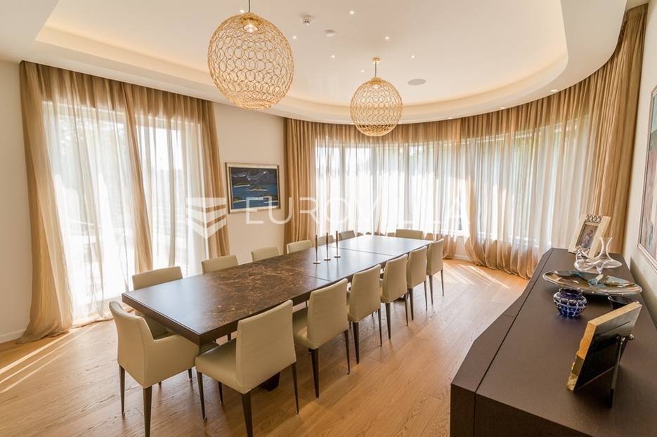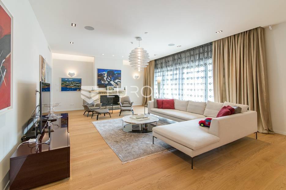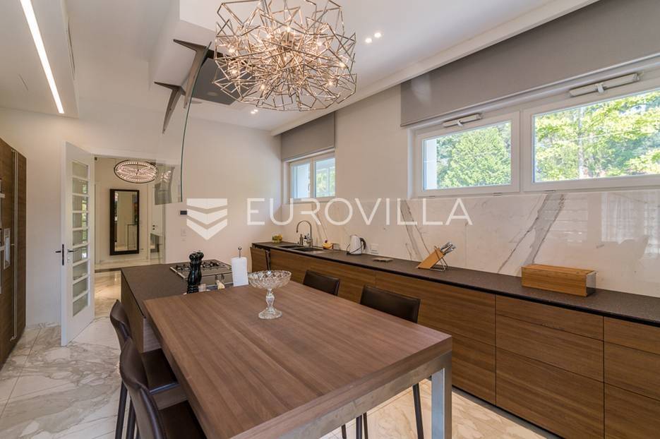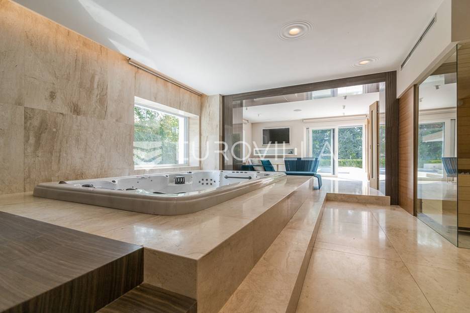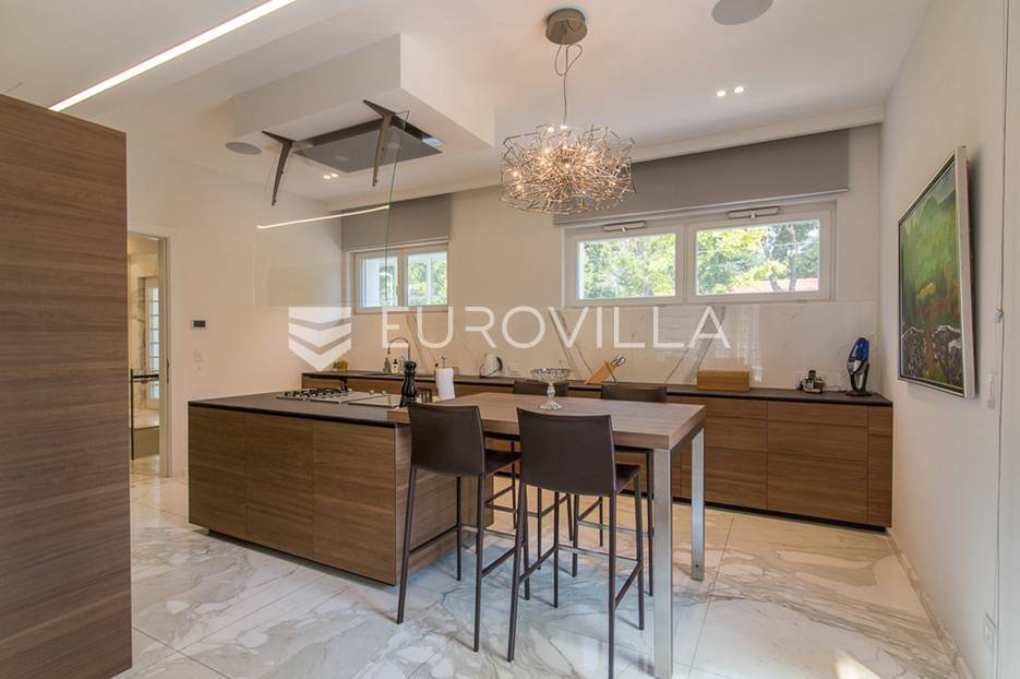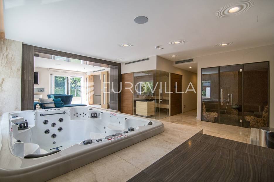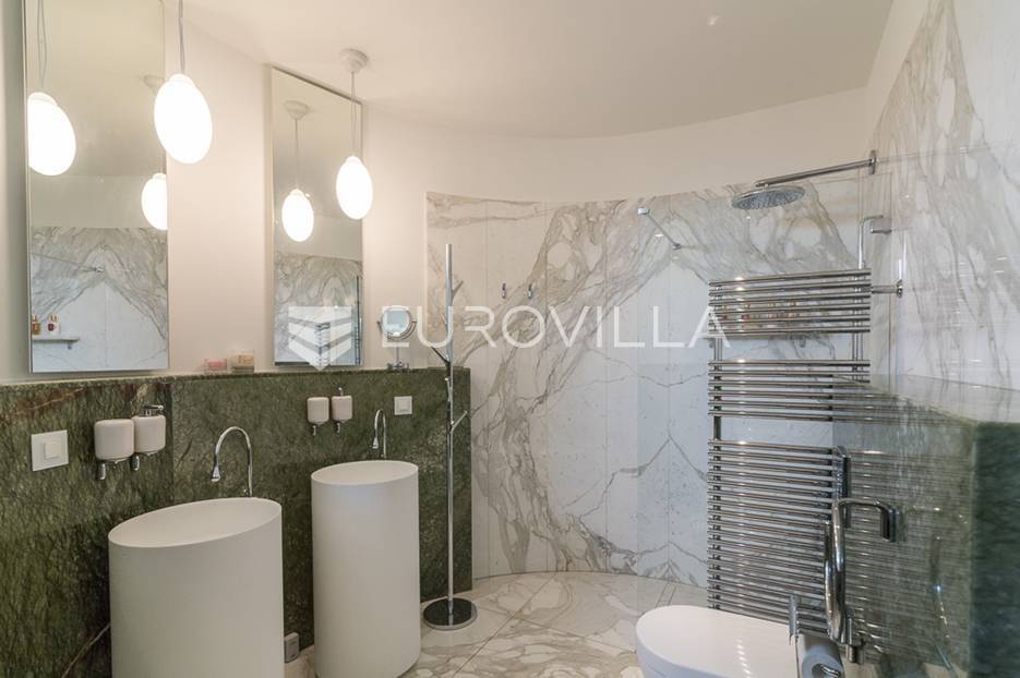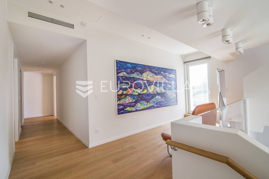 Tuškanac, luksuzna obiteljska vila na najljepšoj i najskupljoj lokaciji u Zagrebu.Razvedena u četiri etaže, smještena uz sjeverni rub parcele kako bi se prostorije za dnevni boravak što više orjentirale prema jugu i prema vrtu.Podrum: strojarnica, toalet, vešeraj, ulaz za poslugu, kotlovnica, jacuzzi, finska i turska sauna, teretana, ljetna kuhinja, vinski podrum i mali boravak sa izlazom na vrt, bazen i ljetnu kuhinju...Prizemlje: ulazni hodnik, ogroman dnevni boravak s čitaonicom, blagovaonica, otvoreni prema terasi iz koje se silazi u vrt, kuhinja, toalet, garderoba.Kat: galerija, 2 dječje sobe s kupaonicama, prostrana master spavaća soba s garderobom, kupaonicom i terasom.II kat: gostinjska soba s kupaonom, wc, terasa i drugi dnevni boravak te radna soba / safe room.Krov: ravan i uređen sa jacuzziem i pogledom na cijeli Zagreb.Kroz cijelu vilu proteže se monumentalno spiralno stubište te lift.Ostale informacije na upit.... Više na eurovilla.hr, ID: 168870