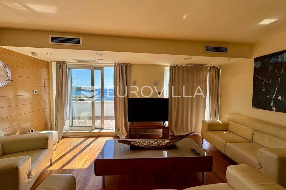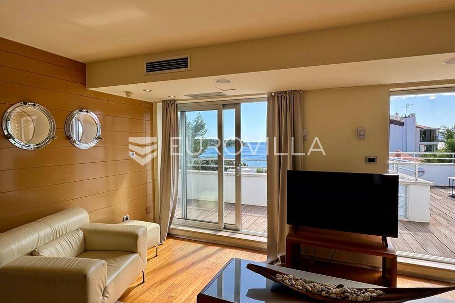 U najljepšem djelu grada predstavljamo predivan penthouse sa spektakularnim pogledom na more, dostupan za dugoročan najam.Stan se smjestio na drugom i posljednjem katu luksuzne vile s bazenom, dok posebnu privatnost pruža zaseban ulaz vanjskim stubištem.U 100 m2 stambenog prostora savršeno su se rasporedili dnevni boravak, kuhinja s blagovaonicom, dvije spavaće sobe te kupaonica s jacuzzijem.Dnevni boravak kao i spavaće sobe su velikim i funkcionalnim staklenim stijenama povezani s prostranom privatnom terasom površine 50 m2 s koje se pruža predivan pogled.Nekretnina je smještena prvi red do mora i pripada joj jedno vanjsko parkirno mjesto.Za sva dodatna pitanja, potrebne informacije ili želju za organizacijom termina razgleda stana slobodno nas kontaktirajte!... Više na eurovilla.hr, ID: 169079