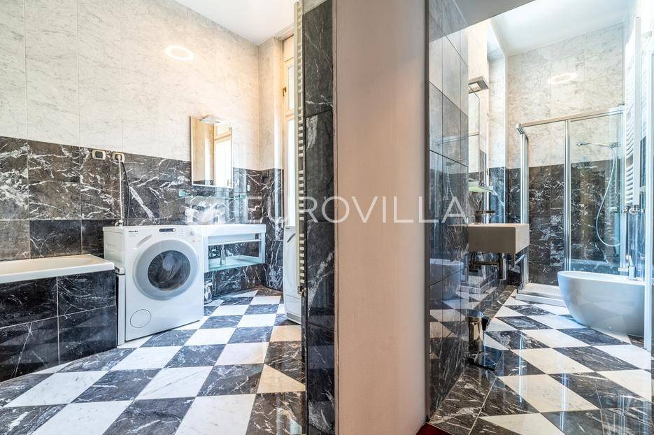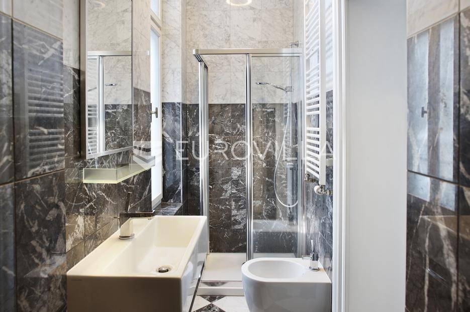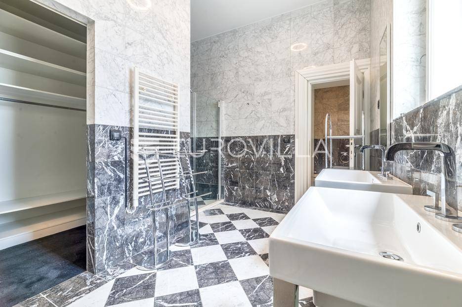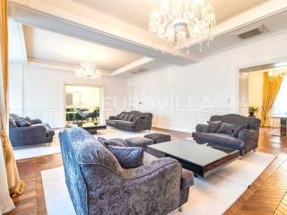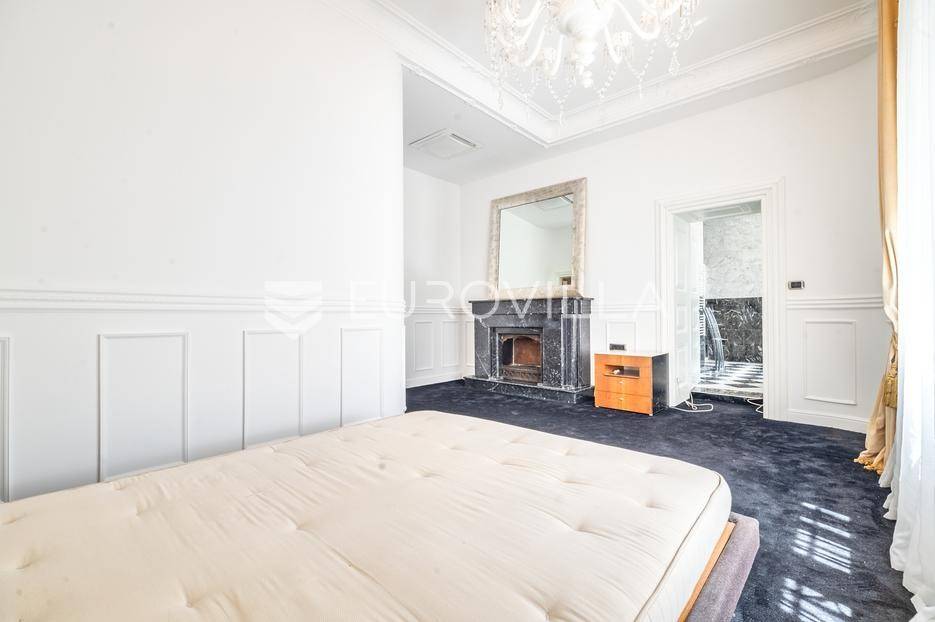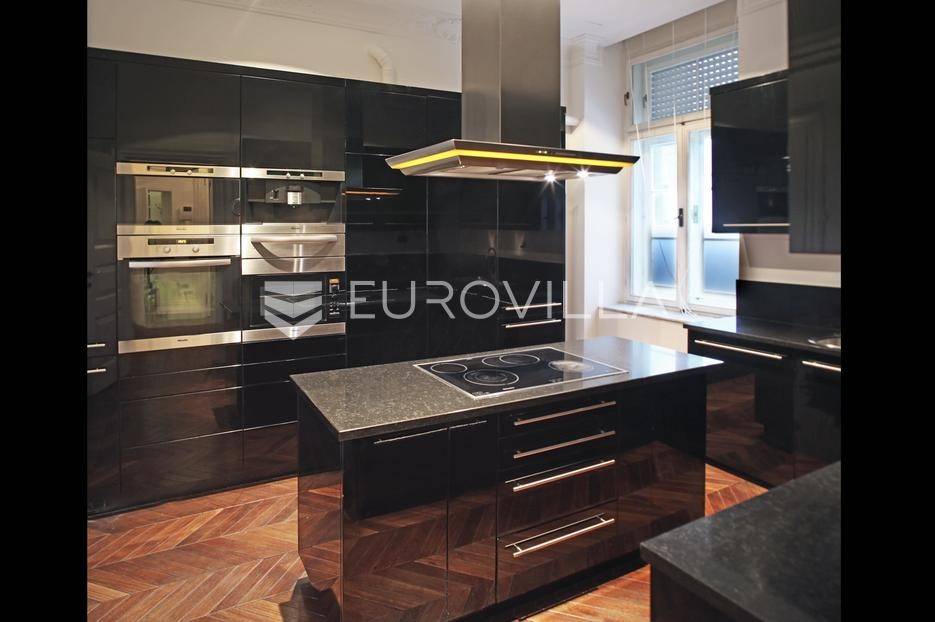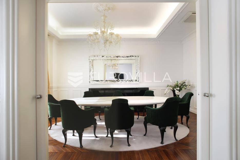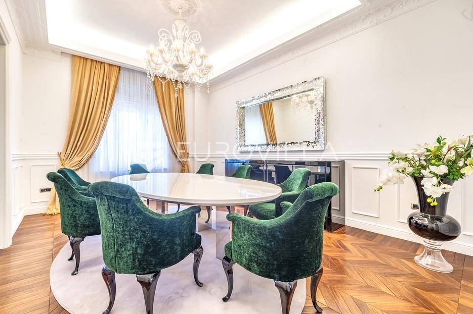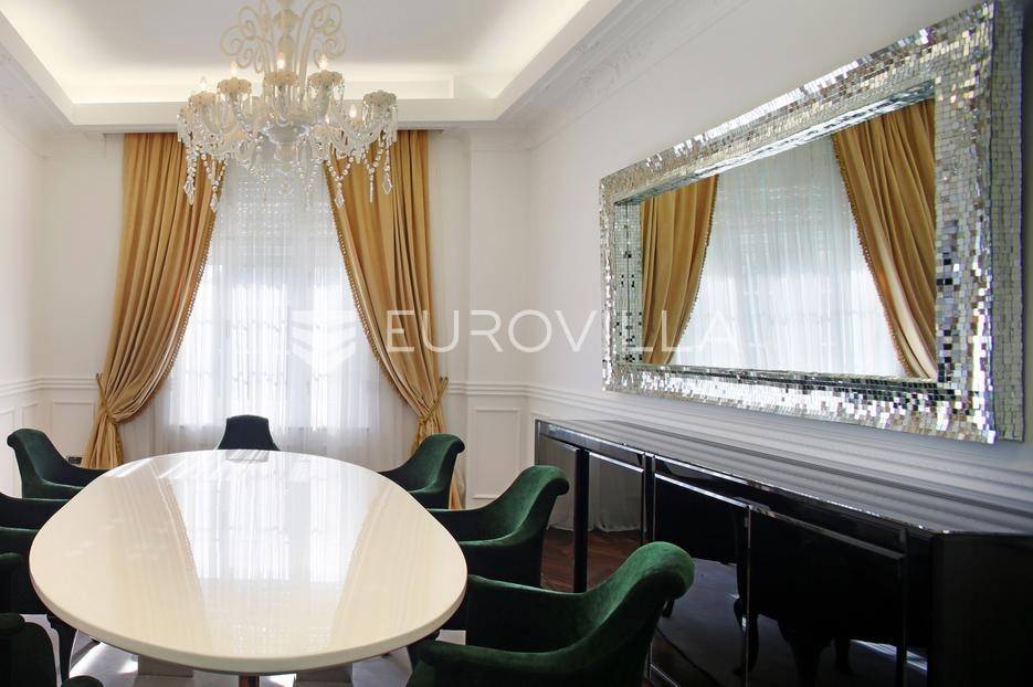 Izuzetno lijepo uređen i luksuzan stan površine 280 m², smješten na drugom katu, jedini na etaži. Ova nekretnina se nalazi na jednoj od najpoželjnijih lokacija u gradu, unutar Lenucijeve potkove, u mirnom okruženju s minimalnim prometom i prekrasnim pogledom na park.Stan je pretežno orijentiran prema zapadu, što osigurava obilje prirodne svjetlosti i ugodne poglede na okolni zeleni krajolik. Kompletno je adaptiran, s novim instalacijama, betonskom dekom, spuštenim stropom visine 345 cm, te novom vanjskom stolarijom s dvostrukim staklima. Osim toga, stan se može pohvaliti izvrsnom izolacijom, najkvalitetnijim parketima te kamenim površinama u kuhinji i kupaonicama.Raspored prostorija pažljivo je osmišljen: prekrasan ulazni hodnik, toalet za goste, garderoba za cipele, prostrana kuhinja s otokom, blagovaonica, ogroman dnevni boravak, radna soba, te potpuno odvojen spavaći dio. Spavaći dio uključuje master spavaću sobu s vlastitom kupaonicom i garderobom, dvije dječje spavaće sobe, dvije dodatne kupaonice i toalet.Stan je opremljen vrhunskim dizajnerskim namještajem i rasvjetnim tijelima, pri čemu je pažnja posvećena svakom detalju. Idealan je kako za stambeni, tako i za poslovni prostor.Za sve dodatne informacije, slobodno nas kontaktirajte.... Više na eurovilla.hr, ID: 196960