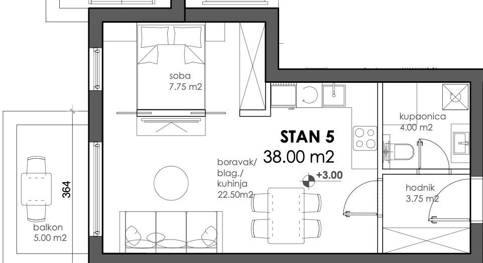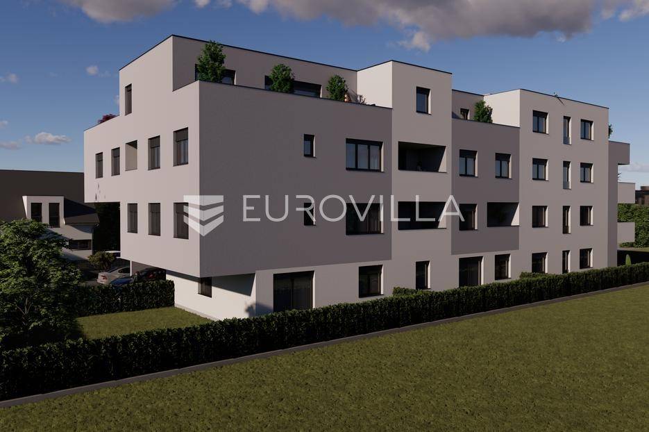 Dvosoban stan zatvorene površine 38 m2 smješten na 1. katu.Sastoji se od hodnika, kupaonice, dnevnog boravka, kuhinje s blagovoanicom, balkona te spavaće sobe.Uz stan je obavezna kupnja i spremišta te parkirnog mjesta.-----Projekt suvremene stambene novogradnje s liftom izvedene u armirano-betonskoj konstrukciji s monolitnim međukatnim pločama. Pregradni zidovi izrađeni su po Knauf sustavu s ispunom od mineralne vune, a zidovi između stanova dodatno su toplinski i zvučno izolirani. Objekt je projektiran s ravnim, neprohodnim krovom u višeslojnoj izvedbi te ETICS fasadom s mineralnom vunom i stiroporom debljine 15 cm i završnim slojem silikatne žbuke.Vanjska PVC stolarija opremljena je toplinski izoliranim roletama na elektromotorni pogon, kliznim stijenama i komarnicima na svim otvorima. Unutarnja stolarija izrađena je od drva, sa zvučno izoliranim vratima, dok su ulazna vrata protuprovalna, protupožarna i zvučno izolirana.Zajednički dijelovi zgrade uključuju ulaz i stubišta obložena granitom, videonadzor, te posebno brojilo plina, vode i struje za svaki stan s mogućnošću daljinskog očitanja. U okolišu su predviđeni asfaltirani i betonski kolni prilazi, hortikulturno uređene zelene površine, dekorativna rasvjeta i odvojeni prostor za spremanje otpada.Stanovi imaju visinu prostorija od od 260 do 270 cm u dnevnim dijelovima i od 250 cm - 260 cm u kupaonicama i hodnicima. Sanitarne prostorije opremljene su kvalitetnim uređajima svjetskih proizvođača poput GROHE i TECE, s fleksibilnom hidroizolacijom, keramikom I. klase te podnim grijanjem. Predviđena je mogućnost odabira između kade ili tuš izvedbe s paravanima od kaljenog stakla. Podovi stanova obloženi su višeslojnim hrastovim parketom, dok su kuhinje, kupaonice i lođe izvedene u keramičkim pločicama.Grijanje i priprema tople vode predviđeni su putem kondenzacijskih plinskih bojlera i podnog grijanja u svim prostorijama, uz termostate u svakoj sobi. Stanovi će biti klimatizirani inverter klima uređajima (multi-split sustav). Ventilacija sanitarnih prostora riješena je niskošumnim ventilatorima, a kuhinje imaju predviđene odsisne sustave.Elektroinstalacije uključuju videoportafon u boji, LED rasvjetu, informatičku mrežu cat 6, utičnice za TV i internet u svakoj sobi te rolete na elektromotorni pogon. Sve kupaonice imaju dodatne priključke i rasvjetu prilagođenu modernom standardu.Investitor daje jamstvo na konstrukciju i hidroizolaciju od 10 godina, na ostale radove 2 godine, a na opremu i uređaje prema jamstvu proizvođača. Posebna pažnja posvećena je odabiru materijala i izvedbi, pri čemu su korišteni isključivo kvalitetni i provjereni sustavi, čime je osigurana trajnost i visoki standard stanovanja.... Više na eurovilla.hr, ID: 235108