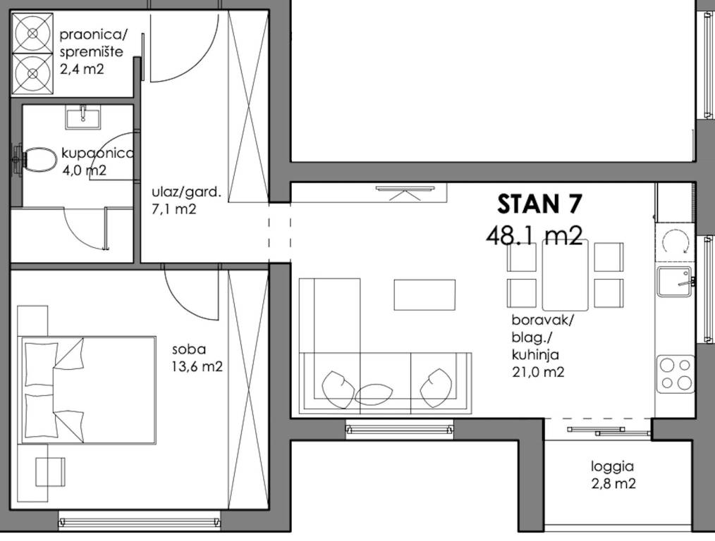 Dvosoban stan zatvorene površine 48,10 m2 smješten na 2. katu.Sastoji se od ulaza/garderobe, spremišta, spavaće sobe, kupaonice, lođe, dnevnog boravka te kuhinje s blagovaonicom.Uz stan je obavezna kupnja spremišta te parkirnog mjesta.-----Projekt suvremene stambene novogradnje s liftom izvedene u armirano-betonskoj konstrukciji s monolitnim međukatnim pločama. Pregradni zidovi izrađeni su po Knauf sustavu s ispunom od mineralne vune, a zidovi između stanova dodatno su toplinski i zvučno izolirani. Objekt je projektiran s ravnim, neprohodnim krovom u višeslojnoj izvedbi te ETICS fasadom s mineralnom vunom i stiroporom debljine 15 cm i završnim slojem silikatne žbuke.Vanjska PVC stolarija opremljena je toplinski izoliranim roletama na elektromotorni pogon, kliznim stijenama i komarnicima na svim otvorima. Unutarnja stolarija izrađena je od drva, sa zvučno izoliranim vratima, dok su ulazna vrata protuprovalna, protupožarna i zvučno izolirana.Zajednički dijelovi zgrade uključuju ulaz i stubišta obložena granitom, videonadzor, te posebno brojilo plina, vode i struje za svaki stan s mogućnošću daljinskog očitanja. U okolišu su predviđeni asfaltirani i betonski kolni prilazi, hortikulturno uređene zelene površine, dekorativna rasvjeta i odvojeni prostor za spremanje otpada.Stanovi imaju visinu prostorija od od 260 do 270 cm u dnevnim dijelovima i od 250 cm - 260 cm u kupaonicama i hodnicima. Sanitarne prostorije opremljene su kvalitetnim uređajima svjetskih proizvođača poput GROHE i TECE, s fleksibilnom hidroizolacijom, keramikom I. klase te podnim grijanjem. Predviđena je mogućnost odabira između kade ili tuš izvedbe s paravanima od kaljenog stakla. Podovi stanova obloženi su višeslojnim hrastovim parketom, dok su kuhinje, kupaonice i lođe izvedene u keramičkim pločicama.Grijanje i priprema tople vode predviđeni su putem kondenzacijskih plinskih bojlera i podnog grijanja u svim prostorijama, uz termostate u svakoj sobi. Stanovi će biti klimatizirani inverter klima uređajima (multi-split sustav). Ventilacija sanitarnih prostora riješena je niskošumnim ventilatorima, a kuhinje imaju predviđene odsisne sustave.Elektroinstalacije uključuju videoportafon u boji, LED rasvjetu, informatičku mrežu cat 6, utičnice za TV i internet u svakoj sobi te rolete na elektromotorni pogon. Sve kupaonice imaju dodatne priključke i rasvjetu prilagođenu modernom standardu.Investitor daje jamstvo na konstrukciju i hidroizolaciju od 10 godina, na ostale radove 2 godine, a na opremu i uređaje prema jamstvu proizvođača. Posebna pažnja posvećena je odabiru materijala i izvedbi, pri čemu su korišteni isključivo kvalitetni i provjereni sustavi, čime je osigurana trajnost i visoki standard stanovanja.... Više na eurovilla.hr, ID: 268387