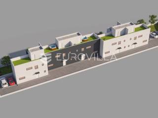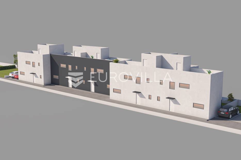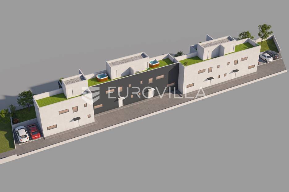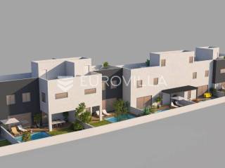 Moderne kuće u nizu s bazenom i jacuzzijem na krovnoj terasi i hortikulturalno uređenim vrtom u 2.redu do mora, na svega 15min vožnje do Zadra. 3 četverosobne kuće cca 110m2 i 2 trosobne kuće cca 95m2.Kuća 1 - četverosobna kuća cca 110m2 sastoji se od prizemlja(kuhinja s blagovaonicom i dnevnim boravkom, kupaonica, toalet, ostava, hodnik i natkrivena terasa), 1.kata(tri spavaće sobe, kupaonica), krovne terase s jacuzzijem, bazena cca 32m2, vrtom i pripadajućim ograđenim poljoprivrednim dijelom cca 150m2. Kupac ima mogućnost postavljanja mobilne kućice, dječjeg igrališta, komina, vrta ili nečeg drugog.Visoko kvalitetna oprema - PVC stolarija, termo-izo fasada, rashladne klima jedinice u svim sobama, troslojno staklo, priprema za videonadzor, hortikulturalno uređen vrt i predio oko bazena, energetski razred "A"Izuzetna lokacija, 2.red do mora, 70m od mora. Svaka kuća s pogledom na more i prekrasne zalaske sunca, u neposrednoj blizini svih za život bitnih sadržaja. Čisto i bistro more te plitke pješčane uvale i blaga mediteranska klima koja ljeta čini toplima čine ju idealnom za obiteljski život i turizam.Početak gradnje se očekuje 11/2022, a planirani završetak radova početkom 2024. godine.Prikazana cijena je cijena s PDV-om.Ostale informacije na upit.... Više na eurovilla.hr, ID: 303080
