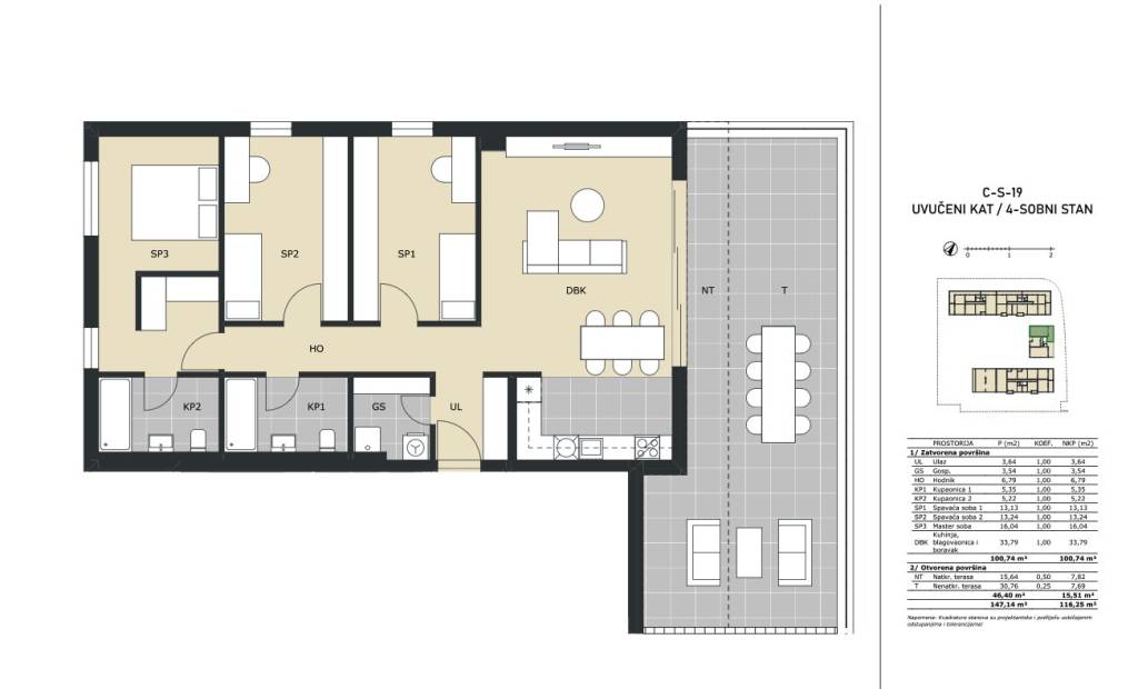 Četverosoban stan na 5. katu stambene zgrade zatvorene površine 100,04 m2 s polunatkrivenom terasom 46,40 m2 (15,51 m2), ukupne neto površine 116,25 m2.Stan C-19 sastoji se od ulaznog hodnika, kuhinje s blagovaonicom i dnevnim boravkom, predsoblja, tri spavaće sobe, dvije kupaonice, polunatkrivene terase i gospodarstva.Obvezna kupnja spremišta, vanjskog ili garažnog parkirnog mjesta.Stan se nalazi u višestambenoj zgradi unutar kompleksa koji će se sastojati od 165 stambenih jedinica.Green Side Residence nalazi se u Velikoj Gorici, samo 10 kilometara od Zagreba i tek 3 kilometra od Međunarodne zračne luke Zagreb, lokacija nudi izvrsnu prometnu povezanost s glavnim gradom i cijelom Hrvatskom, zahvaljujući neposrednom pristupu dvjema autocestama.Okružen zelenilom, a opet u blizini svih gradskih sadržaja, ovaj projekt predstavlja idealan izbor za miran, ali povezan život.Useljenje 11/2027. godine.Za sve ostale informacije stojimo na raspolaganju.... Više na eurovilla.hr, ID: 361548