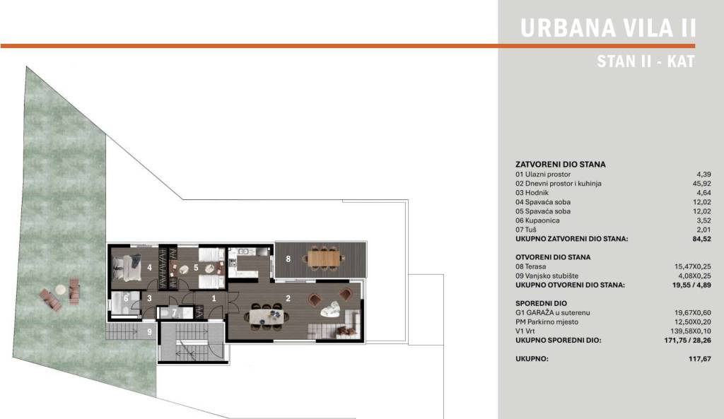 Zagreb, PROJEKT PERJAVICA VIEW trosoban stan s 2 parkirna mjesta ukupne neto površine 117,67 m², koji se nalazi na 1. katu urbane vile u izgradnji.Stan oznake V2-S2 sastoji se od ulaznog prostora, hodnika, 2 spavaće sobe, dnevnog boravka s kuhinjom i blagovaonicom, 2 kupaonice, terase i vrta.Pripadaju mu garažno i vanjsko parkirno mjesto, te su uključeni u cijenu i neto kvadraturu navedenu u oglasu.Očekivano useljenje 12/2026 godine.Grijanje je predviđeno sustavom dizalica topline i podnim grijanjem u svim prostorijama, što osigurava ugodnu i ravnomjernu toplinu te energetsku učinkovitost. Prostor je dodatno klimatiziran.Ugrađuje se aluminijska stolarija s troslojnim staklom, koja pruža dobru toplinsku i zvučnu izolaciju. Podne obloge čine parket i keramičke pločice više klase, dok je zajedničko stubište zgrade izvedeno s kamenim oblogama umjesto standardnih pločica, što dodatno doprinosi kvaliteti i dugotrajnosti izvedbe.Projekt je usmjeren na funkcionalnost, trajnost materijala i suvremeni standard stanovanja.Za sve dodatne informacije stojimo vam na raspolaganju.... Više na eurovilla.hr, ID: 456759