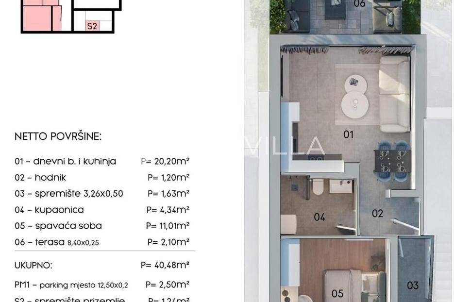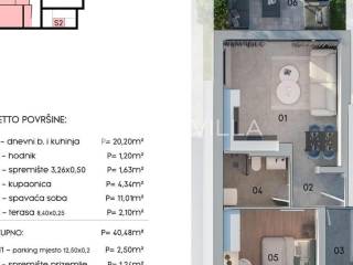 U mirnom dijelu Kaštanjera gradi se moderna novogradnja u obliku dvojne zgrade, u kojoj se nalazi ukupno osam stanova, po četiri u svakoj zgradi. U ponudi je moderan stan A1, smješten u prizemlju zgrade, ukupne neto površine 44,22 m2 koja uključuje stambeni prostor, terasu, vanjsko parkirno mjesto te spremište.Unutarnja stambena površina od 40,48 m2 nudi otvoreni koncept dnevnog boravka s kuhinjom i blagovaonicom, spavaću sobu, kupaonicu, hodnik, spremište i terasu. Uz stan dolazi vanjsko parkirno mjesto te spremište u prizemlju zgrade.Stan je opremljen podnim grijanjem u svim prostorijama osim spavaće sobe, klima-uređajem te električnim roletama na velikoj staklenoj stijeni, što osigurava visoku razinu komfora i energetsku učinkovitost.Završetak radova planiran je 6/2027. godine.U cijenu je uključen PDV, kupac ne plaća porez na promet nekretnina.Za više informacija ili dogovor oko razgledavanja, stojimo Vam na raspolaganju.... Više na eurovilla.hr, ID: 507670