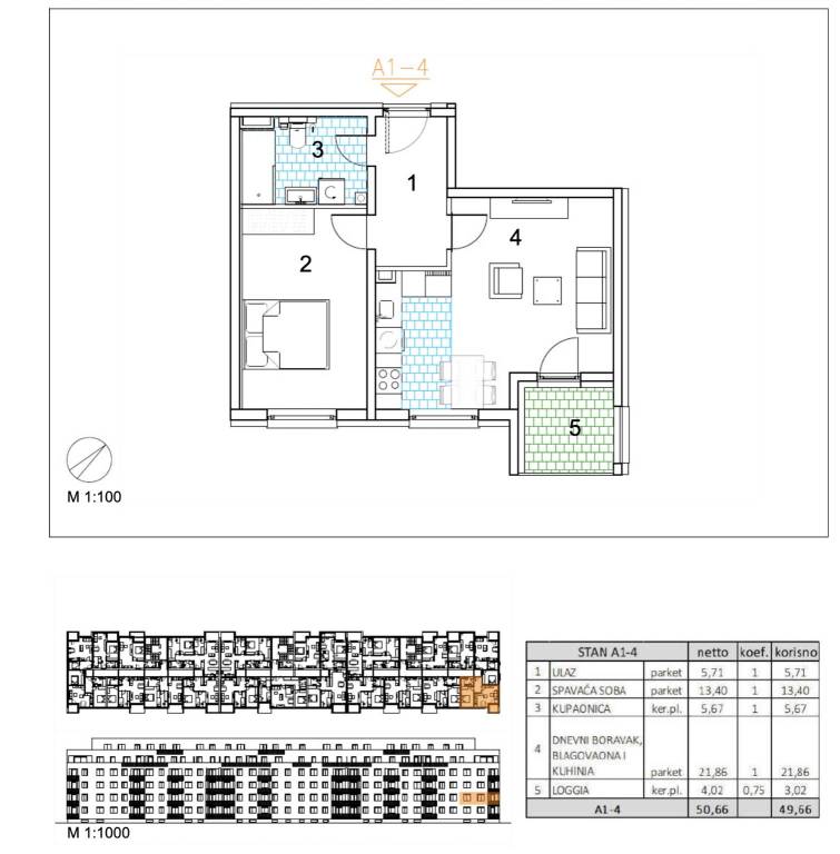 Dvosoban stan površine 49,66 m2 smješten u prizemlju.Stan A1-4 sastoji se od ulaza, spavaće sobe, kupaonice, dnevnog boravka te loggije.Velika Gorica, projekt stambene novogradnje namijenjen stalnom stanovanju, koji obuhvaća 91 stambenu jedinicu. U sklopu zgrade osigurano je ukupno 182 garažnih i parkirnih mjesta, od čega je 28 garažnih mjesta smješteno u prizemlju, 97 garažnih i parkirnih mjesta u podzemnoj etaži te dodatnih 57 parkirnih mjesta na razini terena.Uz kupnju stana obavezna je kupnja garažnog mjesta na -1 etaži po cijeni od 25.000,00 EUR ili garažnog mjesta na 0 etaži po cijeni od 30.000,00 EUR zajedno s parkirnim garažnim mjestom po cijeni od 18.000,00 EUR ili vanjskim parkirnim mjestom po cijeni od 10.000,00 EUR. Dakle, garažno mjesto na -1 etaži ili garažno mjesto na 0 etaži + garažno parkirno mjesto ili vanjsko parkirno mjesto.Građevina je projektirana kao armiranobetonska konstrukcija, međusobno povezana zidovima i gredama, s punim armiranobetonskim stropnim pločama i ravnim krovom. Vertikalni konstruktivni sustav čine armiranobetonski zidovi debljine 20 cm izvedeni kroz sve etaže, dok horizontalni sustav čine armiranobetonske ploče debljine 20 cm.Pročelje je predviđeno s toplinskom izolacijom debljine 15 cm u ETICS sustavu, izvedenom od EPS-a, a u zonama požarnih prekida, u kontaktu sa stubištem i na podgledu prizemlja od mineralne vune iste debljine. Završna obrada izvodi se armiranom mrežicom, gletanjem i završnim slojem u boji i teksturi prema projektu. Vanjska stolarija predviđena je kao PVC, u tonu definiranom projektom.Krov je projektiran kao ravni neprohodni krov, a svi slojevi izvedeni su u skladu s projektom fizike zgrade. Unutarnji pregradni zidovi izvode se kao gipskartonski, debljine 10 do 20 cm, ovisno o namjeni prostora, uz primjenu potrebne zvučne izolacije gdje je to predviđeno. Zidne površine su završno obrađene soboslikarskim radovima u boji prema projektu.Podovi u stanovima izvode se kao plivajući sustav s toplinskom izolacijom od polistirena i cementnim estrihom. Završne podne obloge predviđene su prema namjeni prostora: keramika u sanitarijama, kuhinjama i na vanjskim površinama, a troslojni hrastov parket u dnevnim boravcima, blagovaonicama, ulaznim prostorima i spavaćim sobama. U ponudi su tri varijante keramičkih pločica.Grijanje je riješeno plinskim etažnim podnim sustavom. Stanovi su opremljeni klima uređajima marke Bosch, PVC stolarijom s električnim roletama, troslojnim hrastovim parketom te sobnim vratima proizvođača RV Križevci. Ulazna vrata u stanove su protuprovalna, proizvođača Kolnoa sa sustavom zaključavanja Multilock.Useljenje 05/27Za sva pitanja Vam stojimo na raspolaganju.... Više na eurovilla.hr, ID: 597121