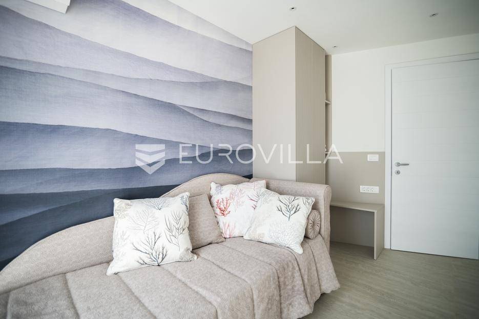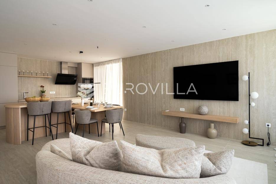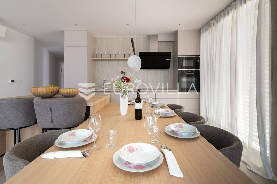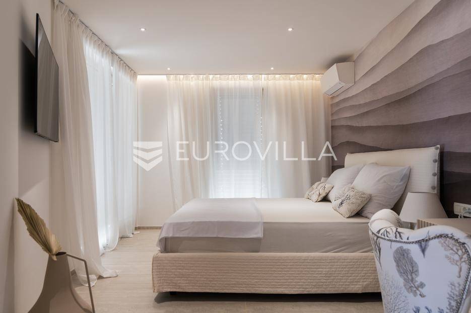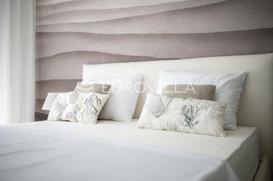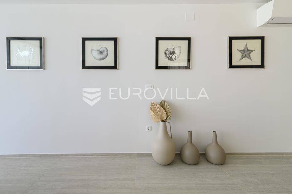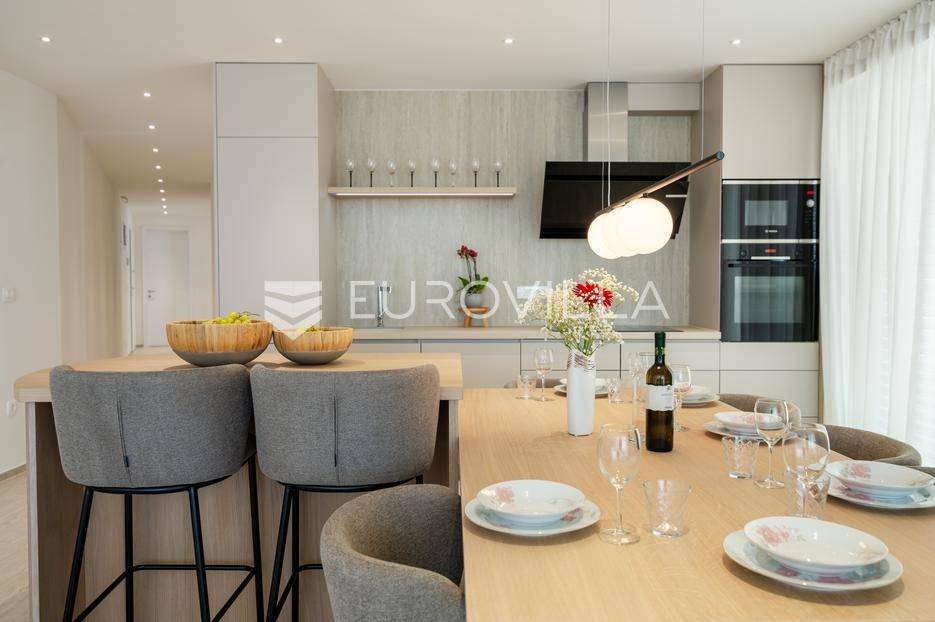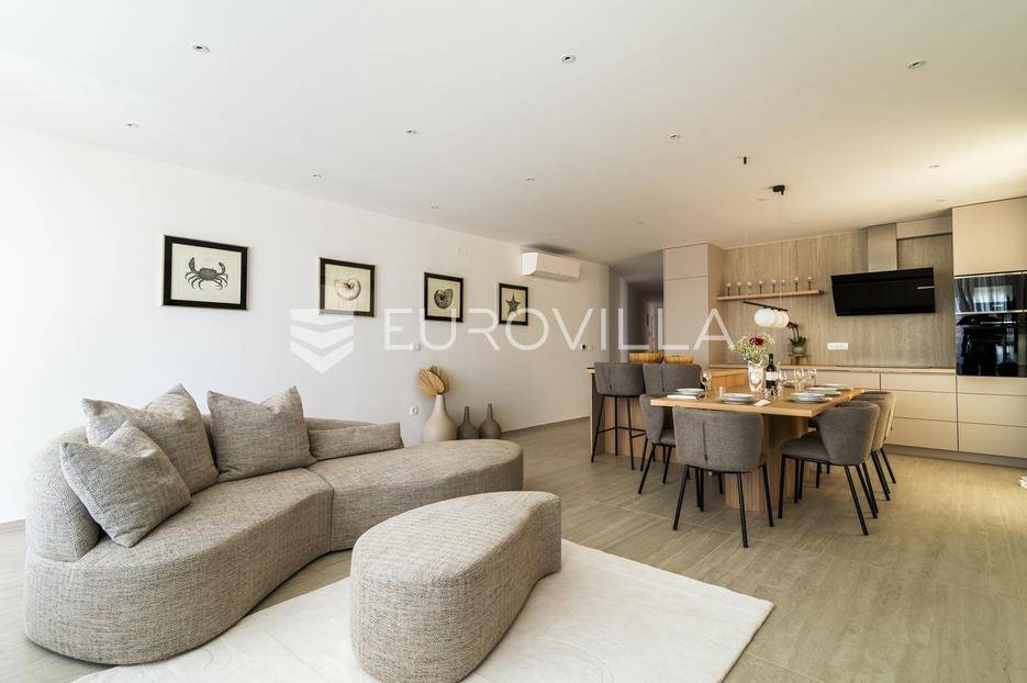 U ponudi je luksuzni stan površine 125,75 m² smješten na prvom katu moderne zgrade novije gradnje s ukupno osam stambenih jedinica i liftom.Stan je potpuno uređen, moderno namješten i opremljen visokokvalitetnim Bosch uređajima te se prodaje kompletno namješten. Posebna pažnja posvećena je funkcionalnosti, kvaliteti materijala i udobnosti stanovanja.Sastoji se od:ulaznog hodnikaostave s perilicom rubljagostinjskog WC-amaster spavaće sobe s vlastitom kupaonicom i izlazom na natkriveni balkondvije dodatne spavaće sobe sa zajedničkom kupaonicomprostranog open space prostora koji obuhvaća kuhinju s otokom, blagovaonicu i dnevni boravak s izlazom na natkrivenu terasu s pogledom na moreStan je opremljen podnim grijanjem putem dizalice topline te s četiri klima uređaja, što osigurava maksimalnu udobnost tijekom cijele godine.Uz stan dolaze:dva parkirna mjestadodatna ostavazajedničko korištenje grijanog bazena sa slanom vodomsaunateretanaLokacija je iznimna - svega 50 metara od prekrasnih plaža. U neposrednoj blizini nalaze se kvalitetni restorani, kafići, šetnice, biciklističke staze, trgovina, škola, dječje igralište i svi ostali potrebni sadržaji za ugodan život ili luksuzan odmor.Nekretnina predstavlja idealan izbor za obiteljski život, ali i izvrsnu investiciju na atraktivnoj lokaciji uz more.Za više informacija i dogovor razgledavanja stojimo Vam na raspolaganju.... Više na eurovilla.hr, ID: 823425