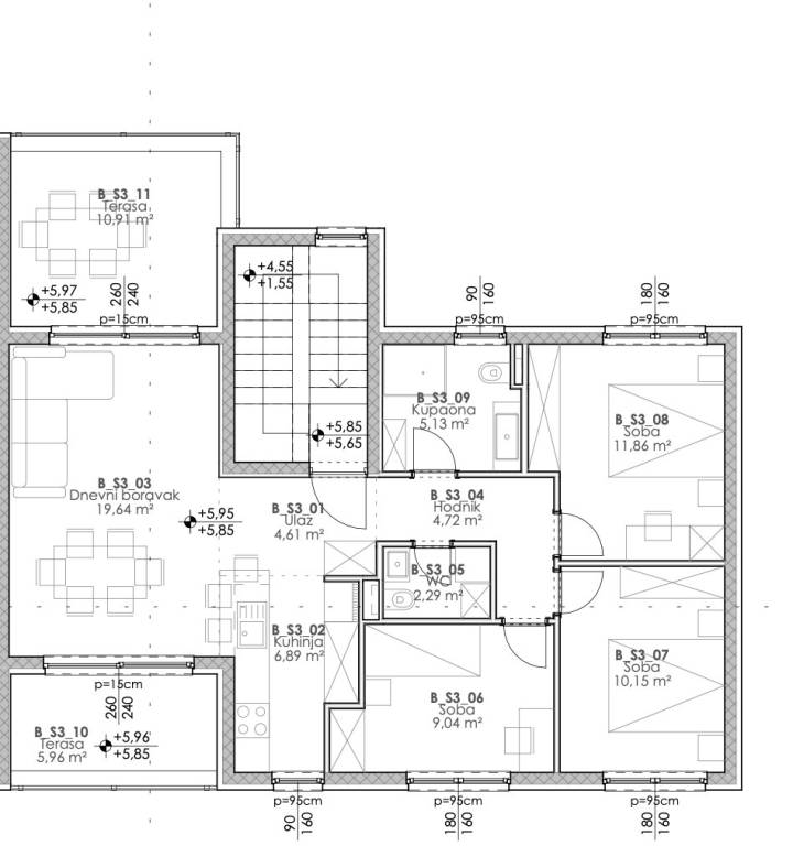 Solin, Mravinci, na mirnoj lokaciji idealnoj za obiteljski život , predviđena je izgradnja manjeg stambenog objekta moderne vizure, s funkcionalnim rasporedom stambenih jedinica.Stan S6 - smješten je na drugoj etaži, a u naravni je trosoban stan. Sastoji se od ulaznog hodnika, kupaonice, WC-a, tri spavaće sobe i dnevnog prostora ( kuhinja s blagovaonicom i dnevni boravak ). Pripadaju mu dvije terase površine 5, 96 m2 i 10, 92 m2. Površina zatvorenog stambenog dijela iznosi 74, 33 m2, dok je ukupna 84, 25 m2.Obavezna je kupnja garažnog ili vanjskog parkirnog mjesta.Početak gradnje je predviđen u prvoj polovici 2026. godine.Za sva dodatna pitanja, stojimo vam na raspolaganju.... Više na eurovilla.hr, ID: 835161