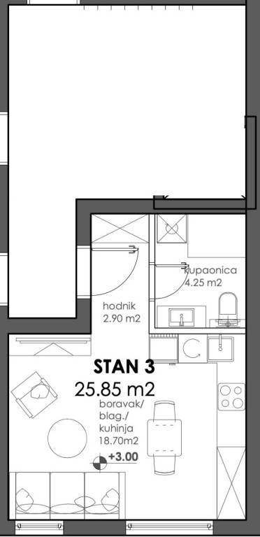 Jednosoban stan površine 25,85 m2 smješte na 1. katu.Sastoji se od hodnika, kupaonice, dnevnog boravka te kuhinje s blagovaonicom.Uz stan je obavezna kupnja i spremišta te parkirnog mjesta.-----Projekt suvremene stambene novogradnje s liftom izvedene u armirano-betonskoj konstrukciji s monolitnim međukatnim pločama. Pregradni zidovi izrađeni su po Knauf sustavu s ispunom od mineralne vune, a zidovi između stanova dodatno su toplinski i zvučno izolirani. Objekt je projektiran s ravnim, neprohodnim krovom u višeslojnoj izvedbi te ETICS fasadom s mineralnom vunom i stiroporom debljine 15 cm i završnim slojem silikatne žbuke.Vanjska PVC stolarija opremljena je toplinski izoliranim roletama na elektromotorni pogon, kliznim stijenama i komarnicima na svim otvorima. Unutarnja stolarija izrađena je od drva, sa zvučno izoliranim vratima, dok su ulazna vrata protuprovalna, protupožarna i zvučno izolirana.Zajednički dijelovi zgrade uključuju ulaz i stubišta obložena granitom, videonadzor, te posebno brojilo plina, vode i struje za svaki stan s mogućnošću daljinskog očitanja. U okolišu su predviđeni asfaltirani i betonski kolni prilazi, hortikulturno uređene zelene površine, dekorativna rasvjeta i odvojeni prostor za spremanje otpada.Stanovi imaju visinu prostorija od od 260 do 270 cm u dnevnim dijelovima i od 250 cm - 260 cm u kupaonicama i hodnicima. Sanitarne prostorije opremljene su kvalitetnim uređajima svjetskih proizvođača poput GROHE i TECE, s fleksibilnom hidroizolacijom, keramikom I. klase te podnim grijanjem. Predviđena je mogućnost odabira između kade ili tuš izvedbe s paravanima od kaljenog stakla. Podovi stanova obloženi su višeslojnim hrastovim parketom, dok su kuhinje, kupaonice i lođe izvedene u keramičkim pločicama.Grijanje i priprema tople vode predviđeni su putem kondenzacijskih plinskih bojlera i podnog grijanja u svim prostorijama, uz termostate u svakoj sobi. Stanovi će biti klimatizirani inverter klima uređajima (multi-split sustav). Ventilacija sanitarnih prostora riješena je niskošumnim ventilatorima, a kuhinje imaju predviđene odsisne sustave.Elektroinstalacije uključuju videoportafon u boji, LED rasvjetu, informatičku mrežu cat 6, utičnice za TV i internet u svakoj sobi te rolete na elektromotorni pogon. Sve kupaonice imaju dodatne priključke i rasvjetu prilagođenu modernom standardu.Investitor daje jamstvo na konstrukciju i hidroizolaciju od 10 godina, na ostale radove 2 godine, a na opremu i uređaje prema jamstvu proizvođača. Posebna pažnja posvećena je odabiru materijala i izvedbi, pri čemu su korišteni isključivo kvalitetni i provjereni sustavi, čime je osigurana trajnost i visoki standard stanovanja.... Više na eurovilla.hr, ID: 948174