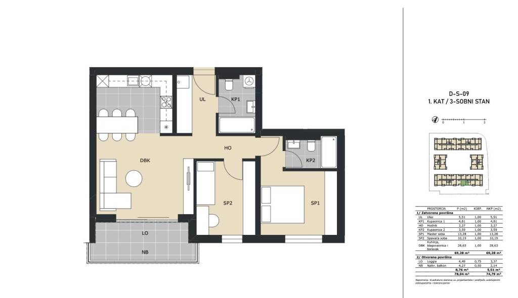 Dvosoban stan na 1. katu stambene zgrade zatvorene površine 69,28 m2 s loggijom 4,49 m2 (3,37 m2) te natkrivenim balkonom 4,27 m2 (2,14 m2), ukupne neto površine 74,79 m2.Stan D-9 sastoji se od ulaznog hodnika, 2 kupaonice, 2 spavaće sobe, kuhinje s blagovaonicom te dnevnog boravka.Obvezna kupnja spremišta, vanjskog ili garažnog parkirnog mjesta.Stan se nalazi u višestambenoj zgradi unutar kompleksa koji će se sastojati od 165 stambenih jedinica.Green Side Residence nalazi se u Velikoj Gorici, samo 10 kilometara od Zagreba i tek 3 kilometra od Međunarodne zračne luke Zagreb, lokacija nudi izvrsnu prometnu povezanost s glavnim gradom i cijelom Hrvatskom, zahvaljujući neposrednom pristupu dvjema autocestama.Okružen zelenilom, a opet u blizini svih gradskih sadržaja, ovaj projekt predstavlja idealan izbor za miran, ali povezan život.Useljenje 11/2027. godine.Za sve ostale informacije stojimo na raspolaganju.... Više na eurovilla.hr, ID: 959659