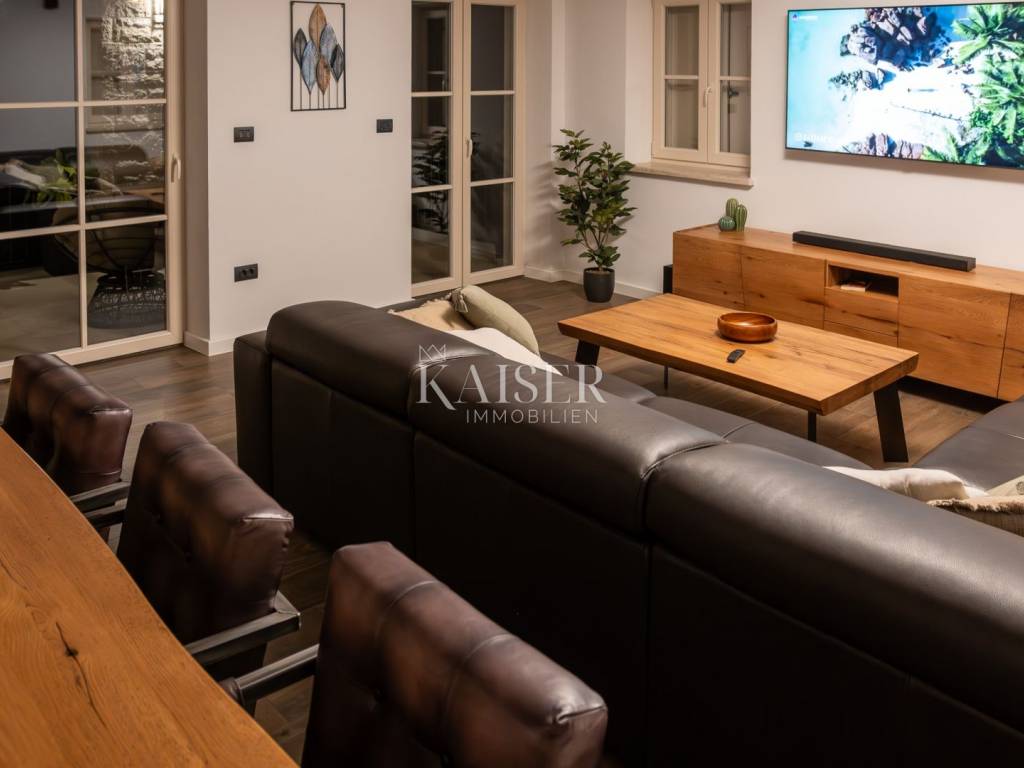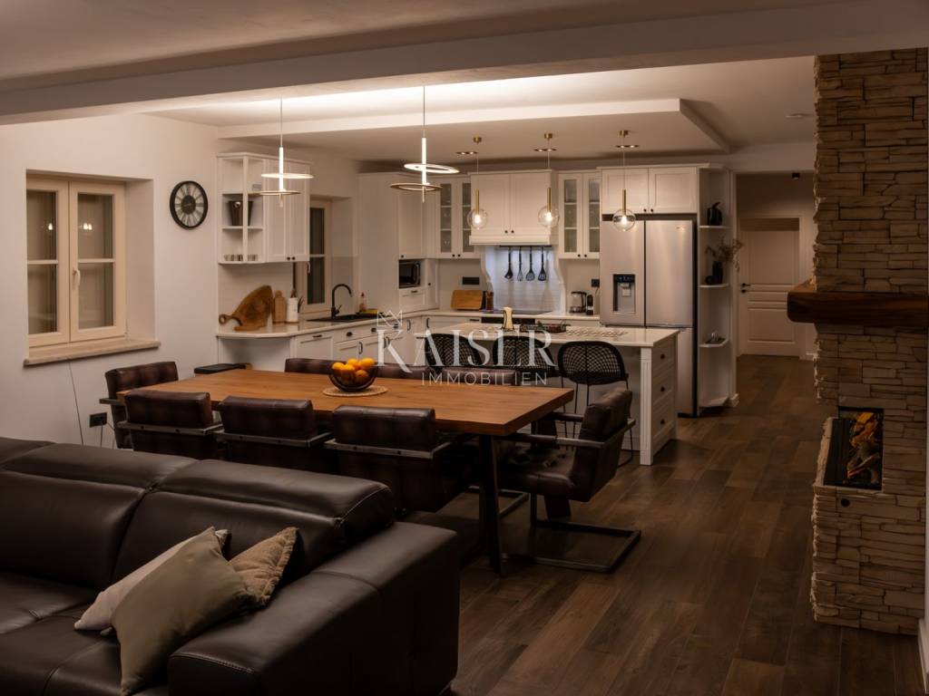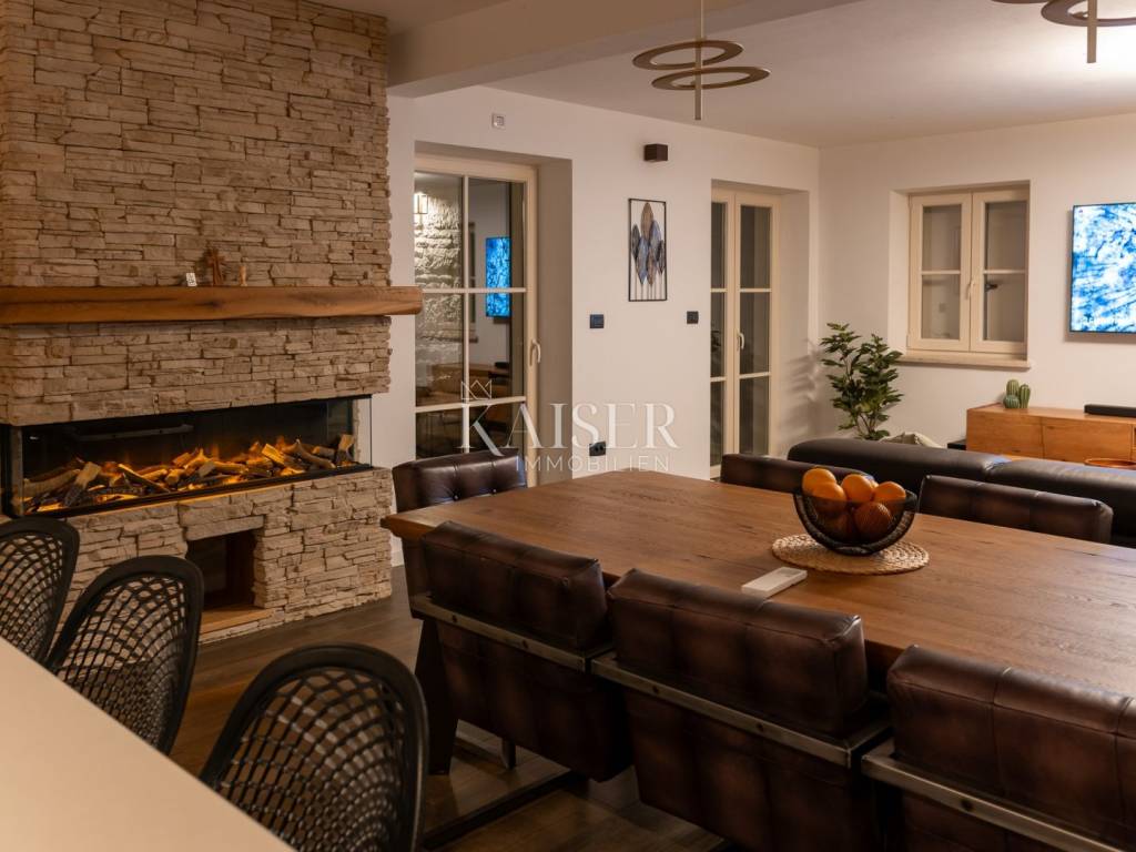 Das Interieur der Villa wurde bis ins kleinste Detail sorgfältig gestaltet. Rustikale Möbel, natürliche Materialien, Stein und Holz schaffen ein harmonisches Ambiente mit Charakter und Seele. Jeder Raum strahlt behagliche Wärme aus und bietet gleichzeitig hohen Komfort und Funktionalität.