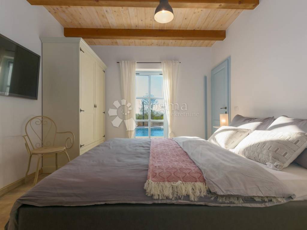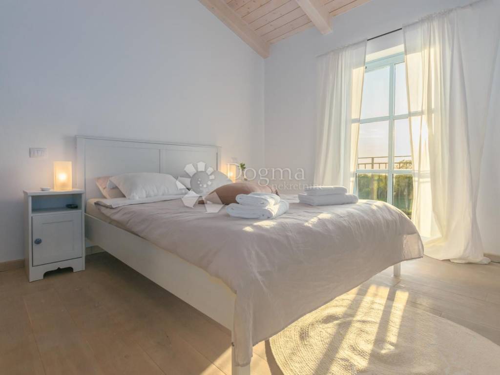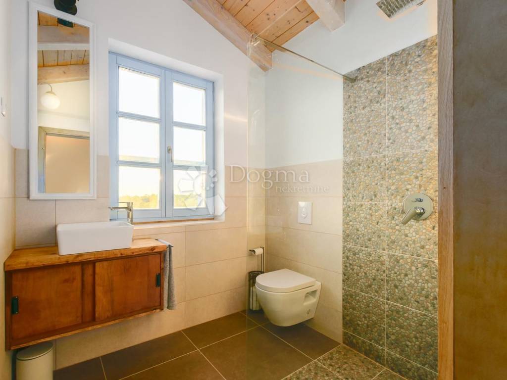 Im Obergeschoss befinden sich drei Schlafzimmer, jeweils mit eigenem Badezimmer, was höchsten Wohnkomfort garantiert. Die Balkone bieten einen beruhigenden Blick auf die istrischen Wiesen und die umliegende Natur.