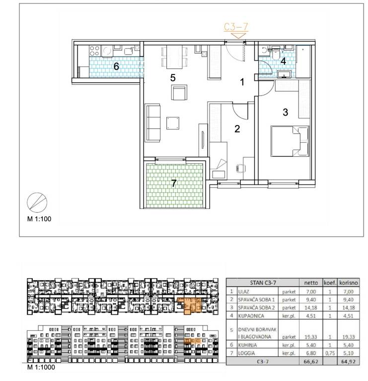 Trosoban stan površine 64,92 m2 smješten na 3. katu.Stan C3-7 sastoji se od ulaza, 2 spavaće sobe, kupaonice, dnevnog boravka, kuhinje s blagovaonicom, loggije.Velika Gorica, projekt stambene novogradnje namijenjen stalnom stanovanju, koji obuhvaća 91 stambenu jedinicu. U sklopu zgrade osigurano je ukupno 182 garažnih i parkirnih mjesta, od čega je 28 garažnih mjesta smješteno u prizemlju, 97 garažnih i parkirnih mjesta u podzemnoj etaži te dodatnih 57 parkirnih mjesta na razini terena.Uz kupnju stana obavezna je kupnja garažnog mjesta na -1 etaži po cijeni od 25.000,00 EUR ili garažnog mjesta na 0 etaži po cijeni od 30.000,00 EUR zajedno s parkirnim garažnim mjestom po cijeni od 18.000,00 EUR ili vanjskim parkirnim mjestom po cijeni od 10.000,00 EUR. Dakle, garažno mjesto na -1 etaži ili garažno mjesto na 0 etaži + garažno parkirno mjesto ili vanjsko parkirno mjesto.Građevina je projektirana kao armiranobetonska konstrukcija, međusobno povezana zidovima i gredama, s punim armiranobetonskim stropnim pločama i ravnim krovom. Vertikalni konstruktivni sustav čine armiranobetonski zidovi debljine 20 cm izvedeni kroz sve etaže, dok horizontalni sustav čine armiranobetonske ploče debljine 20 cm.Pročelje je predviđeno s toplinskom izolacijom debljine 15 cm u ETICS sustavu, izvedenom od EPS-a, a u zonama požarnih prekida, u kontaktu sa stubištem i na podgledu prizemlja od mineralne vune iste debljine. Završna obrada izvodi se armiranom mrežicom, gletanjem i završnim slojem u boji i teksturi prema projektu. Vanjska stolarija predviđena je kao PVC, u tonu definiranom projektom.Krov je projektiran kao ravni neprohodni krov, a svi slojevi izvedeni su u skladu s projektom fizike zgrade. Unutarnji pregradni zidovi izvode se kao gipskartonski, debljine 10 do 20 cm, ovisno o namjeni prostora, uz primjenu potrebne zvučne izolacije gdje je to predviđeno. Zidne površine su završno obrađene soboslikarskim radovima u boji prema projektu.Podovi u stanovima izvode se kao plivajući sustav s toplinskom izolacijom od polistirena i cementnim estrihom. Završne podne obloge predviđene su prema namjeni prostora: keramika u sanitarijama, kuhinjama i na vanjskim površinama, a troslojni hrastov parket u dnevnim boravcima, blagovaonicama, ulaznim prostorima i spavaćim sobama. U ponudi su tri varijante keramičkih pločica.Grijanje je riješeno plinskim etažnim podnim sustavom. Stanovi su opremljeni klima uređajima marke Bosch, PVC stolarijom s električnim roletama, troslojnim hrastovim parketom te sobnim vratima proizvođača RV Križevci. Ulazna vrata u stanove su protuprovalna, proizvođača Kolnoa sa sustavom zaključavanja Multilock.Useljenje 05/27Za sva pitanja Vam stojimo na raspolaganju.... Više na eurovilla.hr, ID: 914824