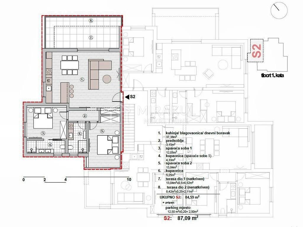 Sie besteht aus Esszimmer, Küche, Wohnzimmer, Flur, zwei Schlafzimmern, zwei Badezimmern sowie überdachten und offenen Terrassen.