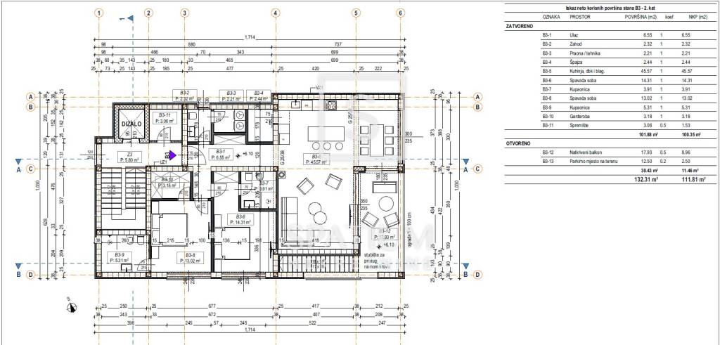 LOVRAN bietet ein Penthouse mit zwei Schlafzimmern und privater Dachterrasse in einem Neubau mit Gemeinschaftspool. Die Wohnung erstreckt sich über die gesamte Etage und besticht durch einen optimalen Grundriss. Im Eingangsbereich ist Platz für einen Einbauschrank. Auf der Nordseite befinden sich ein Gäste-WC und ein Technikraum mit Waschküche. Auf der gegenüberliegenden Südseite liegen zwei Schlafzimmer mit jeweils eigenem Bad, was für hohen Wohnkomfort sorgt. Die 13 bis 14 Quadratmeter großen Schlafzimmer sind dank ihrer Südausrichtung und der großen Glasflächen lichtdurchflutet. Das Hauptschlafzimmer verfügt zusätzlich über einen separaten Kleiderschrank. Am Ende des Eingangsbereichs befindet sich der 45 Quadratmeter große Wohnbereich, der Küche, Esszimmer und Wohnzimmer vereint und Zugang zu einem überdachten Balkon mit Meerblick bietet.