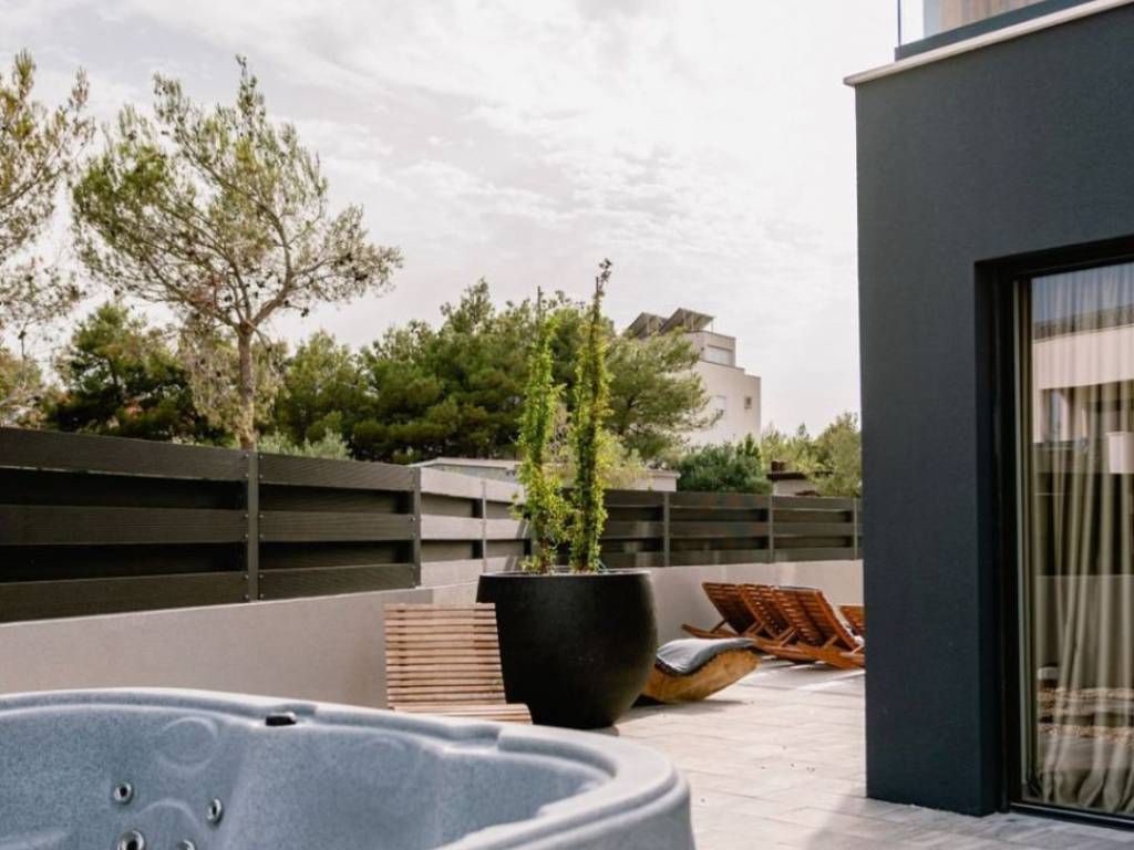 Im Erdgeschoss, im eingezäunten Garten , gibt es einen Whirpool, einen Schwimmingpool und Gartenmöbel.